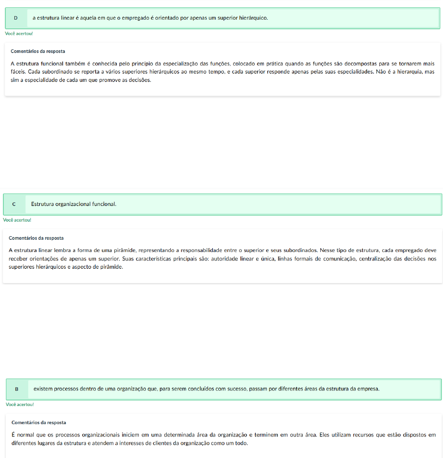 Gestão Organizacional - Gestão por Processo e Qualidade Processos e Estrutura Organizacional Questão 1 Sobre os tipos de estruturas organizacionais, podemos afirmar que: Questão 2 Autoridade funcional ou dividida, linhas diretas de comunicação, descentralização das decisões e ênfase na especialização são características de qual tipo de estrutura organizacional? Questão 3 Os processos podem ser considerados elementos de integração da organização. Com relação a essa afirmação, é correto dizer que: Questão 4 Quanto ao tema estrutura organizacional, marque a alternativa correta. Questão 5 Marque a alternativa correta em relação aos processos organizacionais. Modelagem de Processos Questão 1 Uma representação total ou parcial de um elemento, conjunto ou sistema físico e real, que pode ser utilizada para descrever, testar ou predizer o comportamento do sistema físico em situações específicas. Tal definição se refere à(ao): Questão 2 Com esta representação simplificada da realidade (o modelo), é possível suportar o estudo da atual situação (conhecida como _______), analisá-la, redesenhá-la, medir seu desempenho e prover as transformações necessárias para sua melhoria, levando a novos patamares de desempenho dos processos (conhecido como _______) e, por conseguinte, das organizações (ABPMP, 201. Assinale a alternativa que indica corretamente como as lacunas devem ser preenchidas: Questão 3 No que tange aos conceitos de gestão de processos e gestão por processos, é correto o que se afirmar em: Questão 4 Na função perda, desenvolvida por Genichi Taguchi (1924-201 e mostrada na figura a seguir, é correto afirmar que: Questão 5 O símbolo que representa o envio de mensagem intermediária, de acordo com o BPMN, é: Gestão de processos de qualidade Questão 1 A gestão da qualidade surgiu em meados da década de 1950, quando o mundo sentiu a necessidade da melhora de seus elementos em todos os âmbitos. Com o passar dos anos, as produções em massa vieram, e as indústrias cresceram e perceberam o nível de exigência dos consumidores aumentar. Por isso, houve uma reorientação das organizações com fundamento na resolução dos problemas e na busca da perfeição. Com relação à gestão da qualidade, assinale a alternativa correta: Questão 2 O gerenciamento de processos vem se tornando uma atividade cada vez mais complexa, à medida que as necessidades das organizações vêm se tornando cada vez mais críticas, exigindo maior conhecimento por parte dos gestores de projetos e maior controle aplicável aos resultados alcançados em cada uma das etapas de um processo, gerando a necessidade de conhecimentos específicos em novas tecnologias de controle e em novas metodologias para o acompanhamento dos resultados alcançados em cada uma das etapas de um processo, novas habilidades para a tomada de decisões baseadas em apontamentos de resultados alcançados, bem como técnicas para a melhoria contínua de processos com o aprendizado dos obstáculos e dos erros conhecidos, encontrados durante todo o processo de gestão de um processo. A respeito da gestão da qualidade e dos processos, é correto afirmar: Questão 3 As ferramentas da qualidade são métodos utilizados com o objetivo de verificar, avaliar e apresentar soluções para os problemas que afetam o desempenho dos processos de trabalho. A respeito do ciclo PDCA, assinale a alternativa correta: Questão 4 O diagrama de causa e efeito, também chamado de diagrama de espinha de peixe ou diagrama de Ishikawa, foi desenvolvido em 1943 pelo Dr. Karou Ishikawa, um engenheiro químico da Tokyo University. A respeito desse diagrama, assinale a alternativa correta: Questão 5 O 5W2H é um documento de forma organizada que identifica as ações e as responsabilidades de quem as executará, por meio de um questionamento, capaz de orientar as diversas ações que deverão ser implementadas. Ele deve ser estruturado para permitir uma rápida identificação dos elementos necessários à implantação do projeto. Sobre a ferramenta 5W2H, assinale a alternativa correta: Planejamento e controle econômico financeiro Questão 1 Um planejamento financeiro bem elaborado permite uma tomada de decisões assertiva, possibilitando que a empresa atinja os seus objetivos de maneira eficiente, ao passo que o termo "financeiro" está relacionado com as finanças, ou seja, é relativo à circulação e à gestão dos recursos monetários. Dessa forma, o planejamento financeiro permite avaliar os resultados obtidos e estabelecer o que precisa ser feito para atingir os resultados que ainda não foram alcançados, dividindo-se em curto e longo prazo. Analise as alternativas a seguir e marque a correta. Questão 2 A elaboração do fluxo de caixa permite ao gestor financeiro ter melhor entendimento sobre as questões de entradas e saídas que envolvem o caixa da empresa, possibilitando antecipar a necessidade de caixa e as sobras de caixa. Dessa forma, o fluxo de caixa se torna uma ferramenta essencial para o planejamento financeiro e a tomada de decisões estratégicas. Diante disso, analise as alternativas e marque a resposta correta. Questão 3 O demonstrativo do fluxo de caixa é um instrumento fundamental utilizado no planejamento financeiro da empresa. Ele fornece uma visão clara e detalhada das entradas e das saídas de recursos financeiros ao longo de determinado período de tempo. Com base nessas informações, os gestores financeiros podem tomar decisões estratégicas, como antecipar necessidades de caixa, identificar áreas de maior impacto financeiro e planejar investimentos futuros. Nesse sentido, quando a empresa realiza “recebimentos de caixa resultantes da venda de ativo imobilizado, intangíveis e outros ativos de longo prazo”, esse exemplo refere-se ao fluxo de caixa: Questão 4 O planejamento e o controle econômico-financeiro são fundamentais para o sucesso da gestão de uma empresa. 