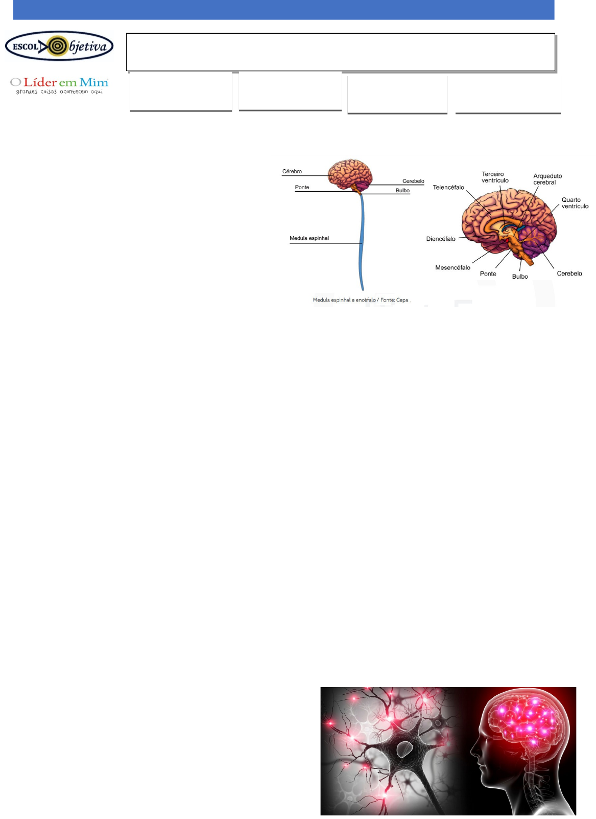 _________ CIÊNCIAS Nome: ___________________________________________________________________ 6º ano ____ REVISAO DA PROVA - UNIDADE IV ___/___/2024 REVISAO DE CIÊNCIAS - UNIDADE IV 1) Analise as alternativas a seguir e marque aquela que NÃO descreve uma função do sistema nervoso. a) captar e interpretar estímulos do ambiente. b) transportar informações. c) criar respostas por meio de movimentos, sensações ou constatações. d) transportar de nutrientes e oxigênio para o corpo. e) controlar a atividade dos músculos. 2) O sistema nervoso é dividido entre sistema nervoso central (SNC) e sistema nervoso periférico (SNP). Assinale a alternativa que contém os órgãos que fazem parte desses sistemas. a) SNC: encéfalo e medula espinhal; SNP: nervos e gânglios nervosos. b) SNC: cérebro e neurotransmissores SNP: tronco encefálico e raízes dorsais. c) SNC: nervos e gânglios nervosos; SNP: encéfalo e medula espinhal. d) SNC: cérebro e cerebelo; SNP: diencéfalo e medula espinhal. e) SNC: cérebro e cerebelo; SNP células nervosas e neurotransmissores. 3) (Uece/1999) São células MAIS DIFERENCIADAS e com MENOR capacidade de reprodução: a) neurônios. b) epiteliais de revestimento. c) hepatócitos. d) fibroblastos. e) osteoclastos 4) (Fuvest) Qual dos seguintes comportamentos envolve maior número de órgãos do sistema nervoso? a) Salivar ao sentir o aroma de comida gostosa. b) Levantar a perna quando o médico toca com martelo no joelho do paciente. c) Piscar com a aproximação brusca de um objeto. d) Retirar bruscamente a mão ao tocar um objeto muito quente. e) Preencher uma ficha de identificação. 5) (Vunesp) Imagine as seguintes situações: 1- Você vai tomar uma injeção e fica com o braço distendido, recebendo a picada da agulha sem nenhuma reação. 2- Você estava distraído e alguém picou-lhe o braço com um alfinete; a reação foi um salto. Os órgãos do sistema nervoso que controlaram a primeira e a segunda reação foram, respectivamente: a) medula e cérebro. b) cerebelo, córtex e gânglios c) medula e hipotálamo. d) encéfalo, medula e nervos e) cérebro e neurônio. 6) (CESGRANRIO) É comum ouvir expressões como: “Meu coração disparou”, “Fiquei tão nervoso que comecei a suar”, “Senti a boca seca”. Estas reações são características de um estado emocional alterado, e são controladas sob a ação do(s): a) sistema nervoso autônomo. b) sistema nervoso somático. c) hormônios da tireoide. d) nervos do cerebelo. e) centro nervoso medular. 7) (Fatec/2005) Uma dona de casa encostou a mão num ferro quente e reagiu imediatamente por meio de um ato reflexo. Nessa ação, o neurônio efetuador levou o impulso nervoso para: a) o encéfalo. b) a medula espinhal. c) os receptores de dor da mão. d) os receptores de calor da mão. e) os músculos flexores do antebraço. 8) (PUC-RJ/2005) Os sistemas celulares do corpo dos heterotróficos pluricelulares (animais) dispõem de dois sistemas de sinalização para integração dos sistemas corporais. São eles: a) sistema circulatório e respiratório. b) sistema circulatório e excretor. c) sistema nervoso e hormonal. d) sistema respiratório e nervoso. e) sistema locomotor e hormonal. 9) (UFSM) Pode-se dizer que o acúmulo de mercúrio afeta a sobrevivência e o funcionamento dos ______. Tanto a transmissão do impulso nervoso, que ocorre sempre dos ______ para os ______ quanto a liberação de neurotransmissores são prejudicadas. Indique a alternativa que completa corretamente as lacunas: a) dendritos — neurônios — axônios b) axônios — dendritos — neurônios c) neurônios — dendritos — axônios d) axônios — neurônios — dendritos e) neurônios — axônios — dendritos 10) Quando há invasão de agentes patogênicos ao corpo humano as células de defesa, os glóbulos brancos, iniciam sua atividade de combate. Essa ação faz aumentar os agentes inflamatórios "do bem", as prostaglandinas. Ao atingir o encéfalo, esses agentes promovem o aumento da temperatura corporal, processo conhecido popularmenente como febre. Qual é a região responsável pelo aumento da temperatura do corpo? a) Hipófise b) Hipotálamo c) Ponte d) Bulbo e) Cerebelo 11) Imagine que você está na escola, e sente um cheirinho gostoso de comida vindo do refeitório. Imediatamente, sua boca ‘se enche d’água’... Sobre essa sensação, podemos dizer que, ao perceber o cheirinho que vem da cozinha, (A) o nariz envia à boca o comando de que seja produzida mais saliva. (B) a língua interpreta que o alimento já está chegando, e a boca se enche de saliva. (C) o organismo conclui que a comida será carne ensopada. Então, sua boca diminui a produção de saliva. (D) os impulsos nervosos informam o cérebro, e o cérebro envia mensagens para que a produção de saliva aumente 12) A figura abaixo mostra as reações do organismo de um homem quando vê uma cobra! Marque a opção que explica essas reações, de acordo com a ilustração. Ao ver a cobra, (A) o corpo do homem produz impulsos nervosos que o cérebro interpreta como informação de perigo no ambiente. (B) os olhos do homem interpretam a situação de perigo, dando a ele o comando para fugir. (C) o homem fica imóvel, procurando raciocinar para encontrar uma forma de sair dessa situação. (D) o corpo do homem produz impulsosnervosos, que os músculos interpretam como informação de perigo no ambiente 13) Complete com as palavras do quadro: IVOLUNTÁRIAS- MEDULA ESPINHAL - ENCÉFALO - CEREBELO - CÉREBRO - BULBO A- A _________________________ está situada no interior da coluna vertebral. B- O sistema nervoso central é formado pelo______________e pela medula espinhal. C- Os órgãos encontrados no encéfalo são: ________________, ________________ e __________________________. D- O sistema nervoso periférico autônomo comanda as ações _______________ como os batimentos do nosso coração. 14) Complete a imagem abaixo: image1.png imag