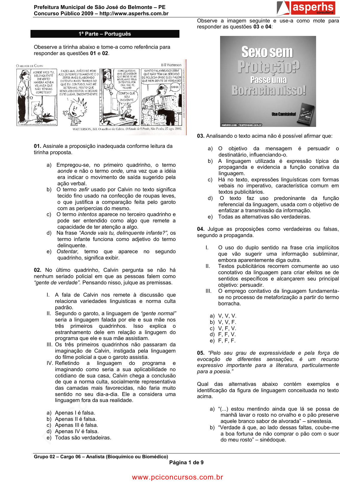 pcimarkpci MDAwMDowMDAwOjAwMDA6MDAwMDowMDAwOmZmZmY6YmZiYjo5OThj:VGh1LCAyNiBEZWMgMjAyNCAxNDoyMzo1OCAtMDMwMA== www.pciconcursos.com.br Prefeitura Municipal de São José do Belmonte – PE Concurso Público 2009 – http://www.asperhs.com.br Grupo 02 – Cargo 06 – Analista (Bioquímico ou Biomédico) Página 1 de 9 1ª Parte – Português Obeserve a tirinha abaixo e tome-a como referência para responder as questões 01 e 02. 01. Assinale a proposição inadequada conforme leitura da tirinha proposta. a) Empregou-se, no primeiro quadrinho, o termo aonde e não o termo onde, uma vez que a idéia era indicar o movimento de saída sugerido pela ação verbal. b) O termo zefir usado por Calvin no texto significa tecido fino usado na confecção de roupas leves, o que justifica a comparação feita pelo garoto com as peripercias do mesmo. c) O termo intentos aparece no terceiro quadrinho e pode ser entendido como algo que remete a capacidade de ter atenção a algo. d) Na frase “Aonde vais tu, delinquente infante?”, os termo infante funciona como adjetivo do termo delinquente. e) Ostentar, termo que aparece no segundo quadrinho, significa exibir. 02. No último quadrinho, Calvin pergunta se não há nenhum seriado policial em que as pessoas falem como “gente de verdade”. Pensando nisso, julque as premissas. I. A fala de Calvin nos remete à discussão que relaciona variedades linguisticas e norma culta padrão. II. Segundo o garoto, a linguagem de “gente normal” seria a linguagem falada por ele e sua mãe nos três primeiros quadrinhos. Isso explica o estranhamento dele em relação a lingugem do programa que ele e sua mãe assistiam. III. Os três primeiros quadrinhos não passaram da imaginação de Calvin, instigada pela linguagem do filme policial a que o garoto assistia. IV. Refletindo a linguagem do programa e imaginando como seria a sua aplicabilidade no cotidiano de sua casa, Calvin chega a conclusão de que a norma culta, socialmente representativa das camadas mais favorecidas, não faria muito sentido no seu dia-a-dia. Ele a considera uma linguagem fora da sua realidade. a) Apenas I é falsa. b) Apenas II é falsa. c) Apenas III é falsa. d) Apenas IV é falsa. e) Todas são verdadeiras. Observe a imagem seguinte e use-a como mote para responder as questões 03 e 04: 03. Analisando o texto acima não é possível afirmar que: a) O objetivo da mensagem é persuadir o destinatário, influenciando-o. b) A linguagem utilizada é expressão típica da propaganda e evidencia a função conativa da linguagem. c) Há no texto, expressões linguísticas com formas vebais no imperativo, característica comum em textos publicitários. d) O texto faz uso predoninante da função referencial da linguagem, usada com o objetivo de enfatizar a transmissão da informação. e) Todas as alternativas são verdadeiras. 04. Julgue as proposições como verdadeiras ou falsas, segundo a propaganda. I. O uso do duplo sentido na frase cria implícitos que vão sugerir uma informação subliminar, embora aparentemente diga outra. II. Textos publicitários recorrem comumente ao uso conotativo da linguagem para criar efeitos se de sentidos específicos e alcançarem seu principal objetivo: persuadir. III. O emprego conitativo da linguagem fundamenta- se no processo de metaforização a partir do termo borracha. a) V, V, V. b) V, V, F. c) V, F, V. d) F, F, V. e) F, F, F. 05. “Pelo seu grau de expressividade e pela força de evocação de diferentes sensações, é um recurso expressivo importante para a literatura, particularmente para a poesia.” Qual das alternativas abaixo contém exemplos e identificação da figura de linguagem conceituada no texto acima. a) “(...) estou mentindo ainda que lá se possa de manhã lavar o rosto no orvalho e o pão preserve aquele branco sabor de alvorada” – sinestesia. b) “Verdade á que, ao lado dessas faltas, coube-me a boa fortuna de não comprar o pão com o suor do meu rosto” – sinédoque. www.pciconcursos.com.br pcimarkpci MDAwMDowMDAwOjAwMDA6MDAwMDowMDAwOmZmZmY6YmZiYjo5OThj:VGh1LCAyNiBEZWMgMjAyNCAxNDoyMzo1OCAtMDMwMA== www.pciconcursos.com.br Prefeitura Municipal de São José do Belmonte – PE Concurso Público 2009 – http://www.asperhs.com.br Grupo 02 – Cargo 06 – Analista (Bioquímico ou Biomédico) Página 2 de 9 c) “(...) Sou um mulato nato No sentido lato Mulato democrático do litoral.” – assonância. d) “Fomos ver o rio. E pouco andamos, porque já estava entrando pelas estrebarias. O marizeiro que ficava embaixo, a correnteza corria por cima dele. Era um mar d’água roncando.” – anacoluto. e) “Vi, claramente visto, o lume vivo Que a marítima gente tem por santo, Em tempo de tormenta e vento esquivo, De tempestade escura e triste pranto.” – pleonasmo. 06. “(...) Uma, duas, três, havia mais de cinco estrelas no céu. A lua estava cercada de um halo cor de leite. Ia chover. Bem. A caatinga ressuscitaria, a semente do gado voltaria ao curral, ele, Fabiano, seria o vaqueiro daquela fazenda morta. Chocalhos de badalos de ossos animariam a solidão. Os meninos, gordos, vermelhos, brincariam no chiqueiro das cabras, Sinhá Vitória vestiria saias de ramagens vistosas. As vacas povoariam o curral. E a caatinga ficaria toda verde.” Ramos, Graciliano. Vidas Secas. Sobre o fragmento de texto acima, assinale a alternativa correta. a) O verbo ressuscitaria refere-se a um fato futuro, que pode ocorrer ou não, relacionado a um fato presente. b) Em “...Sinhá Vitória vestiria saias de ramagens vistosas.”, o verbo está conjugado no futuro do pretérito imperfeito do indicativo. c) A realização dos prognósticos de Fabiano está condicionada à ocorrência efetiva da chuva anunciada pelo halo leitoso que cobre a lua. Isso é percebido no emprego dos verbos no futuro do pretérito. d) Todos os verbos estão conjugados no futuro do presente. e) Todas as alternativas são falsas. 07. Reproduziu-se, a seguir, um 