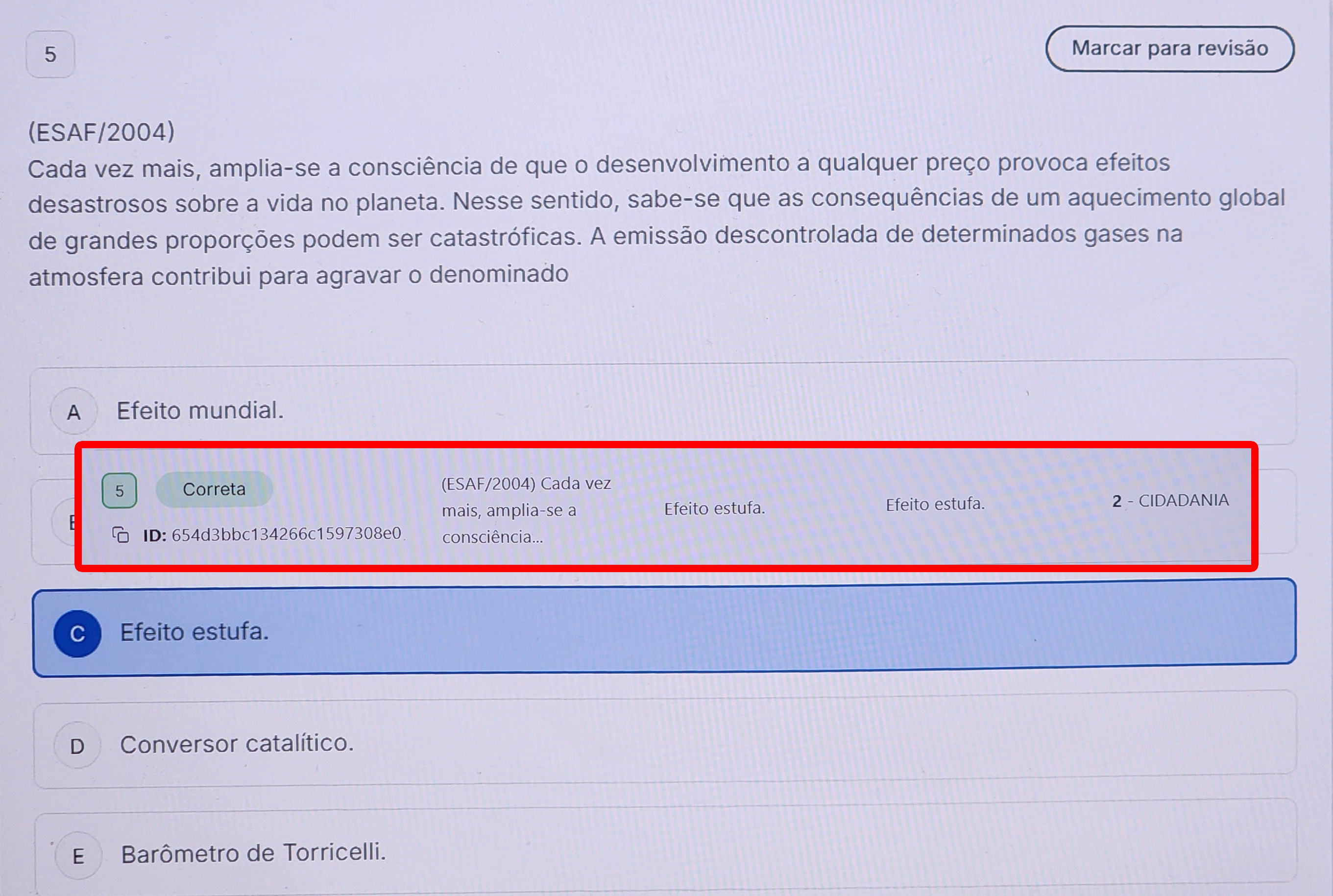 5 Marcar para revisão (ESAF/2004) Cada vez mais, amplia-se a consciência de que o desenvolvimento a qualquer preço provoca efeitos desastrosos sobre a vida no planeta. Nesse sentido, sabe-se que as consequências de um aquecimento global de grandes proporções podem ser catastróficas. A emissão descontrolada de determinados gases na atmosfera contribui para agravar denominado A Efeito mundial. 5 Correta (ESAF/2004) Cada vez mais, amplia-se a Efeito estufa. Efeito estufa. 2 - CIDADANIA ID: 654d3bbc134266c1597308e0 consciência... C Efeito estufa. D Conversor catalítico. E Barômetro de Torricelli.