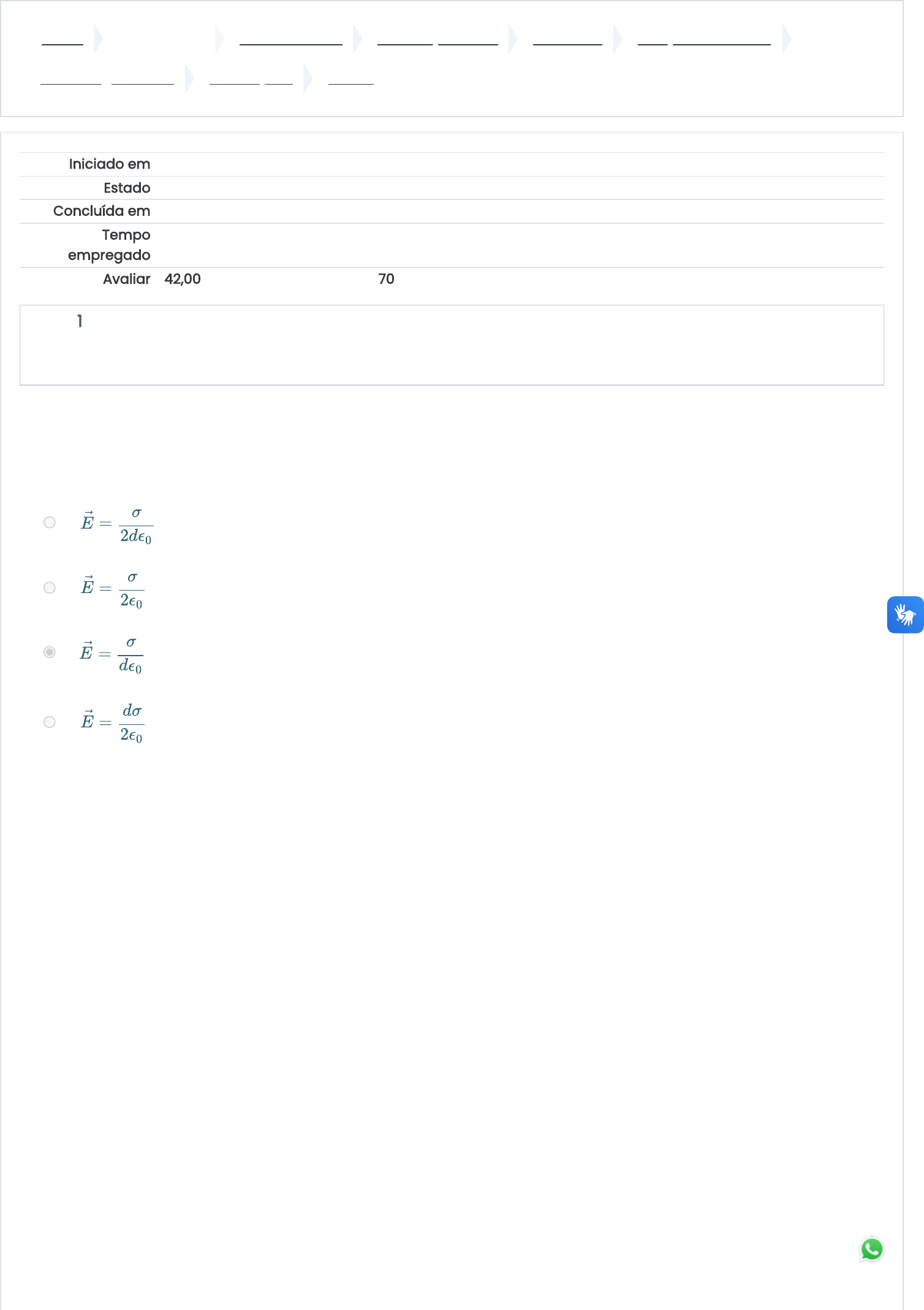 19/02/2024, 12:35 PROVA https://ava.funec.br/mod/quiz/review.php?attempt=567511&cmid=16216 1/11 Painel Meus cursos CURSOS FUNEC Graduação - EAD Aluno EAD JUNÇÕES DE TURMA Eletromagnetismo I AVALIAÇÕES PROVA Iniciado em Monday, 19 Feb 2024, 11:36 Estado Finalizada Concluída em Monday, 19 Feb 2024, 12:34 Tempo empregado 58 minutos 10 segundos Avaliar 42,00 de um máximo de 60,00(70%) Questão 1 Completo Atingiu 0,00 de 3,00 Sobre uma placa infinita é depositada uma quantidade de carga σ, que se distribui uniformemente sobre toda sua superfície. O campo elétrico gerado a uma distância d da placa é: Escolha uma opção: a. b. c. d. =E ⃗ σ 2dϵ0 =E ⃗ σ 2ϵ0 =E ⃗ σ dϵ0 =E ⃗ dσ 2ϵ0 https://ava.funec.br/my/ https://ava.funec.br/course/index.php?categoryid=10 https://ava.funec.br/course/index.php?categoryid=17 https://ava.funec.br/course/index.php?categoryid=19 https://ava.funec.br/course/index.php?categoryid=77 https://ava.funec.br/course/view.php?id=957 https://ava.funec.br/course/view.php?id=957#section-6 https://ava.funec.br/mod/quiz/view.php?id=16216 19/02/2024, 12:35 PROVA https://ava.funec.br/mod/quiz/review.php?attempt=567511&cmid=16216 2/11 Questão 2 Completo Atingiu 3,00 de 3,00 Questão 3 Completo Atingiu 0,00 de 3,00 Duas cargas q e q iguais são colocadas em vértices opostos de um retângulo A, B, C e D de lado menor igual a d e lado maior igual a 2d, como mostra a figura. O campo elétrico gerado por essa configuração de carga no ponto D é: Escolha uma opção: a. b. c. d. 1 2 + 1 4 q 4πϵ0d 2 x̂ q 4πϵ0d 2 ŷ + 1 4 q 4πϵ0d 2 x̂ 1 4 q 4πϵ0d 2 ŷ + q 4πϵ0d 2 x̂ q 4πϵ0d 2 ŷ + q 4πϵ0d 2 x̂ 1 4 q 4πϵ0d 2 ŷ Uma casca esférica de raio a possui densidade superficial de carga uniformemente distribuída sobre sua superfície. O fluxo de campo sobre uma superfície gaussiana de raio a será: Escolha uma opção: a. b. c. d. = E4πΦE a2 =ΦE 1 4πϵ0 q r2 = 4πΦE ϵ0a 2 =ΦE 1 4πϵ0a 2 19/02/2024, 12:35 PROVA https://ava.funec.br/mod/quiz/review.php?attempt=567511&cmid=16216 3/11 Questão 4 Completo Atingiu 3,00 de 3,00 Questão 5 Completo Atingiu 3,00 de 3,00 Questão 6 Completo Atingiu 0,00 de 3,00 Um capacitor ideal de placas paralelas está ligado a uma fonte de 12,0 volts. De repente, por um processo mecânico, cada placa é dobrada sobre si mesma, de modo que a área efetiva do capacitor fica rapidamente reduzida à metade. A fonte é mantida ligada em todos os instantes. Nessa nova situação, pode-se afirmar, em relação àquela inicial, que: Escolha uma opção: a. o campo elétrico dobra e a carga fica reduzida à metade. b. o campo elétrico dobra e a carga acumulada também. c. o campo não muda, mas a carga fica reduzida à metade. d. o campo elétrico e a carga não mudam de valor. Sobre um fio de comprimento 2L foi depositada uma certa quantidade de carga q que se distribuiu uniformemente sobre sua superfície. O campo elétrico gerado por essa configuração de carga a uma altura z acima do ponto médio desse fio é: Escolha uma opção: a. b. c. d. =E ⃗ 2λL 4π z( +ϵ0 z2 L2) 1 2 ẑ =E ⃗ 2λL 4π z( +ϵ0 z2 L2) 3 2 ẑ =E ⃗ 2λ 4π z( +ϵ0 z2 L2) 1 2 ẑ =E ⃗ 2λ 4π z( +ϵ0 z2 L2) 3 2 ẑ O módulo do vetor campo elétrico produzido por uma carga elétrica puntiforme em um ponto P é igual a E. Dobrando- se a distância entre a carga e o ponto P, por meio do afastamento da carga, o módulo do vetor campo elétrico nesse ponto mudo para: Escolha uma opção: a. b. c. d. E 4 2E 4E E 2 19/02/2024, 12:35 PROVA https://ava.funec.br/mod/quiz/review.php?attempt=567511&cmid=16216 4/11 Questão 7 Completo Atingiu 0,00 de 3,00 A figura Representa uma configuração de duas cargas de mesmo módulo e sinais contrários, separadas por uma distância d. O campo elétrico no ponto N que está a uma altura z do centro que une as duas cargas é: Escolha uma opção: a. b. c. d. =E ⃗ 1 4πϵ0 2qd ( + )z2 d2 4 3 2 x̂ = −E ⃗ 1 4πϵ0 2qd ( + )z2 d2 4 3 2 ẑ = −E ⃗ 1 4πϵ0 2qd ( + )z2 d2 4 3 2 x̂ =E ⃗ 1 4πϵ0 2qd ( + )z2 d 2 4 3 2 ẑ 19/02/2024, 12:35 PROVA https://ava.funec.br/mod/quiz/review.php?attempt=567511&cmid=16216 5/11 Questão 8 Completo Atingiu 3,00 de 3,00 Questão 9 Completo Atingiu 3,00 de 3,00 Um elétron com velocidade inicial se move de encontro a um Campo Elétrico Uniforme, conforme a figura. Se desprezarmos a ação da força gravitacional sobre o elétron. A equação que permite localizar o elétron nessa região será: Escolha uma opção: a. b. c. d. v0 → Y = − Eq 2m X V0 Y = Eq 2m X2 V 2 0 Y = Eq m X2 V 2 0 Y = − Eq 2m X2 V 2 0 Quando um elétron se move de A até B, ao longo da linha de campo elétrico como mostrado na figura). O campo elétrico realiza um trabalho de 3,94x10 J. Podemos afirmar que a diferença de potencial entre os pontos C e B é: Escolha uma opção: a. V - V = 0 V b. V - V = - 2,46 V c. V - V = 2,46 V d. V - V = V - V -19 C B C B C B C B C A 19/02/2024, 12:35 PROVA https://ava.funec.br/mod/quiz/review.php?attempt=567511&cmid=16216 6/11 Questão 10 Completo Atingiu 0,00 de 3,00 Questão 11 Completo Atingiu 3,00 de 3,00 Um cilindro metálico de raio a possui densidade de carga ʎ distribuída uniformemente sobre sua superfície. O campo elétrico no exterior do cilindro é: Escolha uma opção: a. b. , por ser um caso de eletrostática c. constante, por ser um caso eletrostático. d. =E ⃗ λ 2π sϵ0 = 0E ⃗ =E ⃗ λ 4π sϵ0 Um estudante coloca uma carga de prova q em um ponto P nas proximidades de uma carga fonte Q. E estabelece as relações de vetores campo elétrico e força elétrica apresentada abaixo. São corretas: Escolha uma opção: a. apenas I, II e III. b. todas as afirmações. c. apenas III e IV. d. apenas II, III e IV. 19/02/2024, 12:35 PROVA https://ava.funec.br/mod/quiz/review.php?attempt=567511&cmid=16216 7/11 Questão 12 Completo Atingiu 3,00 de 3,00 Questão 13 Completo Atingiu 3,00 de 3,00 O potencial elétrico gerado por uma configura