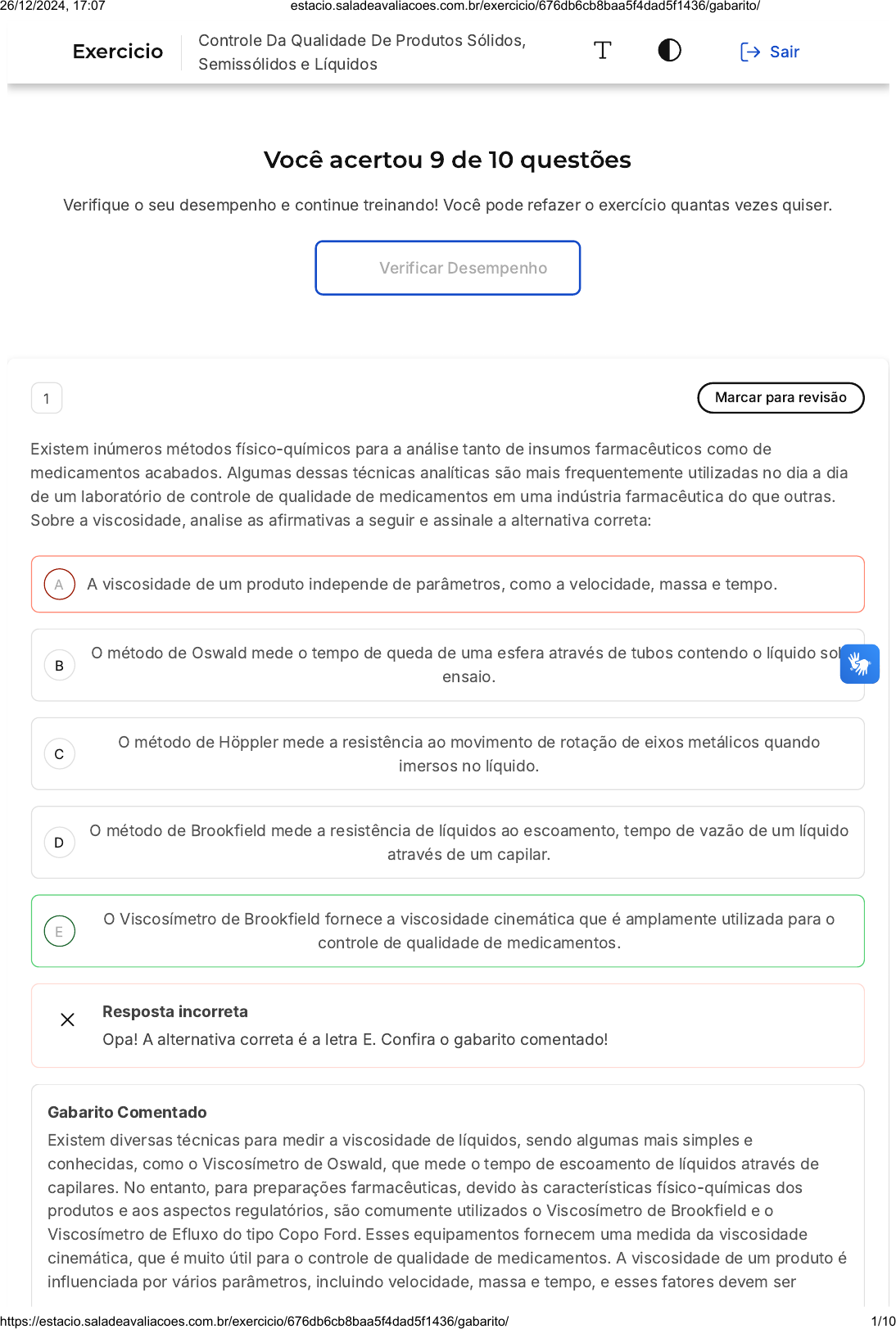 Você acertou 9 de 10 questões Verifique o seu desempenho e continue treinando! Você pode refazer o exercício quantas vezes quiser. Verificar Desempenho A B C D E 1 Marcar para revisão Existem inúmeros métodos físico-químicos para a análise tanto de insumos farmacêuticos como de medicamentos acabados. Algumas dessas técnicas analíticas são mais frequentemente utilizadas no dia a dia de um laboratório de controle de qualidade de medicamentos em uma indústria farmacêutica do que outras. Sobre a viscosidade, analise as afirmativas a seguir e assinale a alternativa correta: A viscosidade de um produto independe de parâmetros, como a velocidade, massa e tempo. O método de Oswald mede o tempo de queda de uma esfera através de tubos contendo o líquido sob ensaio. O método de Höppler mede a resistência ao movimento de rotação de eixos metálicos quando imersos no líquido. O método de Brookfield mede a resistência de líquidos ao escoamento, tempo de vazão de um líquido através de um capilar. O Viscosímetro de Brookfield fornece a viscosidade cinemática que é amplamente utilizada para o controle de qualidade de medicamentos. Resposta incorreta Opa! A alternativa correta é a letra E. Confira o gabarito comentado! Gabarito Comentado Existem diversas técnicas para medir a viscosidade de líquidos, sendo algumas mais simples e conhecidas, como o Viscosímetro de Oswald, que mede o tempo de escoamento de líquidos através de capilares. No entanto, para preparações farmacêuticas, devido às características físico-químicas dos produtos e aos aspectos regulatórios, são comumente utilizados o Viscosímetro de Brookfield e o Viscosímetro de Efluxo do tipo Copo Ford. Esses equipamentos fornecem uma medida da viscosidade cinemática, que é muito útil para o controle de qualidade de medicamentos. A viscosidade de um produto é influenciada por vários parâmetros, incluindo velocidade, massa e tempo, e esses fatores devem ser Exercicio Controle Da Qualidade De Produtos Sólidos, Semissólidos e Líquidos Sair 26/12/2024, 17:07 estacio.saladeavaliacoes.com.br/exercicio/676db6cb8baa5f4dad5f1436/gabarito/ https://estacio.saladeavaliacoes.com.br/exercicio/676db6cb8baa5f4dad5f1436/gabarito/ 1/10 A B C D E considerados ao escolher o equipamento ideal para a medição. O método de Höppler, por exemplo, mede o tempo de queda de uma esfera através de tubos contendo o líquido sob ensaio, enquanto o método de Brookfield avalia a resistência ao movimento de rotação de eixos metálicos quando imersos no líquido. Portanto, a alternativa correta é a E, que afirma que o Viscosímetro de Brookfield fornece a viscosidade cinemática, amplamente utilizada para o controle de qualidade de medicamentos. 2 Marcar para revisão A estabilidade é definida como o tempo durante o qual a especialidade farmacêutica ou mesmo a matéria prima considerada isoladamente mantém, dentro dos limites especificados e durante todo o período de estocagem, transporte e uso, as mesmas características que possuía no momento da sua produção �SOUZA, J.N. Estudo de estabilidade: fatores que influenciam na estabilidade do medicamento, 2014. 40 f. Trabalho de Conclusão de Curso �Especialização) - Instituto de Tecnologia em Fármacos/Farmanguinhos, Fundação Oswaldo Cruz, Rio de Janeiro, 2014�. Sobre o estudo de estabilidade de longa duração analise a relação entre as assertivas a seguir: I. João, responsável pela garantia da qualidade de uma indústria farmacêutica, realizou o pedido de registro definitivo na ANVISA de um medicamento com um novo insumo farmacêutico apresentando os estudos de estabilidade acelerado concluídos, mas sem ter iniciado o estudo de instabilidade de longa duração em andamento. II. Para registros definitivos de medicamentos no Brasil com novo insumo farmacêutico ativo, poderão ser apresentados estudos de estabilidade acelerado concluídos, não sendo obrigatório os estudos de estabilidade forçada e de longa duração. A respeito dessas asserções, assinale a opção correta: As asserções I e II são proposições falsas. A asserção I é uma proposição verdadeira enquanto a II é falsa. As asserções I e II são proposições verdadeiras e a II é uma justificativa da I. A asserção I é uma proposição falsa e a II é uma proposição verdadeira. As asserções I e II são proposições verdadeiras, mas a II não é uma justificativa da I. Resposta correta Parabéns, você selecionou a alternativa correta. Confira o gabarito comentado! Gabarito Comentado Para registros de medicamentos no Brasil com novo insumo farmacêutico ativo, poderão ser apresentados estudos de estabilidade acelerado concluídos, com resultados do estudo de estabilidade de longa duração em andamento de pelo menos 12 meses. Além disso, o prazo de validade só é estabelecido de forma definitiva após os resultados do estudo de estabilidade longa duração. Caso o registro seja feito com estudos de longa duração em andamento, o prazo de validade é provisório, calculado a partir de análises estatísticas dos resultados apresentados. 26/12/2024, 17:07 estacio.saladeavaliacoes.com.br/exercicio/676db6cb8baa5f4dad5f1436/gabarito/ https://estacio.saladeavaliacoes.com.br/exercicio/676db6cb8baa5f4dad5f1436/gabarito/ 2/10 A B C D E 3 Marcar para revisão �Adaptado de FUNED/MG_IBFC/2013� A estabilidade de produtos farmacêuticos depende de fatores ambientais como temperatura, umidade e luz, e de outros relacionados ao produto como as propriedades físicas e químicas de substâncias ativas e excipientes farmacêuticos, forma farmacêutica e sua composição, processo de fabricação e tipo e propriedades dos materiais. Sobre os estudos de estabilidade, analise a relação entre as afirmativas a seguir: I��Uma empresa, após realizar um estudo de estabilidade acelerado, confirmou o prazo de validade e as condições de armazenamento e, assim, conseguiu o regi