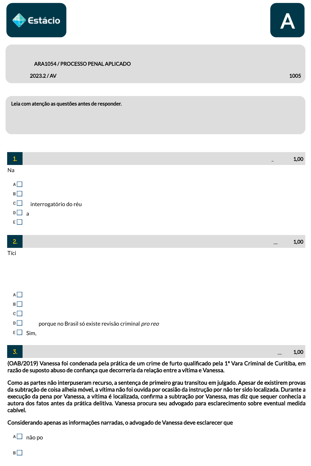 6761725739 A 25/10/2023 14:32 Nome: Matrícula: ________________ Disciplina: ARA1054 / PROCESSO PENAL APLICADO Data: ___ /___ /______ Período: 2023.2 / AV Turma: 1005 Leia com atenção as questões antes de responder. É proibido o uso de equipamentos eletrônicos portáteis e consulta a materiais de qualquer natureza durante a realização da prova. Boa prova. 1. _______ de 1,00 Na audiência do processo comum ordinário, o último ato da instrução criminal é a inquirição das testemunhas da defesa a inquirição das testemunhas da acusação o interrogatório do réu a acareação a tomada de declarações do ofendido 2. _______ de 1,00 Tício foi absolvido com trânsito em julgado do crime de estupro, artigo 213 do Código Penal, praticado contra Ambrosina, mulher com 45 anos de idade. Um ano após o transito em julgado da sentença absolutória aparecem provas do crime destupro praticado por Tício contra Ambrosina. O Ministério Público, inconformado, propôs ação de Revisão Criminal, para desconstituir o trânsito em julgado da sentença absolutória, a �m de obter a condenação de Tício. Agiu corretamente o Ministério Público? Indique o item correto. Cabe ao Ministério Público declarar se uma sentença deve ou não transitar em julgado Sim, porque no Brasil sentença absolutória criminal não transita em julgado Sim, porque no Brasil só existe revisão criminal pro societates Não, porque no Brasil só existe revisão criminal pro reo Sim, porque no Brasil existe a revisão criminal pro reo e pro societates 3. _______ de 1,00 (OAB/2019) Vanessa foi condenada pela prática de um crime de furto quali�cado pela 1ª Vara Criminal de Curitiba, em razão de suposto abuso de con�ança que decorreria da relação entre a vítima e Vanessa. Como as partes não interpuseram recurso, a sentença de primeiro grau transitou em julgado. Apesar de existirem provas da subtração de coisa alheia móvel, a vítima não foi ouvida por ocasião da instrução por não ter sido localizada. Durante a execução da pena por Vanessa, a vítima é localizada, con�rma a subtração por Vanessa, mas diz que sequer conhecia a autora dos fatos antes da prática delitiva. Vanessa procura seu advogado para esclarecimento sobre eventual medida cabível. Considerando apenas as informações narradas, o advogado de Vanessa deve esclarecer que não poderá apresentar revisão criminal em favor da cliente, tendo em vista que a nova prova não é apta a justi�car a absolvição de Vanessa, mas tão só a redução da pena. caberá apresentação de revisão criminal, sendo imprescindível a representação de Vanessa por advogado, devendo a medida ser iniciada perante o próprio juízo da condenação. Igreja Realce Igreja Realce A revisão criminal poderá ser interposta pelo Ministério Público não poderá apresentar revisão criminal, tendo em vista que a pena já está sendo executada, mas poderá ser buscada reparação civil. caberá apresentação de revisão criminal, podendo Vanessa apresentar a ação autônoma independentemente de estar assistida por advogado, ou por meio de procurador legalmente habilitado. 4. _______ de 1,00 Durante instrução probatória em que se imputava a João a prática de um crime de peculato, foram intimados para depor, em audiência de instrução e julgamento, os policiais civis que participaram das investigações, a ex-esposa de João que tinha conhecimento sobre o fato criminoso e o padre para qual João contava o que considerava seus pecados, inclusive sobre os desvios do dinheiro público. Preocupados, todos os intimados para depoimento foram à audiência, acompanhados de seus advogados, demonstrando interesse em não prestarem declarações. Considerando a hipótese apresentada, assinale a alternativa CORRETA: Apenas os advogados da ex-esposa do João e do padre poderão requerer que seus clientes não sejam ouvidos na condição de testemunhas. Apenas o advogado da ex-esposa de João poderá requerer que sua cliente seja eximida do dever de depor, devendo os demais prestar declarações; Nenhum deles poderá se eximir da obrigação de depor, conforme mandamento previsto no artigo 206 do CPP; Todos os advogados poderão requerer que seus clientes sejam eximidos do dever de depor; Apenas o advogado do padre poderá buscar que ele não preste declarações, já que proibido, por ofício, de depor, devendo os demais prestarem declarações; 5. _______ de 1,00 Fabrício, com dolo de matar, realiza vários disparos de arma de fogo em direção a Cristiano. Dois projéteis de arma de fogo atingem o peito da vítima, que vem a falecer. Fabrício foge para não ser preso em flagrante. Os fatos ocorreram no final de uma tarde de domingo, diante de várias testemunhas. O inquérito policial foi instaurado, e Fabrício foi indiciado pelo homicídio de Cristiano. Os autos são remetidos ao Ministério Público, que denuncia Fabrício. O processo tem seu curso regular e as testemunhas confirmam que Fabrício foi o autor do disparo. Após a apresentação dos memoriais, os autos são remetidos para conclusão, a fim de que seja exarada a sentença, sendo certo que o juiz está convencido de que há indícios de autoria em desfavor de Fabrício e prova da materialidade de crime doloso contra a vida. Diante do caso narrado, assinale a alternativa correta acerca da sentença a ser proferida pelo juiz na primeira fase do procedimento do Júri. O juiz deve pronunciar Fabrício, submetendo-o ao plenário do Júri, diante dos indícios de autoria e prova da materialidade, que indicam a prática de crime doloso contra a vida. O juiz deve pronunciar Fabrício, remetendo os autos ao Juízo comum, diante dos indícios de autoria e prova da materialidade, que indicam a prática de crime doloso contra a vida. O juiz deve absolver sumariamente o acusado, uma vez que não seria a hipótese de julgamento perante o plenário do tribunal do júri. O juiz deve impronunci