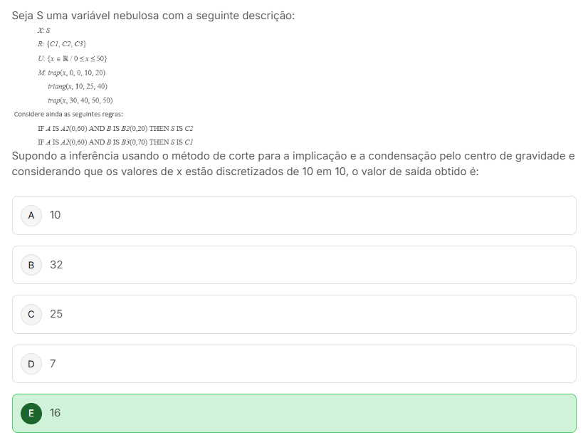 Seja S uma variável nebulosa com a seguinte descrição: 50} 0, 10, 20) 25, 40) trap(x, 30, 40, 50, 50) Considere ainda as seguintes regras: IF AND B IS B2(0,20) THEN SIS C2 IF AIS AND B IS THEN IS Supondo a inferência usando O método de corte para a implicação e a condensação pelo centro de gravidade e considerando que os valores de X estão discretizados de 10 em 10, O valor de saída obtido é: A 10 B 32 C 25 D 7 E 16