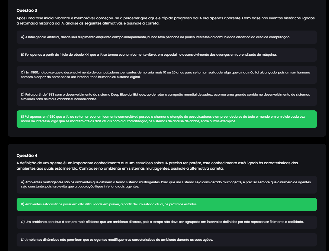 Questão 3 Após uma fase inicial vibrante e memorável, começou-se a perceber que aquele rápido progresso da IA era apenas aparente. Com base nos eventos históricos ligados à retomada histórica da IA, analise as seguintes afirmativas e assinale a correta. A) A Inteligência Artificial, desde seu surgimento enquanto campo independente, nunca teve períodos de pouco interesse da comunidade do de computação. B) apenas a partir do início do século XXI que a IA se tornou em especial no desenvolvimento dos avanços em aprendizado de máquina. c) Em 1960, notou-se que desenvolvimento de computadores pensantes demoraria mais 10 ou 20 anos para se tornar algo que ainda não foi pois um ser humano sempre é capaz de perceber se um interlocutor é humano ou sistema digital. D) Foi a partir de 1993 com O desenvolvimento do sistema Deep Blue da que, ao derrotar campeão mundial de xadrez ocorreu uma grande corrida no desenvolvimento de sistemas similares para as mais variadas funcionalidades E) apenas em 1980 que a ao se tornar passou a chamar a atenção de pesquisadores e empreendedores de todo mundo em um ciclo cada vez maior de interesse, algo que se mantém até os dias atuais com a os sistemas de analise de dados, entre outros exemplos. Questão 4 A definição de um agente é um importante conhecimento que um estudioso sobre IA precisa ter, porém, este conhecimento está ligado às características dos ambientes aos quais está inserido. Com base no ambiente em sistemas multiagentes, assinale a alternativa correta. A) Ambientes multiagentes são os ambientes que definem termo sistema Para que um sistema seja considerado é preciso sempre que número de agentes seja constante, pois isso evita que a população fique inferior a dois agentes B) Ambientes estocásticos possuem alta dificuldade em prever, a partir de um estado atual, os próximos c) Um ambiente contínuo é sempre mais eficiente que um ambiente discreto. pois tempo não deve ser agrupado em intervalos definidos por não representar fielmente a D) Ambientes não permitem que agentes modifiquem as do ambiente durante as suas