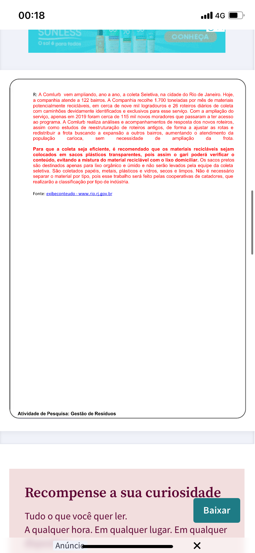 00:18 4G SUNLESS sol para R: A Comlurb vem ampliando, ano a ano, a coleta Seletiva, na cidade do Rio de a companhia atende a 122 A Companhia recolhe 1.700 toneladas por mês de materiais potencialmente recicláveis, em cerca de nove mil logradouros e 26 roteiros diários de coleta com caminhões devidamente identificados e exclusivos para esse Com a ampliação do serviço. apenas em 2019 foram cerca de 115 mil novos moradores que passaram a ter acesso ao programa. A Comlurb realiza análises e acompanhamentos de resposta dos novos roteiros, assim como estudos de reestruturação de roteiros antigos, de forma a ajustar as rotas e redistribuir a frota buscando a expansão a outros aumentando atendimento da população sem necessidade de ampliação da frota. Para que a coleta seja eficiente, é recomendado que os materiais recicláveis sejam colocados em sacos plásticos transparentes, pois assim o gari poderá verificar o conteúdo, evitando a mistura do material reciclável com o lixo domiciliar. Os sacos pretos são destinados apenas para lixo orgânico e úmido e não serão levados pela equipe da coleta seletiva. São coletados papéis, metais, plásticos e vidros. secos e Não é necessário separar o material por tipo, pois esse trabalho será feito pelas cooperativas de catadores, que realizarão a classificação por tipo de Fonte: exibeconteudo - www.rio.rj.gov.br Atividade de Pesquisa: Gestão de Resíduos Recompense a sua curiosidade Baixar Tudo o que você quer ler. A qualquer hora. Em qualquer lugar. Em qualquer X