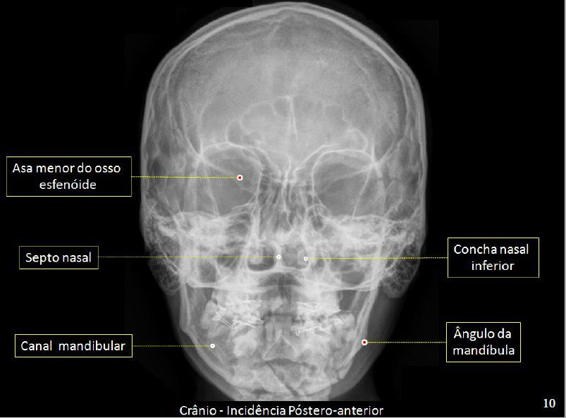 sa menor do osso esfenóide Concha nasal Septo nasal inferior Ângulo da Canal mandibular mandíbula Crânio - Incidência Póstero-anterior
