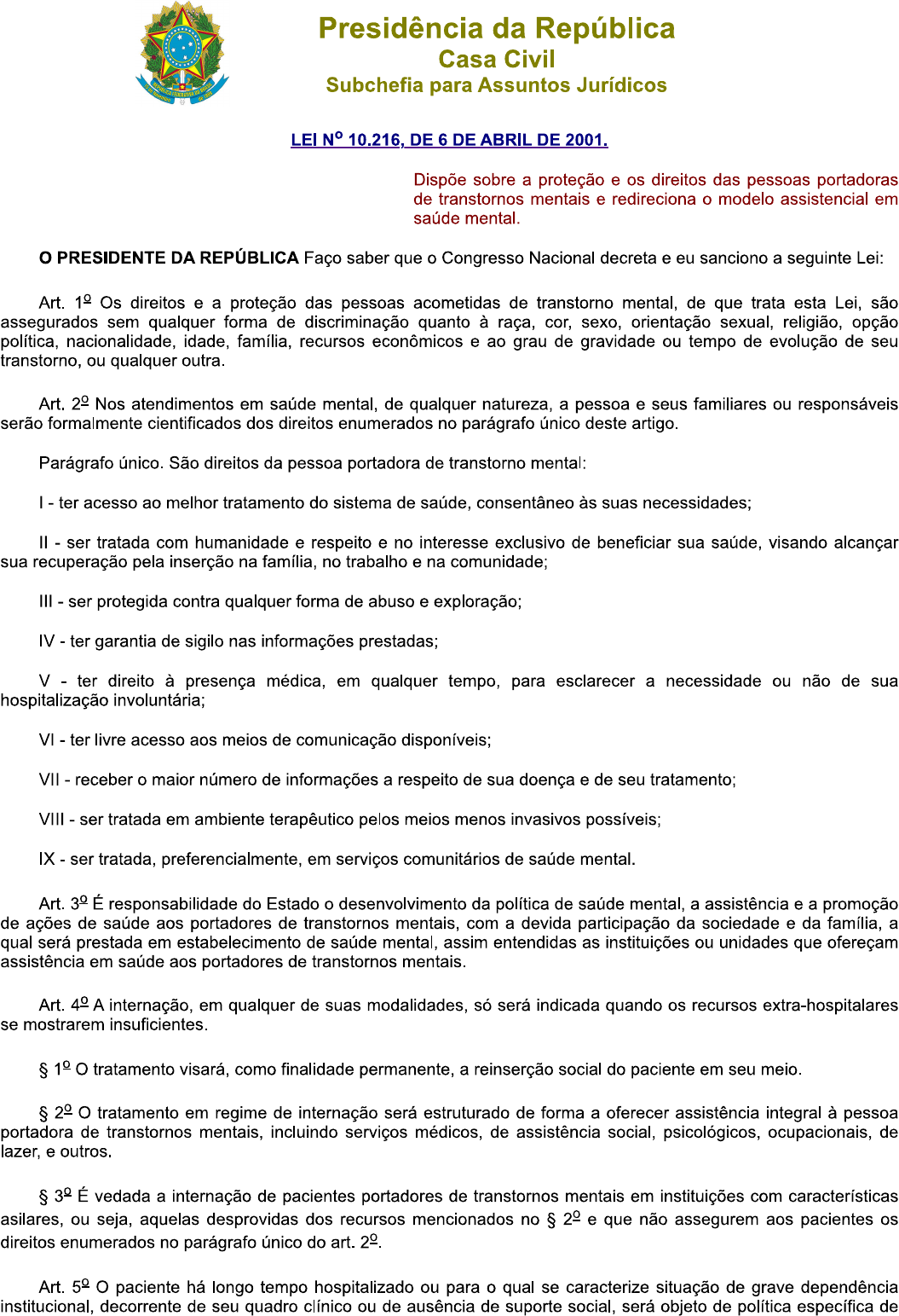 Presidência da República Casa Civil Subchefia para Assuntos Jurídicos LEI 10.216, DE 6 DE ABRIL DE 2001. Dispõe sobre a proteção e os direitos das pessoas portadoras de transtornos mentais e redireciona o modelo assistencial em saúde mental. o PRESIDENTE DA REPUBLICA Faço saber que o Congresso Nacional decreta e eu sanciono a seguinte Lei: Art. 1° Os direitos e a proteção das pessoas acometidas de transtorno mental, de que trata esta Lei, são assegurados sem qualquer forma de discriminação quanto à raça, cor, sexo, orientação sexual, religião, opção política, nacionalidade, idade, família, recursos econômicos e ao grau de gravidade ou tempo de evolução de seu transtorno, ou qualquer outra. Art. Nos atendimentos em saúde mental, de qualquer natureza, a pessoa e seus familiares ou responsáveis serão formalmente cientificados dos direitos enumerados no parágrafo único deste artigo. Parágrafo único São direitos da pessoa portadora de transtorno mental: - ter acesso ao melhor tratamento do sistema de saúde, consentâneo às suas necessidades; - ser tratada com humanidade e respeito e no interesse exclusivo de beneficiar sua saúde, visando alcançar sua recuperação pela inserção na família, no trabalho e na comunidade; III ser protegida contra qualquer forma de abuso e exploração; IV ter garantia de sigilo nas informações prestadas; V - ter direito à presença médica, em qualquer tempo, para esclarecer a necessidade ou não de sua hospitalização involuntária; VI ter livre acesso aos meios de comunicação disponíveis; VII receber o maior número de informações a respeito de sua doença e de seu tratamento; VIII ser tratada em ambiente terapêutico pelos meios menos invasivos possíveis; IX ser tratada, preferencialmente, em serviços comunitários de saúde mental. Art. É responsabilidade do Estado o desenvolvimento da política de saúde mental, a assistência e a promoção de ações de saúde aos portadores de transtornos mentais, com a devida participação da sociedade e da família, a qual será prestada em estabelecimento de saúde mental, assim entendidas as instituições ou unidades que ofereçam assistência em saúde aos portadores de transtornos mentais. Art. A internação, em qualquer de suas modalidades, só será indicada quando os recursos extra-hospitalares se mostrarem insuficientes. § tratamento visará, como finalidade permanente, a reinserção social do paciente em seu meio. § tratamento em regime de internação será estruturado de forma a oferecer assistência integral à pessoa portadora de transtornos mentais, incluindo serviços médicos, de assistência social, psicológicos, ocupacionais, de lazer, e outros. § É vedada a internação de pacientes portadores de transtornos mentais em instituições com características asilares, ou seja, aquelas desprovidas dos recursos mencionados no § e que não assegurem aos pacientes os direitos enumerados no parágrafo único do art. Art. 5° paciente há longo tempo hospitalizado ou para o qual se caracterize situação de grave dependência institucional, decorrente de seu quadro clínico ou de ausência de suporte social, será objeto de política específica dealta planejada e reabilitação psicossocial assistida, sob responsabilidade da autoridade sanitária competente e supervisão de instância a ser definida pelo Poder Executivo, assegurada a continuidade do tratamento, quando necessário. Art. 6° A internação psiquiátrica somente será realizada mediante laudo médico circunstanciado que caracterize os seus motivos. Parágrafo único. São considerados os seguintes tipos de internação psiquiátrica: internação voluntária: aquela que se dá com o consentimento do usuário; internação involuntária: aquela que se dá sem o consentimento do usuário e a pedido de terceiro; e III internação compulsória: aquela determinada pela Justiça. Art. A pessoa que solicita voluntariamente sua internação, ou que a consente, deve assinar, no momento da admissão, uma declaração de que optou por esse regime de tratamento. Parágrafo único. O término da internação voluntária dar-se-á por solicitação escrita do paciente ou por determinação do médico assistente. Art. A internação voluntária ou involuntária somente será autorizada por médico devidamente registrado no Conselho Regional de Medicina CRM do Estado onde se localize o estabelecimento. § 1° A internação psiquiátrica involuntária deverá, no prazo de setenta e duas horas, ser comunicada ao Ministério Público Estadual pelo responsável técnico do estabelecimento no qual tenha ocorrido, devendo esse mesmo procedimento ser adotado quando da respectiva alta. § término da internação involuntária dar-se-á por solicitação escrita do familiar, ou responsável legal ou quando estabelecido pelo especialista responsável pelo tratamento. Art. 9° A internação compulsória é determinada, de acordo com a legislação vigente, pelo juiz competente, que levará em conta as condições de segurança do estabelecimento. quanto à salvaguarda do paciente, dos demais internados e funcionários. Art. 10. Evasão, transferência, acidente, intercorrência clínica grave e falecimento serão comunicados pela direção do estabelecimento de saúde mental aos familiares, ou ao representante legal do paciente, bem como à autoridade sanitária responsável, no prazo máximo de vinte e quatro horas da data da ocorrência. Art. 11. Pesquisas científicas para fins diagnósticos ou terapêuticos não poderão ser realizadas sem o consentimento expresso do paciente, ou de seu representante legal, e sem a devida comunicação aos conselhos profissionais competentes e ao Conselho Nacional de Saúde. Art. 12. O Conselho Nacional de Saúde, no âmbito de sua atuação, criará comissão nacional para acompanhar a implementação desta Lei. Art. 13. Esta Lei entra em vigor na data de sua publicaç