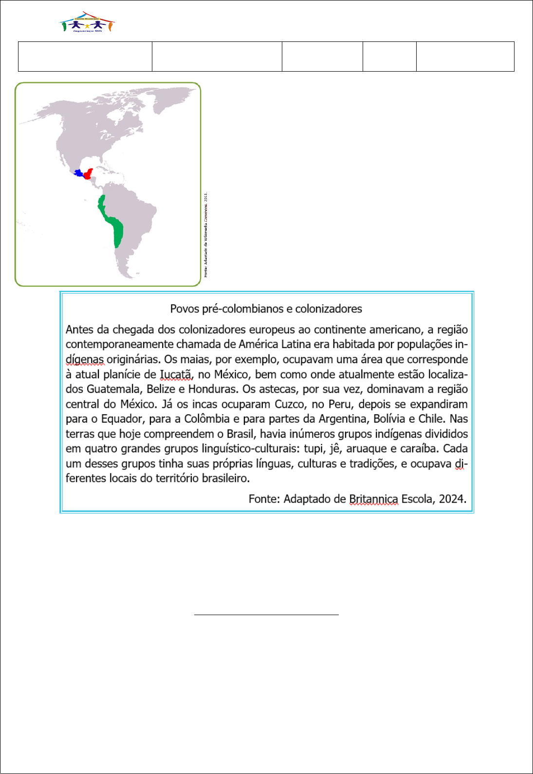 ESCOLA MUNICIPAL “CORONEL FELÍCIO MIRANDA” Natureza do Trabalho Atividades Professora: Débora Quintão Disciplina Geografia Ano 8º Data ____/____/2024 ASPECTOS FÍSICOS E OS DIFERENTES MODOS DE VIDA NA AMÉRICA LATINA. Antes da divisão do continente americano como hoje conhecemos, pesquisadores e estudiosos estimavam uma civilização pré-colombiana – antes de Cristóvão Colombo desembarcar no continente -, de aproximadamente 50 milhões de pessoas. Os povos que habitavam o continente americano ficaram então conhecidos genericamente como “povos pré-colombianos”; mas eram povos que tinham uma grande diversidade étnica, social, política e religiosa. Fazem parte dessas civilizações os incas, maias e astecas, que formavam sociedades complexas, mas que começaram a se desestruturar quando da chegada dos europeus, sua ocupação e intensa exploração. Leia o texto: Após a chegada dos europeus à América uma nova configuração se formou. Veja como ficou essa nova configuração no mapa “Continente americano: Américas do Norte, Central e do Sul”, e como ela foi representada posteriormente, sendo subdividida de acordo com crité- rios históricos, sociais e econômicos distintos, sendo uma das subdivisões a América Latina, nome dado a região que se estende do México até o sul da América do Sul. Leia o texto: CONQUISTA E COLONIALISMO A conquista europeia da América Latina começou em 1492 com as viagens de Cristóvão Colombo. Ele e outros europeus despovoaram grande parte do Caribe enquanto escravizavam os povos nativos e procuravam ouro. Quando pouco foi encontrado, eles buscaram desesperadamente as míticas Sete Cidades de Ouro de Cíbola, na América do Norte, e o lendário reino de El Dorado, na América do Sul. Dois anos depois de desembarcar uma pequena força no México em 1519, Hernán Cortés conquistou o poderoso Império Asteca. Isso foi possível, em grande parte, devido aos milhares de aliados indígenas e às armas espanholas superiores: arma- duras de aço, espadas, cães ferozes treinados, cavalos de guerra e armas de fogo barulhentas. Os vírus foram o fator mais mortal. Sem querer, os europeus trouxeram a varíola, a gripe, a peste bubônica e outras doenças que mataram milhões de pessoas, inclusive aliados. Com governos, exércitos e economias destruídos por doenças, os indígenas lutaram para manter defesas organizadas. Em um século, as populações de muitas áreas haviam caído 90%. Fonte: Adaptado de Britannica Escola, 2024. Por aqui, em 1500, Pedro Álvares Cabral chegou ao Brasil e declarou a terra como parte de Portugal: A América Latina é uma região muito diversa e extensa, que vai do México (na América do Norte) até o extremo sul da América do Sul, entre Argentina e Chile, ocupando uma área de cerca de 20 milhões de km². Ela é formada por 33 países, com uma população de aproximadamente 586 milhões de pessoas. A região é rica em diversidade geográfica, o que significa que há diferentes paisagens, climas e vegetações. Entre esses 33 países, alguns são considerados dependências, ou seja, não têm total independência política e administrativa, estando sob o controle de outros países. Porto Rico, por exemplo, é um território dos Estados Unidos, a Guiana Francesa é parte da França, e as Ilhas Malvinas são administradas pelo Reino Unido. Devido à sua grande extensão, a América Latina está presente em várias faixas de latitude, o que faz com que tenha diferentes climas e tipos de vegetação. A região é atravessada pelo Trópico de Câncer, pela linha do Equador e pelo Trópico de Capricórnio. Isso faz com que existam climas tropicais, subtropicais, frios de montanha e desertos. Também encontramos grandes formações naturais como a Cordilheira dos Andes, a Planície Amazônica e a Sierra Madre. A América Latina é um dos lugares com maior biodiversidade do mundo, abrigando áreas como a Floresta Amazônica e o Pantanal brasileiro. Sua cultura é muito rica e variada, resultado da miscigenação entre os povos indígenas que já viviam aqui, os colonizadores europeus que vieram posteriormente e os africanos. E apesar de toda essa diversidade, os países da América Latina compartilham muitas características socioculturais e históricas em comum. É importante ressaltar que o número de países na América Latina pode mudar dependendo dos critérios usados para dividir as regiões. Por exemplo, quando consideramos aspectos econômicos e sociais, todos os países da América Central fazem parte da América Latina. ATIVIDADES 1 – Os povos pré-colombianos, como os incas, maias e astecas, começaram a perder sua organização social e política devido a: A) Conflitos internos entre suas diferentes etnias. B) A chegada e exploração pelos europeus. C) Desastres naturais que afetaram suas terras. D) Migrações para outras regiões do continente. 2 – Explique o que significa o termo "povos pré-colombianos" e cite alguns exemplos de civilizações que faziam parte desse grupo. 3 – Após a chegada dos europeus, a América foi subdividida de acordo com diferentes critérios. Um dos nomes dados a uma dessas regiões, que vai do México até o sul da América do Sul, é: A) América Anglo-Saxônica. B) América do Norte. C) América Latina. D) América Central. 4 – Leia o texto: Reorganização do continente americano “[...] Após 1492, ano que marca a chegada de Cristóvão Colombo à América, foi assinado o Tratado de Tordesilhas, que dividiu entre Portugal e Espanha os lugares recém-descobertos. O tratado procurou resolver pacificamente as disputas entre as duas potências colonizadoras. A Espanha passou a ocupar uma vasta extensão territorial, incluindo regiões da América do Sul, Central e do Norte, com o objetivo de extrair metais preciosos e acumular riquezas. Em contrapartida, Portugal ocupou exclusivamente o local que viria a se tornar o Brasil, onde se dedicou à extração e 