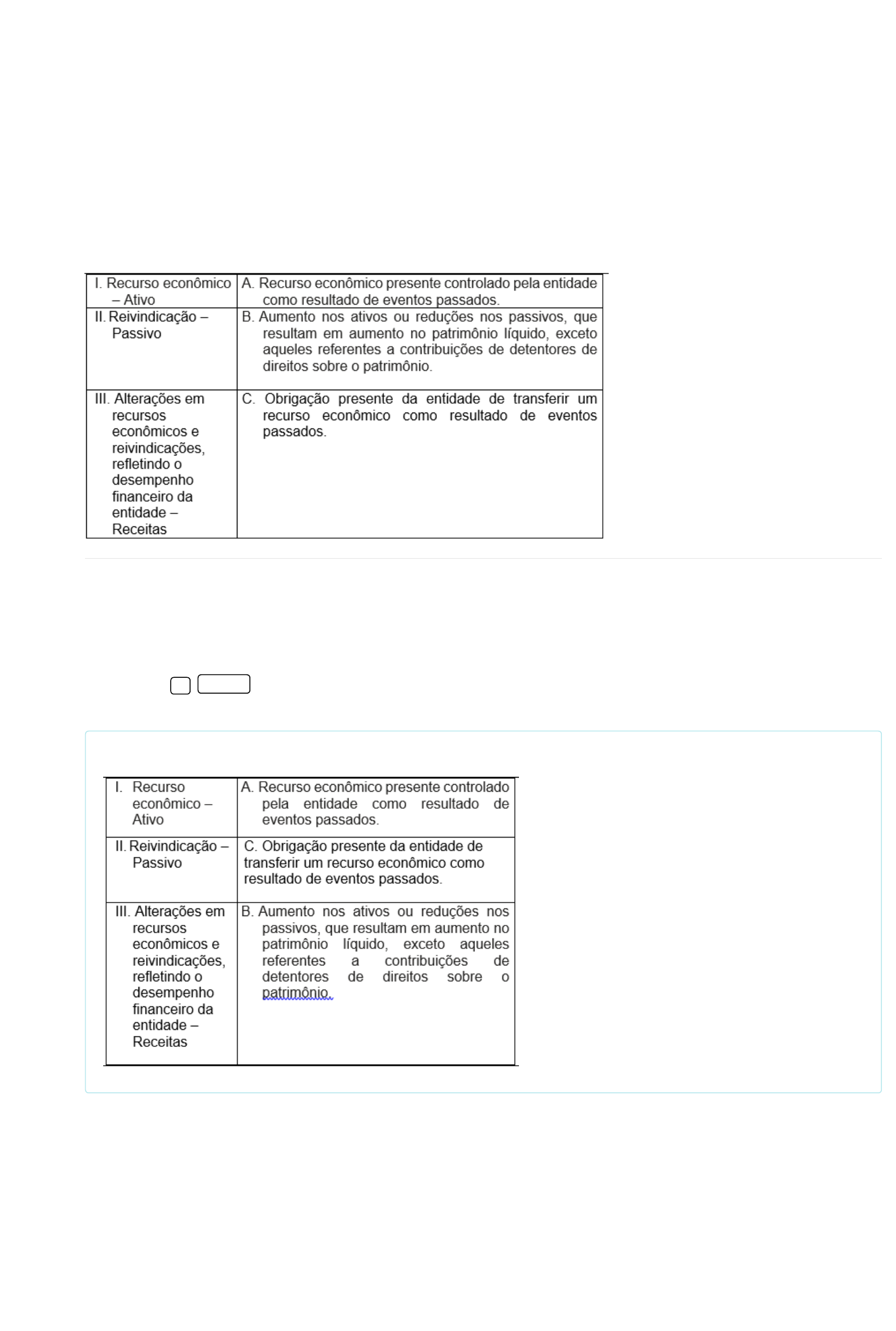Estrutura conceitual básica da contabilidade Professor(a): Rafaela Souza Pereira (Mestrado acadêmico) 1) 2) Prepare-se! Chegou a hora de você testar o conhecimento adquirido nesta disciplina. A Avaliação Virtual (AV) é composta por questões objetivas e corresponde a 100% da média final. Você tem até cinco tentativas para “Enviar” as questões, que são automaticamente corrigidas. Você pode responder as questões consultando o material de estudos, mas lembre-se de cumprir o prazo estabelecido. Boa prova! Os elementos das demonstrações contábeis definidos pela Estrutura Conceitual para Relatório Financeiro são: a. Ativos, passivos e patrimônio líquido, que se referem à posição financeira da entidade que reporta; e b. Receitas e despesas, que se referem ao desempenho financeiro da entidade que reporta. Os elementos são relacionados aos recursos econômicos, reivindicações e alterações em recursos econômicos. Em relação a estes três grupos, assinale a alternativa que traz a associação correta entre as duas colunas: Alternativas: I-B; II-A; III-C. I-B; II-C; III-A. I-C; II-A; III-B. I-A; II-C; III-B. CORRETO I-A; II-B; III-C. Código da questão: 67550 O Comitê de Pronunciamentos Contábeis, responsável pela centralização e emissão das normas de contabilidade em correlação com as normas internacionais no Brasil, é composto por integrantes de diversas organizações contábeis. São órgãos integrantes do CPC: I. B3 (Brasil Bolsa Balcão). II. FEBRABAN – Federação Brasileira de Bancos. III. CFC (Conselho Federal de Contabilidade). Resolução comentada: 3) 4) IV. BACEN – Banco Central do Brasil. V. ABRASCA (Associação Brasileira das Companhias Abertas). São verdadeiras: Alternativas: I, III e IV, apenas. II, IV e V, apenas. I, III e V, apenas. CORRETO I, II e IV, apenas. II, III e IV, apenas. Código da questão: 67499 As características qualitativas das informações contábeis têm por objetivo melhorar a utilidade das informações para os seus usuários. A Estrutura Conceitual para Relatório Financeiro classifica as características qualitativas em _________ e _________. Assinale a alternativa que completa adequadamente as lacunas. Alternativas: Tempestividade; capacidade de verificação. Fundamentais; de comparabilidade. Relevância; fundamentais De melhoria; de representação fidedigna. Fundamentais; de melhoria. CORRETO Código da questão: 67509 O conjunto completo das Demonstrações Contábeis, segundo o CPC 26 (R1), é composto por Balanço Patrimonial, Demonstração do Resultado do Exercício, Demonstração do Resultado Abrangente, Demonstração das Mutações do Patrimônio Líquido, Demonstração dos Fluxos de Caixa, Notas Explicativas e Demonstração do Valor Adicionado. A seguir, são apresentados os pressupostos de três demonstrações contábeis: Assinale a alternativa que traz a associação correta entre as duas colunas: Alternativas: Resolução comentada: O Comitê de Pronunciamentos Contábeis conta com 14 membros, sendo dois membros de cada uma das seguintes entidades contábeis: • ABRASCA (Associação Brasileira das Companhias Abertas); APIMEC NACIONAL (Associação dos Analistas e Profissionais de Investimento do Mercado de Capitais); B3 (Brasil Bolsa Balcão); CFC (Conselho Federal de Contabilidade); IBRACON (Instituto dos Auditores Independentes do Brasil); FIPECAFI (Fundação Instituto de Pesquisas Contábeis, Atuariais e Financeiras); e Entidades representativas de investidores do mercado de capitais. O CPC pode, ainda, convidar representantes de outros órgãos para compor grupos de trabalho ou comissões para tratar de temas específicos. As entidades que poderão participar do Comitê são: • BACEN – Banco Central do Brasil; CVM – Comissão de Valores Mobiliários; RFB – Secretaria da Receita Federal do Brasil; SUSEP – Superintendência de Seguros Privados; FEBRABAN – Federação Brasileira de Bancos; CNI – Confederação Nacional da Indústria; e PREVIC – Superintendência Nacional de Previdência Complementar. Resolução comentada: As características qualitativas das informações contábeis são fundamentais e de melhoria. As características fundamentais são relevância e representação fidedigna. Comparabilidade, capacidade de verificação, tempestividade e compreensibilidade são características qualitativas de melhoria. 5) 6) I-B; II-C; III-A. CORRETO I-C; II-B; III-A. I-A; II-B; III-C. I-A; II-C; III-B I-C; II-A; III-B. Código da questão: 67497 A convergência das Normas Brasileiras de Contabilidade ao padrão internacional teve início em _________ com a criação do _________, que conta com membros de diversas entidades contábeis, entre elas do _________. Assinale a alternativa que completa adequadamente as lacunas: Alternativas: 2009; IASB; Conselho Federal de Contabilidade. 2007; Comitê de Pronunciamentos Contábeis; IASB. 2005; Comitê de Pronunciamentos Contábeis; Conselho Federal de Contabilidade. CORRETO 2008; Conselho Federal de Contabilidade; Comitê de Pronunciamentos Contábeis. 2001; IASB; Comitê de Pronunciamentos Contábeis. Código da questão: 67494 Acerca da Demonstração das Mutações do Patrimônio Líquido, analise as assertivas a seguir e identifique as corretas: I. Sua finalidade é demonstrar as variações ocorridas nas contas do grupo Patrimônio Líquido, que são Capital Social, Lucros ou prejuízos acumulados e Reservas. II. Nas sociedades por ações de capital aberto é permitida a publicação da conta lucros acumulados do PL com saldo no Balanço Patrimonial, desde que seja informada a destinação na DMPL. III. Para as S.As de capital aberto, a conta lucros acumulados do Balanço Patrimonial deve ser utilizada apenas como uma conta transitória para movimentação contábil, estar zerada no encerramento do exercício e ter seus saldos apresentados na DMPL. IV. Devido ao fato de as sociedades por ações de capital aberto re