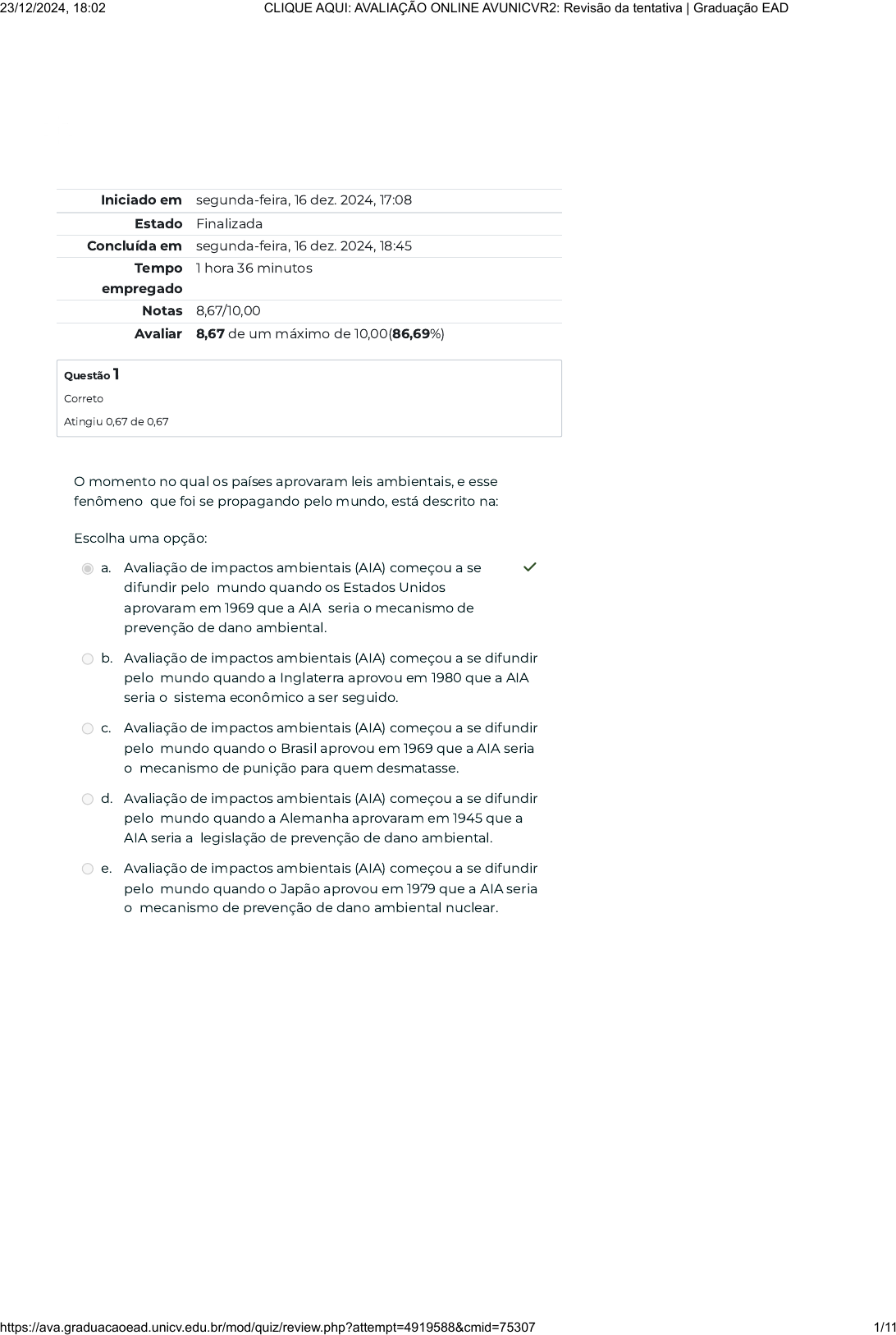 Iniciado em segunda-feira, 16 dez. 2024, 17:08 Estado Finalizada Concluída em segunda-feira, 16 dez. 2024, 18:45 Tempo empregado 1 hora 36 minutos Notas 8,67/10,00 Avaliar 8,67 de um máximo de 10,00(86,69%) Questão 1 Correto Atingiu 0,67 de 0,67 O momento no qual os países aprovaram leis ambientais, e esse fenômeno que foi se propagando pelo mundo, está descrito na: Escolha uma opção: a. Avaliação de impactos ambientais (AIA) começou a se difundir pelo mundo quando os Estados Unidos aprovaram em 1969 que a AIA seria o mecanismo de prevenção de dano ambiental. ✓ b. Avaliação de impactos ambientais (AIA) começou a se difundir pelo mundo quando a Inglaterra aprovou em 1980 que a AIA seria o sistema econômico a ser seguido. c. Avaliação de impactos ambientais (AIA) começou a se difundir pelo mundo quando o Brasil aprovou em 1969 que a AIA seria o mecanismo de punição para quem desmatasse. d. Avaliação de impactos ambientais (AIA) começou a se difundir pelo mundo quando a Alemanha aprovaram em 1945 que a AIA seria a legislação de prevenção de dano ambiental. e. Avaliação de impactos ambientais (AIA) começou a se difundir pelo mundo quando o Japão aprovou em 1979 que a AIA seria o mecanismo de prevenção de dano ambiental nuclear. 23/12/2024, 18:02 CLIQUE AQUI: AVALIAÇÃO ONLINE AVUNICVR2: Revisão da tentativa | Graduação EAD https://ava.graduacaoead.unicv.edu.br/mod/quiz/review.php?attempt=4919588&cmid=75307 1/11 Questão 2 Correto Atingiu 0,67 de 0,67 Questão 3 Correto Atingiu 0,67 de 0,67 Uma característica do cosmopolitismo é que as espécies possuem um limite de tolerância alto, podendo suportar variações físicas e químicas com facilidade. No ambiente terrestre, os ratos são exemplos de organismos cosmopolitas e com elevado limite de tolerância (BROWN e LOMOLINO, 2006). Sobre o cosmopolitismo, é correto a�rmar: Escolha uma opção: a. É a capacidade de sobreviver em quase todas as regiões do planeta, exceto onde o clima é severo, como as regiões geladas dos polos. ✓ b. É a capacidade de sobreviver em todas as regiões do planeta, inclusive onde o clima é severo, como as regiões geladas dos polos. c. É a capacidade de sobreviver em quase todas as regiões do planeta, exceto onde o clima é severo, como as regiões temperadas. d. É a capacidade de sobreviver em quase todas as regiões do planeta, exceto onde o clima é temperado, como as regiões próximas dos polos. e. É a capacidade de sobreviver em quase todas as regiões do planeta, exceto onde o clima é tropical, como as regiões entre os trópicos. A bacia hidrográ�ca é uma formação importante do relevo, pois possui características de drenagem e condições climáticas especí�cas que podem abrigar todo um bioma. Sobre a bacia hidrográ�ca, analise as proposições: I- Um impacto em um manancial pode se propagar para toda a rede de drenagem, comprometendo o ambiente da bacia hidrográ�ca. II- Trata-se de um sistema interligado, em que os canais secundários convergem para um canal principal. Com base nas asserções apresentadas, marque a opção correta: Escolha uma opção: a. As duas asserções são verdadeiras e a segunda a�rmativa justi�ca e complementa a primeira. ✓ b. As asserções I e II são proposições excludentes. c. As asserções I e II são falsas. d. A asserção I é falsa e a II é verdadeira. e. A asserção II contraria a ideia expressa na I. 23/12/2024, 18:02 CLIQUE AQUI: AVALIAÇÃO ONLINE AVUNICVR2: Revisão da tentativa | Graduação EAD https://ava.graduacaoead.unicv.edu.br/mod/quiz/review.php?attempt=4919588&cmid=75307 2/11 Questão 4 Correto Atingiu 0,67 de 0,67 Questão 5 Incorreto Atingiu 0,00 de 0,67 Em uma conferência do meio ambiente realizada no Rio de Janeiro no ano de 1992, a Eco-92, a questão ambiental já era tratada como crise ecológica em todo o mundo, e foi associada às questões políticas com metas e planos de ação. Um dos grandes destaques desse evento foi: Escolha uma opção: a. Ter produzido estudos e estabelecido maior relação entre meio ambiente e desenvolvimento, além de colocar a pobreza como tema associado à exploração/impacto ambiental. ✓ b. O compromisso de todos os países participantes em alcançar 0% de emissões de gases poluentes em um período de 10 anos no máximo. c. Culpar os países desenvolvidos pelo maior impacto, estabelecendo multas para que se sujeitem às práticas de preservação ambiental. d. O acordo de que resíduos tóxicos não seriam mais produzidos pelas indústrias dos países participantes. e. Colocar a questão ambiental e a ecologia fora do cerne político global. Alguns autores reconhecem a biogeogra�a como um braço da geogra�a, atuando como uma ciência dependente desta. Outros autores trabalham com a ideia de que a biogeogra�a é um braço da biologia, por tratar de questões que interessam ao biólogo. No entanto, a ciência moderna possui uma visão bem de�nida quanto ao papel da biogeogra�a. Marque a opção que apresenta essa visão corretamente: Escolha uma opção: a. A biogeogra�a é vista como um braço da geogra�a apenas. b. A biogeogra�a é uma ciência independente que não serve a nenhuma das duas disciplinas citadas. c. A biogeogra�a é vista como uma ciência que serve tanto à geogra�a quanto a biologia. O biogeógrafo deve possuir sólidos conhecimentos de ambas. × d. A biogeogra�a é uma ciência própria, mas que se distancia da geogra�a, se aproximando mais do campo da biologia. e. A biogeogra�a não é independente do ponto de vista cientí�co, devendo estar sempre associada à biologia, se distanciando da geogra�a. 23/12/2024, 18:02 CLIQUE AQUI: AVALIAÇÃO ONLINE AVUNICVR2: Revisão da tentativa | Graduação EAD https://ava.graduacaoead.unicv.edu.br/mod/quiz/review.php?attempt=4919588&cmid=75307 3/11 Questão 6 Incorreto Atingiu 0,00 de 0,67 Questão 7 Correto Atingiu 0,67 de 0,67 Outro marco nas 