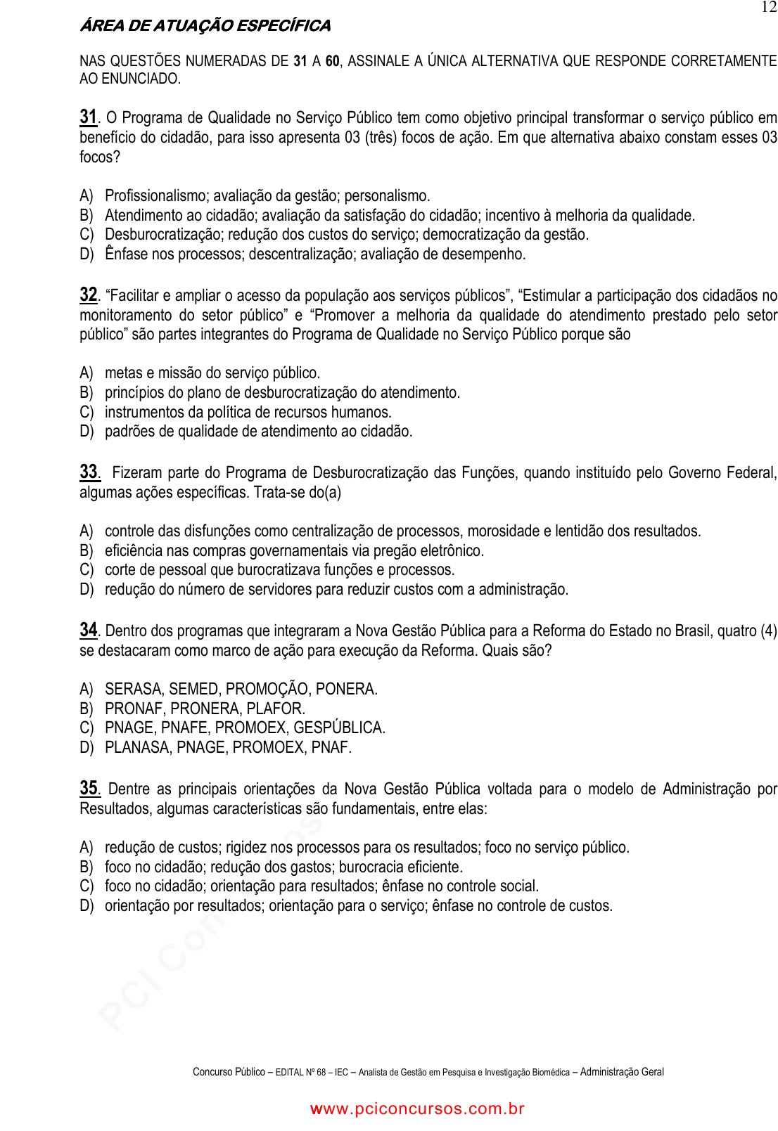 pcimarkpci MDAwMDowMDAwOjAwMDA6MDAwMDowMDAwOmZmZmY6OGE2MTo2ZGQ2:TW9uLCAzMCBEZWMgMjAyNCAxNjo1MzozNCAtMDMwMA== www.pciconcursos.com.br Concurso Público – EDITAL Nº 68 – IEC – Analista de Gestão em Pesquisa e Investigação Biomédica – Administração Geral 12 ÁREA DE ATUAÇÃO ESPECÍFICAÁREA DE ATUAÇÃO ESPECÍFICAÁREA DE ATUAÇÃO ESPECÍFICAÁREA DE ATUAÇÃO ESPECÍFICA NAS QUESTÕES NUMERADAS DE 31 A 60, ASSINALE A ÚNICA ALTERNATIVA QUE RESPONDE CORRETAMENTE AO ENUNCIADO. 31. O Programa de Qualidade no Serviço Público tem como objetivo principal transformar o serviço público em benefício do cidadão, para isso apresenta 03 (três) focos de ação. Em que alternativa abaixo constam esses 03 focos? A) Profissionalismo; avaliação da gestão; personalismo. B) Atendimento ao cidadão; avaliação da satisfação do cidadão; incentivo à melhoria da qualidade. C) Desburocratização; redução dos custos do serviço; democratização da gestão. D) Ênfase nos processos; descentralização; avaliação de desempenho. 32. “Facilitar e ampliar o acesso da população aos serviços públicos”, “Estimular a participação dos cidadãos no monitoramento do setor público” e “Promover a melhoria da qualidade do atendimento prestado pelo setor público” são partes integrantes do Programa de Qualidade no Serviço Público porque são A) metas e missão do serviço público. B) princípios do plano de desburocratização do atendimento. C) instrumentos da política de recursos humanos. D) padrões de qualidade de atendimento ao cidadão. 33. Fizeram parte do Programa de Desburocratização das Funções, quando instituído pelo Governo Federal, algumas ações específicas. Trata-se do(a) A) controle das disfunções como centralização de processos, morosidade e lentidão dos resultados. B) eficiência nas compras governamentais via pregão eletrônico. C) corte de pessoal que burocratizava funções e processos. D) redução do número de servidores para reduzir custos com a administração. 34. Dentro dos programas que integraram a Nova Gestão Pública para a Reforma do Estado no Brasil, quatro (4) se destacaram como marco de ação para execução da Reforma. Quais são? A) SERASA, SEMED, PROMOÇÃO, PONERA. B) PRONAF, PRONERA, PLAFOR. C) PNAGE, PNAFE, PROMOEX, GESPÚBLICA. D) PLANASA, PNAGE, PROMOEX, PNAF. 35. Dentre as principais orientações da Nova Gestão Pública voltada para o modelo de Administração por Resultados, algumas características são fundamentais, entre elas: A) redução de custos; rigidez nos processos para os resultados; foco no serviço público. B) foco no cidadão; redução dos gastos; burocracia eficiente. C) foco no cidadão; orientação para resultados; ênfase no controle social. D) orientação por resultados; orientação para o serviço; ênfase no controle de custos. w w w . p c i c o n c u r s o s . c o m . b r www.pciconcursos.com.br www.pciconcursos.com.br pcimarkpci MDAwMDowMDAwOjAwMDA6MDAwMDowMDAwOmZmZmY6OGE2MTo2ZGQ2:TW9uLCAzMCBEZWMgMjAyNCAxNjo1MzozNCAtMDMwMA== www.pciconcursos.com.br Concurso Público – EDITAL Nº 68 – IEC – Analista de Gestão em Pesquisa e Investigação Biomédica – Administração Geral 13 36. Dentre os modelos e princípios que influenciaram o movimento da Nova Gestão Pública, encontram-se 03 (três) que se caracterizam da seguinte forma: o “gerencialismo puro”, o “consumerismo” e o “serviço público orientado”. Nesses três modelos, existem três formas diferentes de tratar o indivíduo. Quais são? A) “Gerencialismo puro” (indivíduo como contribuinte); “consumerismo” (indivíduo como cliente); “serviço público orientado” (indivíduo como cidadão). B) “Gerencialismo puro” (indivíduo como agente social); “consumerismo” (indivíduo como cliente); “serviço público orientado” (indivíduo como súdito). C) “Gerencialismo puro” (indivíduo como cliente); “consumerismo” (indivíduo como agente); “serviço público orientado” (indivíduo como contribuinte). D) “Gerencialismo puro” (indivíduo como cliente); “consumerismo” (indivíduo como cidadão); “serviço público orientado” (indivíduo como súdito). 37. O Plano Diretor de Reforma do Estado dividiu as atividades de atuação do Estado em um núcleo estratégico e mais três dimensões. Qual das três denominações representa exatamente essas dimensões? A) Atividades voltadas para o mercado; atividades voltadas para organizações; atividades fim e meio. B) Atividades fim e meio; atividades exclusivas de Estado; atividades exclusivas para sociedade. C) Atividades não-exclusivas de Estado; atividades para o Terceiro Setor; atividades sociais de Estado. D) Atividades exclusivas de Estado; atividades não-exclusivas de Estado; atividades voltadas para o mercado. 38. A Reforma do estado no Brasil, iniciada com o Plano Diretor de Reforma do Estado, prevê que as atividades exclusivas do Estado sejam executadas de forma mais ampla por núcleo estratégico, administração direta, agências reguladoras e agências executivas. Já as atividades não-exclusivas de Estado devem ser desenvolvidas por quatro entidades, representadas pelas siglas: A) OCIP’s; ONG’s; OS. B) OCB; CNPq; MPG. C) IBAMA; MP; TRE. D) TRE; ONG’s; OS. 39. O Planejamento estratégico, por si só, não garante a sobrevivência ou crescimento da empresa, pois um Plano não implantado é só um plano e um planejamento sem ação é só ilusão. É importante na utilização do Planejamento Estratégico o seu estreito vínculo com a administração estratégica nas organizações. Não se pode tratar isoladamente o planejamento estratégico sem entrar no processo estratégico, contribuindo assim de forma mais eficaz com a gestão na obtenção dos seus resultados. Portanto, podemos dizer ainda sobre o planejamento que: 1. o Planejamento Estratégico é um processo gerencial que diz respeito às ações 