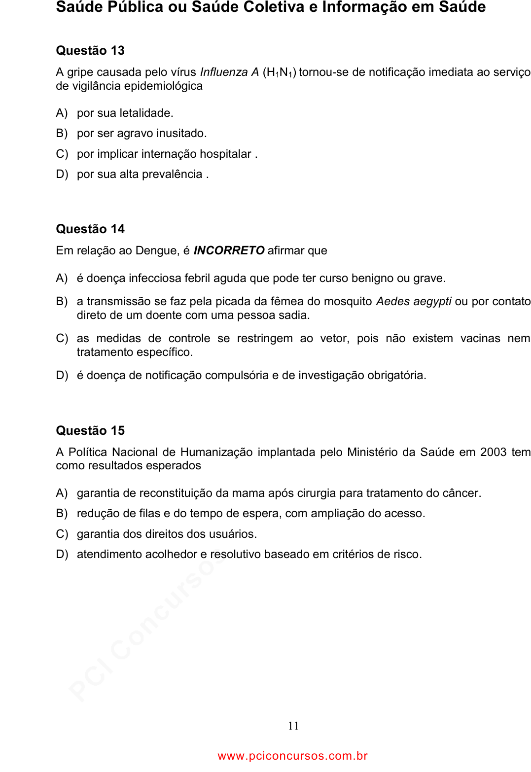 pcimarkpci MDAwMDowMDAwOjAwMDA6MDAwMDowMDAwOmZmZmY6OGE2MTo2ZGQ2:TW9uLCAzMCBEZWMgMjAyNCAyMDo0NDowNyAtMDMwMA== www.pciconcursos.com.br 11 Saúde Pública ou Saúde Coletiva e Informação em Saúde Questão 13 A gripe causada pelo vírus Influenza A (H1N1) tornou-se de notificação imediata ao serviço de vigilância epidemiológica A) por sua letalidade. B) por ser agravo inusitado. C) por implicar internação hospitalar . D) por sua alta prevalência . Questão 14 Em relação ao Dengue, é INCORRETO afirmar que A) é doença infecciosa febril aguda que pode ter curso benigno ou grave. B) a transmissão se faz pela picada da fêmea do mosquito Aedes aegypti ou por contato direto de um doente com uma pessoa sadia. C) as medidas de controle se restringem ao vetor, pois não existem vacinas nem tratamento específico. D) é doença de notificação compulsória e de investigação obrigatória. Questão 15 A Política Nacional de Humanização implantada pelo Ministério da Saúde em 2003 tem como resultados esperados A) garantia de reconstituição da mama após cirurgia para tratamento do câncer. B) redução de filas e do tempo de espera, com ampliação do acesso. C) garantia dos direitos dos usuários. D) atendimento acolhedor e resolutivo baseado em critérios de risco. www.pciconcursos.com.br pcimarkpci MDAwMDowMDAwOjAwMDA6MDAwMDowMDAwOmZmZmY6OGE2MTo2ZGQ2:TW9uLCAzMCBEZWMgMjAyNCAyMDo0NDowNyAtMDMwMA== www.pciconcursos.com.br 12 Questão 16 Considerando o momento atual sobre transplante de órgãos no Brasil, assinale a afirmativa INCORRETA. A) Toda pessoa juridicamente capaz pode dispor gratuitamente de órgãos ou tecidos do corpo vivo para fins terapêuticos. B) A identificação de potenciais doadores é o primeiro passo do processo de doação. C) O procedimento somente pode ser realizado entre pessoas com consaguinidade comprovada. D) Constituem razões para a recusa familiar à doação de órgãos dúvidas com relação ao diagnóstico de morte encefálica e causas religiosas. Questão 17 São diretrizes propostas para a Política Nacional de Informação e Informática em Saúde (PNIIS), EXCETO A) tratar a informação e a informática em saúde como macrofunção estratégica de gestão do SUS e fortalecer a visão instrumental desse campo, o que é essencial para o contínuo aperfeiçoamento da política de saúde no País. B) garantir o acesso livre a bases de dados em saúde não identificados, sujeitando a preceitos éticos o acesso a dados individuais identificados, a fim de respeitar a privacidade e confidencialidade. C) fortalecer as áreas de informação e informática nas três esferas de governo, apoiando a sua organização e desenvolvimento por meio da criação de mecanismos de articulação, com vistas à integração dos sistemas de informação em saúde. D) institucionalizar mecanismos que garantam a participação de usuários e profissionais de saúde no processo de desenvolvimento de sistemas de informação em saúde para o SUS. www.pciconcursos.com.br pcimarkpci MDAwMDowMDAwOjAwMDA6MDAwMDowMDAwOmZmZmY6OGE2MTo2ZGQ2:TW9uLCAzMCBEZWMgMjAyNCAyMDo0NDowNyAtMDMwMA== www.pciconcursos.com.br 13 Questão 18 Analise as seguintes afirmativas concernentes ao processo de informatização e às soluções em tecnologia da informação e registros eletrônicos de saúde e assinale com V as verdadeiras e com F as falsas. ( ) O uso de coletores eletrônicos, que dispensam a transcrição digital dos dados, não tem solucionado o problema do retrabalho porque não coletam os dados necessários aos processos de trabalho em saúde, requerendo a continuidade dos registros manuais. ( ) Na falta de padrões estabelecidos de representação da informação em saúde, há um crescente conjunto de tecnologias e aplicativos que não permitem o intercâmbio de dados entre os serviços e nem a alimentação automática dos sistemas de informação de saúde. ( ) O propósito da PNIIS é promover o uso inovador, criativo e transformador da tecnologia da informação para melhorar os processos de trabalho em saúde, resultando em um Sistema Nacional de Informação em Saúde articulado que produza informações para os cidadãos, a gestão e a prática profissional entre outras. ( ) Uma das diretrizes da PNIIS é fortalecer a competência do Estado de intervir na área de produção de software em saúde, por meio da adoção de padrões restritos de software financiados com recursos do SUS. ( ) A base eletrônica de indicadores construída pelo Datasus é munida de tabulador (Tabnet) que facilita o acesso aos usuários e se aplica, inclusive, a indicadores que provêm de fontes de pesquisa disponíveis em tabelas fixas. Assinale a alternativa que apresenta a sequência de letras CORRETA. A) (F) (V) (V) (F) (V) B) (V) (V) (V) (F) (F) C) (F) (F) (V) (V) (F) D) (V) (F) (F) (V) (V) www.pciconcursos.com.br pcimarkpci MDAwMDowMDAwOjAwMDA6MDAwMDowMDAwOmZmZmY6OGE2MTo2ZGQ2:TW9uLCAzMCBEZWMgMjAyNCAyMDo0NDowNyAtMDMwMA== www.pciconcursos.com.br 14 Questão 19 Analise as seguintes afirmativas concernentes às informações de saúde e às bases de dados em saúde. I. Os dados aportados pelos diversos sistemas de informação do MS podem ser trabalhados em interação com os das pesquisas desenvolvidas pelo IBGE – Censo Demográfico, Pesquisa Nacional por Amostra de Domicílios (PNAD) e Pesquisa de Assistência Médico-Sanitária (AMS) –, em níveis variados de agregação. II. A construção da matriz de indicadores pautou-se nos critérios de: relevância para a compreensão da situação de saúde, suas causas e consequências; validade para orientar decisões de política e apoiar o controle social; identidade com processos de gestão do SUS e disponibilidade de fontes regulares. III. Os indicadores da matriz de indicadores foram classificados em seis subconjuntos temáticos: demográficos, socioeconômicos, mortalidade, morbidade e fatores de risco, recursos e cobertura. IV. Na categoria 