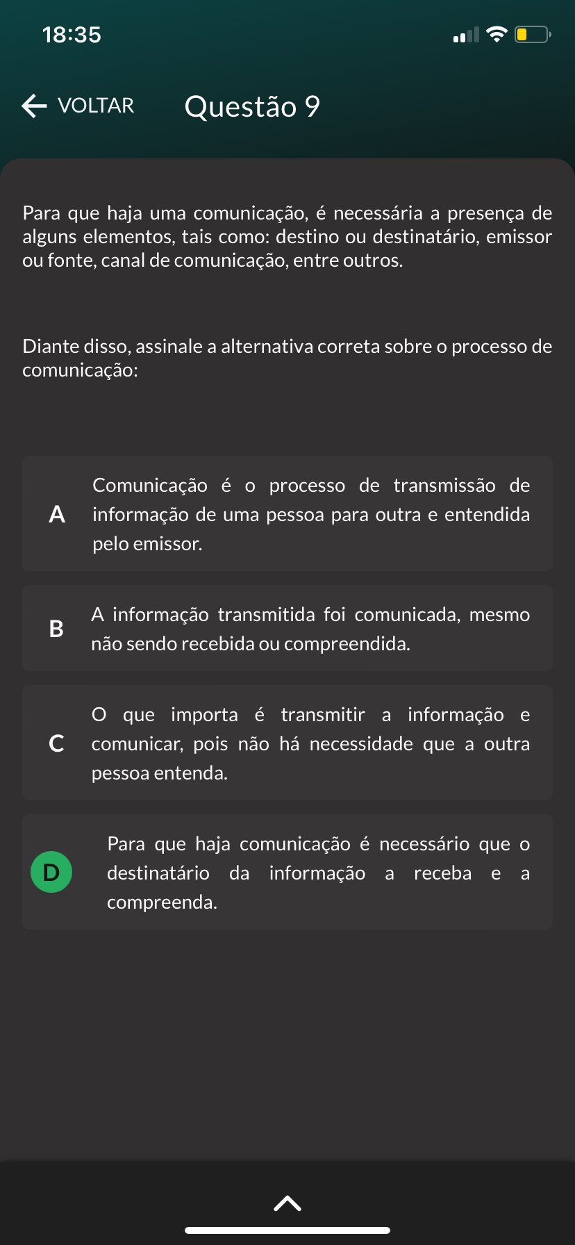 18:35 VOLTAR Questão 9 Para que haja uma comunicação, é necessária a presença de alguns elementos, tais como: destino ou destinatário, emissor ou fonte, canal de comunicação, entre outros. Diante disso, assinale a alternativa correta sobre processo de comunicação: Comunicação é processo de transmissão de A informação de uma pessoa para outra e entendida pelo emissor. A informação transmitida foi comunicada, mesmo não sendo recebida ou compreendida. O que importa é transmitir a informação e C comunicar, pois não há necessidade que a outra pessoa entenda. Para que haja comunicação é necessário que D destinatário da informação a receba e a compreenda.