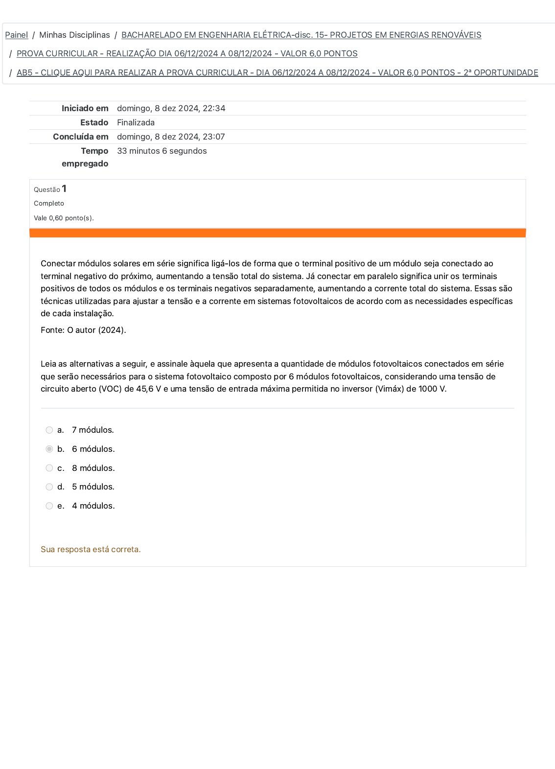 Iniciado em domingo, 8 dez 2024, 22�34 Estado Finalizada Concluída em domingo, 8 dez 2024, 23�07 Tempo empregado 33 minutos 6 segundos Questão 1 Completo Vale 0,60 ponto(s). Conectar módulos solares em série significa ligá-los de forma que o terminal positivo de um módulo seja conectado ao terminal negativo do próximo, aumentando a tensão total do sistema. Já conectar em paralelo significa unir os terminais positivos de todos os módulos e os terminais negativos separadamente, aumentando a corrente total do sistema. Essas são técnicas utilizadas para ajustar a tensão e a corrente em sistemas fotovoltaicos de acordo com as necessidades específicas de cada instalação. Fonte: O autor (2024). Leia as alternativas a seguir, e assinale àquela que apresenta a quantidade de módulos fotovoltaicos conectados em série que serão necessários para o sistema fotovoltaico composto por 6 módulos fotovoltaicos, considerando uma tensão de circuito aberto (VOC) de 45,6 V e uma tensão de entrada máxima permitida no inversor (Vimáx) de 1000 V. a. 7 módulos. b. 6 módulos. c. 8 módulos. d. 5 módulos. e. 4 módulos. Sua resposta está correta. Painel / Minhas Disciplinas / BACHARELADO EM ENGENHARIA ELÉTRICA-disc. 15- PROJETOS EM ENERGIAS RENOVÁVEIS / PROVA CURRICULAR - REALIZAÇÃO DIA 06/12/2024 A 08/12/2024 - VALOR 6,0 PONTOS / AB5 - CLIQUE AQUI PARA REALIZAR A PROVA CURRICULAR - DIA 06/12/2024 A 08/12/2024 - VALOR 6,0 PONTOS - 2ª OPORTUNIDADE https://www.eadunifatecie.com.br/course/view.php?id=49614 https://www.eadunifatecie.com.br/course/view.php?id=49614 https://www.eadunifatecie.com.br/my/ https://www.eadunifatecie.com.br/course/view.php?id=49614 https://www.eadunifatecie.com.br/course/view.php?id=49614#section-12 https://www.eadunifatecie.com.br/mod/quiz/view.php?id=1652308 Questão 2 Completo Vale 0,60 ponto(s). A partir da década de 2010, a energia solar começou a ganhar mais destaque no Brasil. Houve um aumento significativo na instalação de sistemas fotovoltaicos em residências, empresas e em projetos de geração centralizada. Os custos dos painéis solares diminuíram consideravelmente, tornando a energia solar mais acessível para consumidores e investidores. Fonte: O autor (2024). Utilizando os seus conhecimentos sobre o assunto, leia as afirmativas a seguir e assinale àquela que apresenta um dos desafios enfrentados durante o processo de transição para a energia solar em residências. a. Facilidade na manutenção dos sistemas fotovoltaicos. b. Dificuldade em capacitar e treinar os funcionários. c. Falta de incentivos governamentais. d. Baixa conscientização sobre os benefícios da energia solar. e. Baixo investimento inicial. Sua resposta está incorreta. Questão 3 Completo Vale 0,60 ponto(s). A Consulta Pública (CP) nº 10 da ANEEL é um processo pelo qual a agência propõe alterações ou novas regulamentações no setor elétrico e convida a participação da sociedade para contribuir com sugestões e opiniões. Durante o período de consulta, qualquer interessado pode enviar contribuições por meio de formulários específicos disponibilizados pela ANEEL. Essas contribuições são analisadas pela agência antes da tomada de decisão final sobre a regulamentação proposta. A CP nº 10 pode abordar uma variedade de temas, desde tarifas de energia até normas de qualidade de serviço, e tem como objetivo garantir a transparência e participação pública no processo regulatório. Fonte: O autor (2024). Neste contexto, leia atentamente as afirmativas a seguir e assinale a alternativa que apresenta qual foi o principal objetivo da Consulta Pública (CP) nº 10 aberta pela Aneel em 2018. a. Desenvolver uma metodologia para análise de impacto regulatório sobre a compensação de energia gerada pela geração distribuída. b. Analisar o impacto regulatório das novas tecnologias de geração distribuída. c. Estabelecer tarifas binômias para os consumidores de baixa tensão. d. Propor alterações nas regras de conexão de sistemas de geração distribuída. e. Definir a potência máxima permitida para microgeradores e minigeradores. Sua resposta está correta. Questão 4 Completo Vale 0,60 ponto(s). A Resolução Normativa (REN) nº 481/2012 da ANEEL estabelece os procedimentos para a adesão de consumidores à geração distribuída de energia elétrica no Brasil. Ela define as regras e condições para que os consumidores instalem sistemas de geração própria, como energia solar, e se conectem à rede elétrica. Essa resolução permite que os consumidores gerem sua própria energia e possam compensar o excedente produzido com a distribuidora local, gerando créditos de energia. Isso promove o uso de fontes renováveis e a geração distribuída no país. Fonte: O autor (2024). Neste contexto, leia atentamente as afirmativas a seguir e assinale a alternativa que apresenta quais poderiam receber desconto nas tarifas de uso dos sistemas elétricos de transmissão e distribuição, conforme a Resolução. a. Empreendimentos com potência instalada superior a 30 MW. b. Aqueles que utilizassem exclusivamente energia solar fotovoltaica. c. Usinas de biomassa com potência instalada superior a 1 MW. d. Apenas parques eólicos. e. Empreendimentos com potência injetada igual ou inferior a 30 MW. Sua resposta está correta. Questão 5 Completo Vale 0,60 ponto(s). Os fatores críticos de sucesso de um projeto são elementos ou condições que devem ser atendidos para garantir o alcance dos objetivos e a entrega bem-sucedida do projeto. Identificar e gerenciar esses fatores de forma proativa ao longo do ciclo de vida do projeto é essencial para minimizar riscos, superar desafios e garantir o sucesso do projeto. Fonte: O autor (2024). Neste contexto, leia atentamente as afirmativas a seguir e assinale a alternativa que apresenta os fatores críticos de sucesso em projetos. a. Minimização de surpresas, adaptação rápida às necessidades do clien