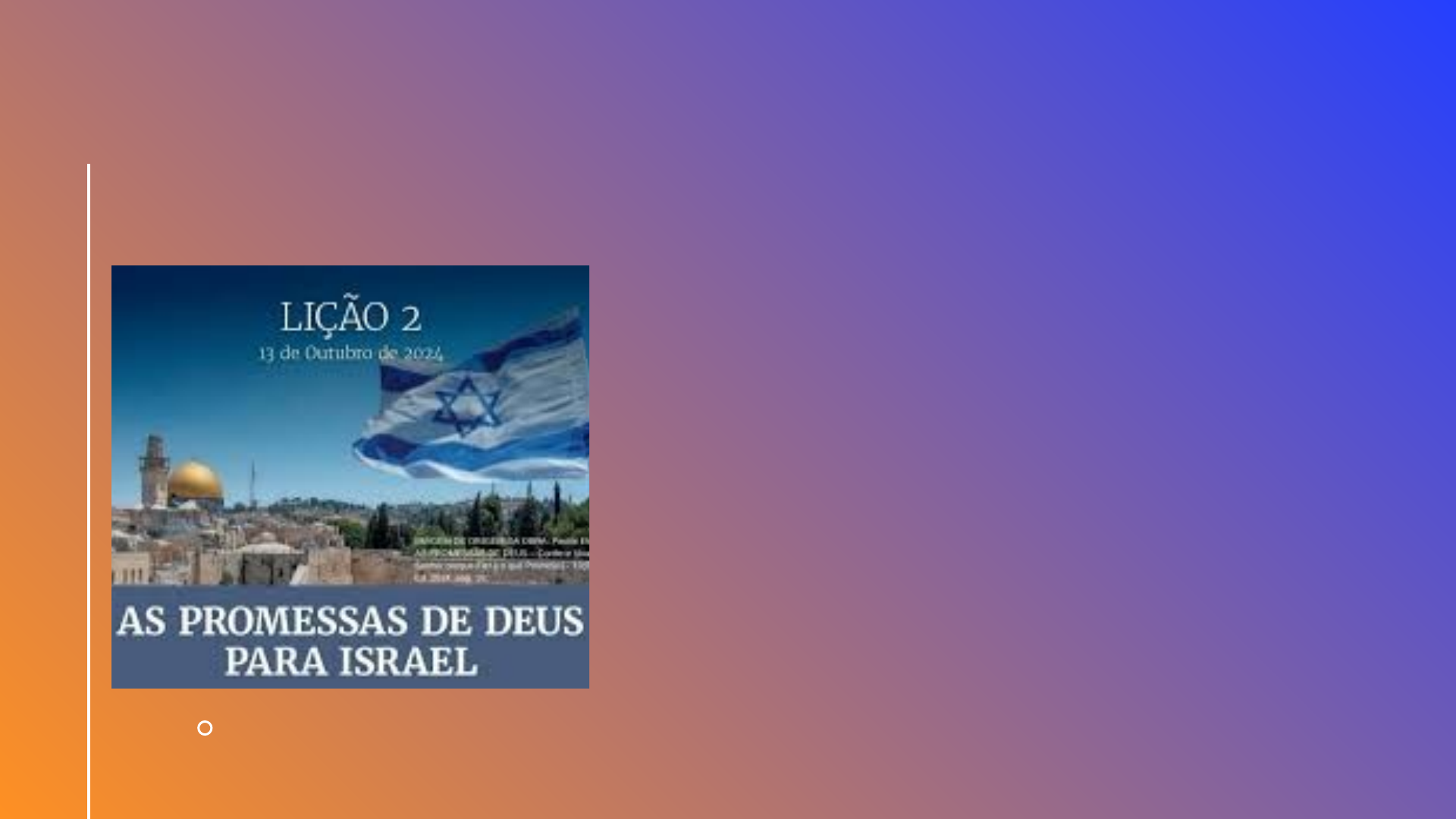 Lição 2 - As promessas de deus para israel 1 Uma grande nação: “E far-te-ei uma grande nação, e abençoar-te-ei, e engrandecerei o teu nome, e tu serás uma bênção”, Gn 12.2 2 Referencial de benção: “E abençoarei os que te abençoarem e amaldiçoarei os que te amaldiçoarem; e em ti serão benditas todas as famílias da terra”, Gn 12.3. 3 Uma terra de bênçãos “E apareceu o SENHOR a Abrão e disse: À tua semente darei esta terra. E edificou ali um altar ao SENHOR, que lhe aparecera”, Gn 12.7. 4 O olhar do Senhor sobre o Templo dos israelitas: “E o SENHOR lhe disse: Ouvi a tua oração e a tua súplica que, suplicando, fizeste perante mim; santifiquei a casa que edificaste, a fim de pôr ali o meu nome para sempre; e os meus olhos e o meu coração estarão ali todos os dias”, 1Rs 9.3. 5 Um descendente de Davi que firmaria seu trono eterno: “Quando teus dias forem completos, e vieres a dormir com teus pais, então, farei levantar depois de ti a tua semente, que procederá de ti, e estabelecerei o seu reino. Este edificará uma casa ao meu nome, e confirmarei o trono do seu reino para sempre”, 2Sm 7.12-13. Texto Áureo: - Essa passagem é a promessa cujo cumprimento perpassa toda a Escritura até Ap 20. A aliança com Abrão propriamente dito é apresentada em 12.1-3, de fato feita em 15.18-21, reafirmada em 17.1-21, renovada também com Isaque (26.2-5) e Jacó (28.10-17). É uma aliança eterna (17.7-8; 1Cr 16.17; SI 105.7-12; ls 24.5) que contém quatro elementos: 1) descendência (17.2-7; cf. Cl 3.8,16 onde se refere a Cristo); 2) terra (15.18-21; 17.8); 3) nação (12.2; 17.4); e ainda 4) bênção e proteção divinas (12.3). Sua importância espiritual para todos os crentes é exposta por Paulo (Gl 3-4). Os que "amaldiçoam Abrão e seus descendentes são os que os ignoram, desprezam e tratam com desdém. A maldição de Deus para essa falta de respeito e desconsideração envolveria o mais severo dos castigos divinos. O contrário aconteceria com aqueles que abençoassem Abrão e seu Servo. em ti serão benditas todas as famílias da terra. Paulo identifica essas palavras como o evangelho preanunciado a Abraão (Gl 3.8). 2 Verdade Prática: Também Isaías proclama em relação a Israel: “Ainda que o número dos israelitas seja como a areia do mar, apenas o remanescente é que será salvo! (Rm 9.27). A promessa a Israel está presente na Bíblia em diversos trechos, incluindo Jeremias 23:3, Isaías 10:20-23 e Romanos 11:26. Deus prometeu a proteger um remanescente de crentes através do qual a “semente” do Messias prometido por Deus viria. Essa promessa profética foi cumprida na primeira vinda de Jesus Cristo como nosso Salvador. Deus também prometeu trazer aquele “remanescente” de volta à sua terra para ser Seu povo redimido para sempre. 3 LEITURA BÍBLICA EM CLASSE Gênesis 12.1 -3; 1. O SENHOR disse a Abrão. Foi do agrado de Deus, que muitas vezes foi encontrado entre aqueles que não O procuravam, revelar-se a Abraão talvez por um milagre; e a conversão de Abraão é uma das mais notáveis na história da Bíblia 2. e tu serás uma bênção. Pela tua semente que é Cristo, o mundo recuperará a bênção que perdeu em Adão. [Genebra] 3. em ti. Na tua descendência, no Messias, que virá de ti, serão benditas todas as famílias da terra; porque, assim como ele tomará sobre si a natureza humana desde a descendência de Abraão, ele provará a morte por cada homem, o seu Evangelho será pregado em todo o mundo, e inumeráveis bênçãos serão derramadas sobre toda a humanidade através da sua morte e intercessão. 4 LEITURA BÍBLICA EM CLASSE Romanos 9 1. O apóstolo abre essa divisão de seu assunto dando vazão a seus sentimentos reais com extraordinária veemência de protesto. Digo a verdade em Cristo – como se estivesse mergulhada no espírito daquele que chorou sobre Jerusalém. Minha consciência dá testemunho comigo pelo Espírito Santo – “minha consciência tão vivificada, iluminada e até agora sob a operação direta do Espírito Santo. 3. Que são meus parentes segundo a carne. Na proporção em que se sentiu separado de sua nação, ele parece ter percebido de forma ainda mais vívida sua relação natural com eles. Sem dúvida, quando um grande perseguidor de cristãos, o apóstolo não desejava nenhuma conexão com Cristo e desejava que o próprio nome de Cristo perecesse. 4, 5 Paulo lista alguns dos grandes privilégios de Israel. Por exemplo, eles foram chamados de israelitas. Israel foi o nome dado a Jacó, um antepassado dos judeus, como uma expressão do favor de Deus (Gn 32.28). Cristo. O maior privilégio para os judeus foi o fato do Messias ter vindo de Israel. Deus bendito eternamente. Jesus Cristo é Deus feito carne. 5 INTRODUÇÃO De acordo com a Bíblia, Deus fez várias promessas a Israel, incluindo: Herança da terra: - Deus prometeu a Abraão que seus descendentes herdariam a terra onde viviam, que é a atual região de Israel. Povo da promessa: - Deus prometeu que os israelitas seriam o seu povo da aliança, desde que obedecessem aos seus mandamentos. Bênção para as nações: - Deus prometeu que Israel seria uma bênção para as nações do mundo, levando-lhes o evangelho e o sacerdócio. Proteção: -Deus prometeu que o protetor do povo de Israel nunca dorme, nem cochila, e que o SENHOR guardará o povo de Israel e estará sempre ao seu lado para protegê-lo. Salvação: - Deus prometeu salvar o povo de Israel, derrotando e humilhando todos os seus inimigos. Amor eterno: - Deus prometeu amar Israel com amor eterno, incessante, sem fim. O plano de Deus para Israel era que se tornasse uma potência espiritual e um centro de difusão do conhecimento do verdadeiro Deus. Quando examinamos as profecias do Velho Testamento, vemos as promessas de Deus aos judeus: Isaías 11:11-16; Jeremias 31:31-37; 33:23- 26; Zacarias 8:23; 9:9-10, etc. 6 I. ISRAEL: A PROMESSA DA CRIAÇÃO DE UMA GRANDE NA