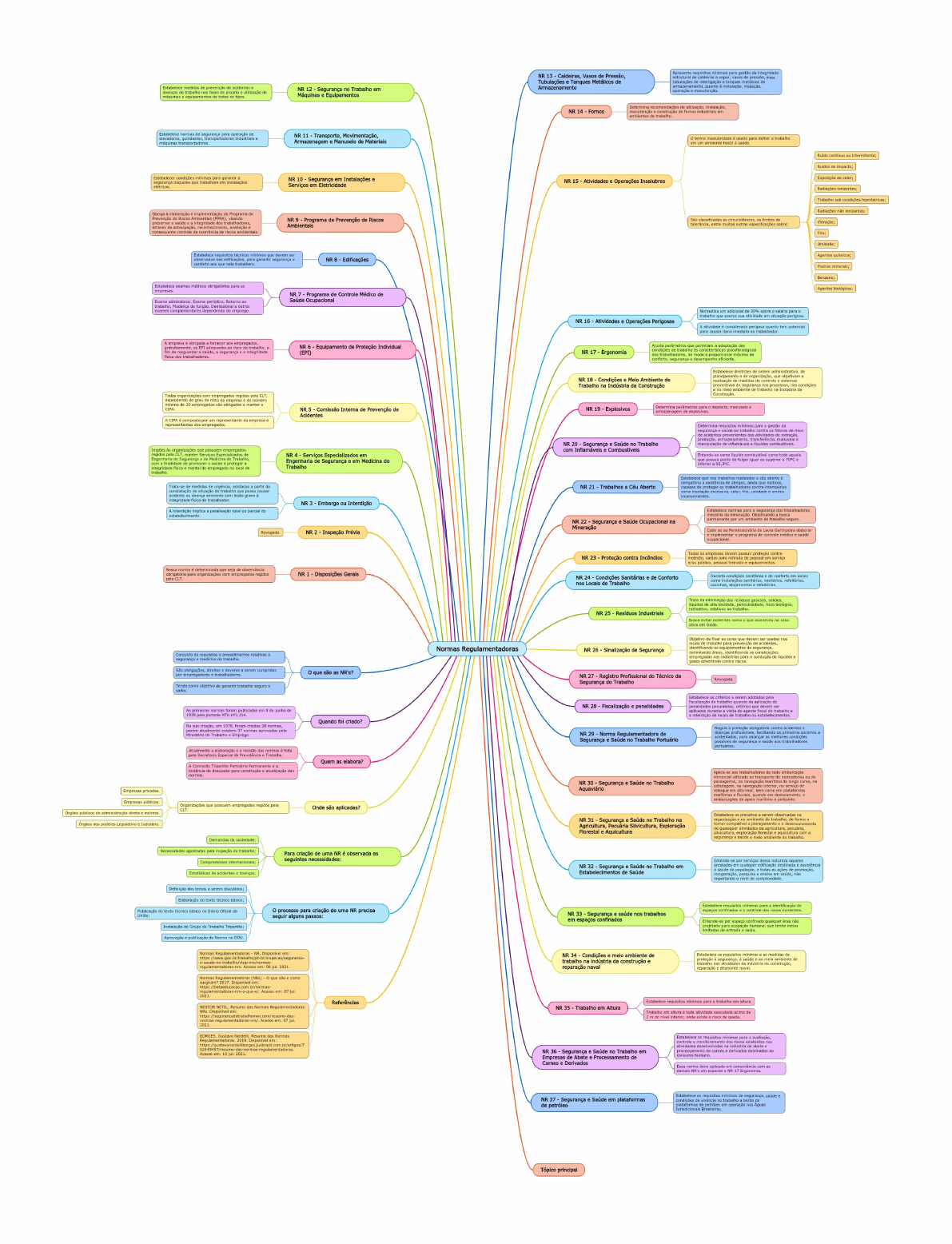 NR 13 Vasos de Pressão, Tubulações Tanques Metálicos de prevenção acidentes NR 12 Segurança no Trabalho em Armazenamento de operação Máquinas Equipamentos NR Fornos Determina ornos em industriais ambientes trabalho. Estabelece normas segurança para operação de NR 11 Movimentação, máquinas Armazenagem Manuseio de Materiais insalubridade usado para definir trabalho um ambiente Ruído para para que trabalha NR 10 Segurança em Instalações Exposição calor; NR 15 Atividades Operações Insalubres Serviços em Eletricidade Radiações Trabalho condições hipe Obriga Programa de Radiações ionizantes; Riscos visando NR Programa de Prevenção de Riscos Ambientais entre muitas outras especificações sobre riscos Frio; Umidade; Estabelece requisitos que que Agentes químicos; para garanti NR Edificações aos que nela trabalhem Poeiras minerais; Benzeno; Estabelece exames médicos para as Agentes NR Programa de Controle Médico de Exame Exame Retorno ao Saúde Ocupacional trabalho Mudança função um adicional 30% trabalho exerce tividade perigosa NR 16 Atividades Operações Perigosas quanto tem potencial para causar dano trabalhador empresa obrigada aos NR Equipamento de Proteção Individual Ajusta adaptação das segurança integridade (EPI) NR Ergonomia máximo de conforto, desempenho eficiente Estabelece ordem de diretrizes planejamento que objetivam NR 18 Condições Meio Ambiente de Trabalho na da Construção no meio trabalho da condições Todas com regidos pela empregados são obrigadas manter a CIPA NR Comissão Interna de Prevenção de NR Explosivos Determina depósito, manuseio e Acidentes A CIPA composta presentante Determina Determina requisitos para gestão da saúde provenientes NR 20 Segurança Saúde no Trabalho inflamáveis Impões que empregados de com Inflamáveis Combustíveis Medicina NR Serviços Especializados em como como como todo aquele Engenharia de Segurança em Medicina do que fulgor igual superior 70°C proteger mental empregado local de Trabalho trabalho Estabelece trabalhos realizados aberto Trata partir da NR 21 Trabalhos Aberto abrigos, ainda possa como umidade grave & integridade fisica NR Embargo ou Interdição implica paralisação total parcial do para dos trabalhadores NR 22 Segurança Saúde Ocupacional na Mineração Revogada NR Inspeção Prévia Cabe Lavra programa saúde NR 23 Proteção contra Incêndios Todas empres empresas possuir proteção contra retirada serviço e/ou pessoal Nessa determinada que sela para organizações com empregados regidos NR Disposições Gerais NR 24 Condições Sanitárias de Conforto Decreta condições sanitárias em locais nos Trabalho como rios, refeitórios, alojamentos refeitórios Trata eliminação dos risco relativos trabalho NR 25 Industriais Busca evitar acidentes como que aconteceu caso Objetivo de fixar que devem ser usadas nos Normas Regulamentadoras NR 26 Sinalização de Segurança requisitos relativos delimitando requisitos areas identificand segurança medicina trabalho gases advertindo contra riscos São obrigações, direitos serem cumpridos o são NR's? NR 27 Registro Profissional do Técnico de Revogada Tendo como objetivo garantir trabalho Segurança Trabalho sadio Estabelece serem adotados pela NR 28 Fiscalização penalidades trabalho quando aplicação norma publicadas em 8 de junho de 1978 MTb 214 locais Quando criado? criação em 1978 foram criadas 28 normas, aprovadas pelo Regula proteção acidentes Trabalho Emprego NR 29 Norma Regulamentadora de Segurança Saúde no Trabalho Portuário aos portuários pela Especial Atualmente revisão das normas feita Quem elabora? A Comissão Tripartite Permanente instância discussão para construção atualização das Aplica-se Aplica-se trabalhadores toda embarcação comercial NR 30 - Segurança Saúde no Trabalho Empresas privadas. Aquaviário Empresas que possuem empregados regidos pela Onde são aplicadas? públicos administração direta Estabelece preceitos serem observadas NR 31 Segurança no Trabalho na forma dos poderes Legislativo Agricultura, Pecuaria Silvicultura, Exploração quaisquer Florestal Aquicultura pecuária, segurança saúde ambiente trabalho. Demandas sociedade; Necessidades apontadas pela inspeção trabalho; Para criação de uma NR observada as Compromissos internacionais; seguintes necessidades: Entende- Entende- por serviços dessa natureza aqueles NR 32 Segurança Saúde no Trabalho em qualquer Estatísticas acidentes Estabelecimentos Saúde população, todas não importando Definição dos temas serem Elaboração texto técnico Estabelece requisitos para identificação de Publicação texto Diário Oficial da processo para criação de uma NR precisa controle seguir alguns passos: NR 33 Segurança saúde nos trabalhos em espaços confinados Entende- Entende- não Instalação Grupo Trabalho Tripartite; projetada que tenha meios Aprovação publicação Norma Normas Regulamentadoras NR Disponível em: NR 34 Condições meio ambiente de Estabelece medidas trabalho indústria da construção e proteção de Acesso 06 atividade reparação naval reparação desmonte Normas Normas entadoras como surgiram 2017 2017 Acesso em: 2021 Referências Estabelece requisitos para trabalho em NEST NETO, das Normas Regulamentadoras NR 35 Trabalho em Altura Trabalho toda atividade executada acima de inferior onde risco queda. Acesso em: BORGES Nardelli Resumo das Normas Estabelece requisitos para avaliação, artigos/7 atividades abate Acesso 2021 NR 36 Segurança Saúde no Trabalho em carnes derivados Empresas Abate Processamento de Carnes Derivados Essa deve aplicada com as demais NR's especial NR Estabelece requisitos saúde NR 37 Segurança Saúde em plataformas condições de operação Tópico principal