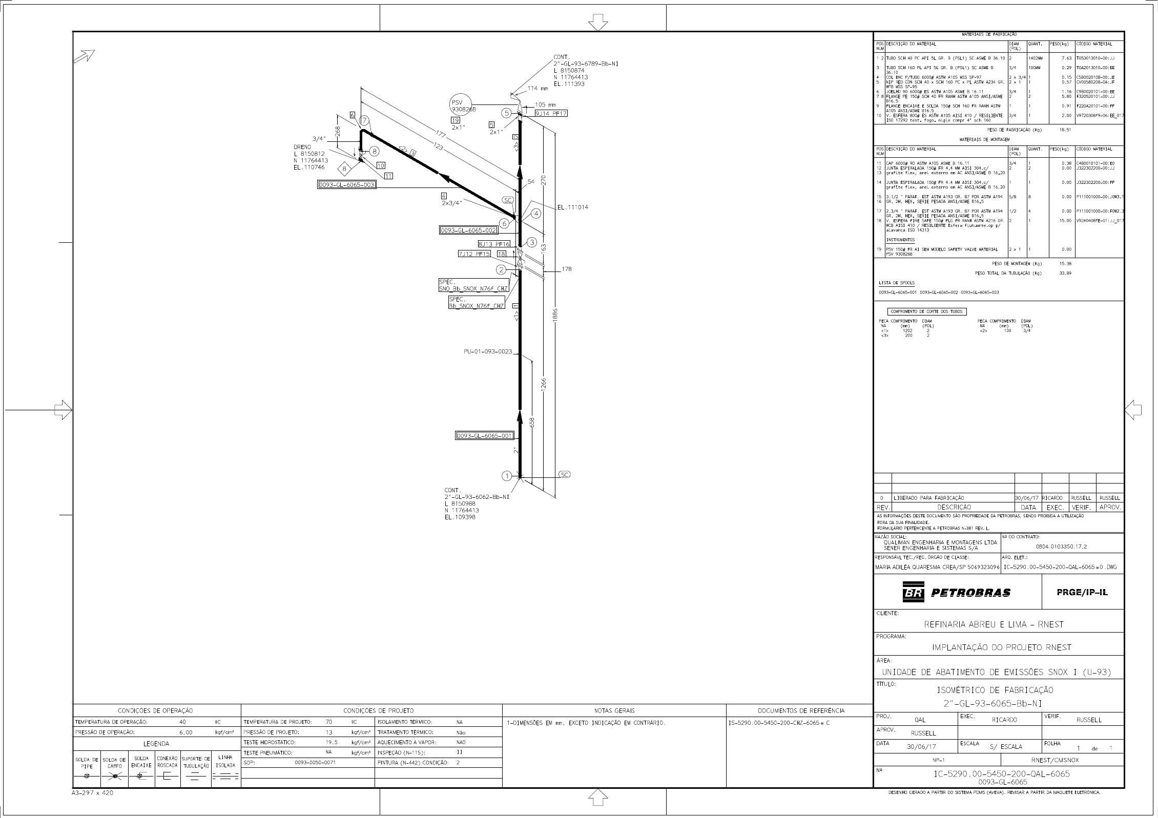 MATERIAIS DE FABRICAÇÃO POS DESCRIÇÃO DO MATERIAL DIAM QUANT MATERIAL NUM (POL) TUBO SCH 40 API 5L GR B (PSL1) ASME 36.10 2 1402MM 7.63 T053013010-00:JJ L 8150874 3 TUBO SCH 160 PL AP1 5L GR (PSL1) ASME B 3/4 0.29 36.10 N 11764413 4 COL ENC P/TUBO 6000# ASTM A105 MSS SP-97 3/4 0.15 EL 111393 5 NIP RED CON SCH 40 SCH 160 PC PL ASTM A234 0.57 114 mm WPB MSS SP-95 6 6 JOELHO 90 6000# ES ASTM A105 ASME 3/4 1 1.16 FLANGE 150# SCH 40 FR RANH ASTM A105 ANSI/ASME 2 5.80 PSV 105 mm 9 FLANGE ENCAIXE SOLDA SCH 160 FR RANH ASTM 1 1 0.91 6 5 A105 ANSI/ASME 816.5 10 ESFERA 800# ES ASTM A105 AISI 410 / RESILIENTE 3/4 1 2.00 7 19 ISO 17292 test. fogo. niple compr 4' sch 160 5 2x1' 2x1' PESO DE (Kg) 18.51 3/4' MATERIAIS DE MONTAGEM DRENO 123 L 8150812 8 POS DESCRIÇÃO DO MATERIAL DIAM QUANT MATERIAL NUM (POL) N 11764413 10 11 CAP 6000# RO ASTM A105 ASME 16.11 EL 110746 3/4 1 0.38 8 JUNTA PIRALADA 150# AISI 304 2 0.00 13 grafite anel externo em AC ANS1/ASME 16.20 11 54 JUNTA PIRALADA 150# FR 4.4 MM 1 0093-GL-6065-003 14 1 0.00 flex, anel externo em AC ANSI/ASME 16.20 15 EST A193 GR POR ASTM A194 5/8 8 SC 0.00 2x3/4' 16 GR. HEX. SERIE PESADA ANSI/ASME B16.5 EL 111014 17 4 2.3/4 PARAF EST ASTM A193 GR. B7 POR ASTM A194 1/2 4 0.00 SERIE PESADA 18 6 ESFERA FIRE SAFE 150# FLG FR RANH ASTM A216 GR 2 1 15.00 WCB AISI 410 RESILIENTE Esfera flutuante.op ISO 14313 8J13 PF16 3 INSTRUMENTOS 19 PSV 150# AI SEM MODELO SAFETY VALVE MATERIAL 2 1 0.00 7J12 PF15 18 PSV 930826B PESO DE MONTAGEM (Kg) 15.38 2 178 PESO TOTAL DA 33.89 SPEC LISTA SPOOLS CHZ 0093-GL-6065-002 SPEC COMPRIMENTO DE CORTE DOS TUBOS PECA COMPRIMENTO DIAM PFCA COMPRIMENTO DIAM (mm) (POL) (mm) (POL) 1202 100 3/4 200 PU-01-093-0023 0093-GL-6065-001 1 CONT 0 LIBERADO PARA FABRICAÇÃO 30/06/17 RICARDO RUSSELL RUSSELL L 8150988 N 11764413 REV. DESCRIÇÃO DATA APROV. EL 109398 AS INFORMAÇÕES DESTE DOCUMENTO SÃO PROPRIEDADE DA SENDO PROIBIDA UTILIZAÇÃO FORA SUA FINALIDADE FORMULÁRIO PERTENCENTE A PETROBRAS N-381 REV. L. RAZÃO SOCIAL: DO QUALIMAN ENGENHARIA F MONTAGENS LTDA SENER ENGENHARIA E SISTEMAS S/A 0804.0103350.17.2 ORGÃO DE CLASSE: ARO. ELET.: MARIA QUARESMA CREA/SP 5069323096 PETROBRAS PRGE/IP-IL CLIENTE: REFINARIA ABREU F LIMA - RNEST IMPLANTAÇÃO DO PROJETO RNEST UNIDADE DE ABATIMENTO DE EMISSÕES SNOX (U-93) TÍTULO: DE FABRICAÇÃO 2"-GL-93-6065-Bb-NI DE OPERAÇÃO DE PROJETO NOTAS GERAIS DOCUMENTOS DE REFERÊNCIA EXEC. TURA DE 40 TEMPERATURA DE 70 °C ISOLAMENTO NA 1-DIMENSÕES EM mm, EXCETO INDICAÇÃO CONTRÁRIO QAL RICARDO RUSSELL DE OPERAÇÃO: 6.00 kgf/cm2 PRESSÃO DE 13 TRATAMENTO Não APROV. RUSSELL LEGENDA TESTE HIDROSTATICO: 19.5 AQUECIMENTO A NAO DATA ESCALA FOLHA 30/06/17 S/ ESCALA 1 TESTE PNEUMÁTICO: NA INSPEÇÃO (N-115) de 1 DE SOLDA CONEXÃO DE LINHA CAMPO ENCAIXE ROSCADA TUBULAÇÃO SOP: 0093-0050-0071 PINTURA (N-442) CONDIÇÃO: 2 NP-1 RNEST/CMSNOX IC-5290.00-5450-200-QAL-6065 0093-GL-6065 420 DESENHO GERADO PARTIR DO SISTEMA PDMS (AVEVA). REVISAR A PARTIR DA MAQUETEMATERIAIS FABRICACAO 8150988 MATERIAL DIAM QUANT CÓDIGO MATERIAL NUM (POL) N 11764413 TUBO SCH API 5L GR (PSL1) ASME 1202MM 6.54 EL 110664 150# SCH 40 FR RANH ASTM A105 2.90 B16.5 PESO (Kg) 9.44 2 LISTA SPOOLS 0093-GL-6065-001 COMPRIMENTO DE CORTE DOS TUBOS CÓDIGO PECA COMPRIMENTO DIAM MATERIAL (mm) (POL) 1202 2 PU-01-093-0023 0093-GL-6065-001 8150988 N 11764413 0 LIBERADO PARA FABRICAÇÃO 30/06/17 RICARDO RUSSELL RUSSELL EL 109398 REV DESCRIÇÃO DATA EXEC. VERIF APROV. AS INFORMAÇÕES DESTE DOCUMENTO SÃO PROPRIEDADE DA SENDO FORA SUA FINALIDADE FORMULÁRIO PERTENCENTE PETROBRAS REV L RAZÃO SOCIAL CONTRATO: QUALIMAN ENGENHARIA MONTAGENS LTDA SENER ENGENHARIA SISTEMAS S/A 0804.0103350.17.2 ORGÃO DE MARIA QUARESMA CREA/SP 5069323096 BR PETROBRAS PRGE/IP-IL CLIENTE: REFINARIA ABREU E LIMA - RNEST PROGRAMA: IMPLANTAÇÃO DO PROJETO RNEST ÁREA UNIDADE DE ABATIMENTO DE EMISSÕES SNOX I (U-93) TÍTULO: SPOOL DE FABRICAÇÃO 2"-GL-93-6065-Bb-NI CONDIÇÕES DE OPERAÇÃO CONDIÇÕES DE PROJETO NOTAS GERAIS DOCUMENTOS DE REFERÊNCIA EXEC TEMPERATURA DE OPERAÇÃO 40 TEMPERATURA DE 70 ISOLAMENTO NA QAL RICARDO RUSSELL 1-DIMENSÕES EM EXCETO INDICAÇÃO EM IS-5290.00-5450-200-CHZ-6065 PRESSÃO DE 6.00 13 TRATAMENTO APROV. PRESSÃO DE PROJETO: Não RUSSELL LEGENDA TESTE HIDROSTÁTICO: 19.5 NAO DATA ESCALA FOLHA 30/06/17 S/ ESCALA 1 de 1 TESTE PNEUMÁTICO: NA kgf/cm2 INSPEÇÃO (N-115) SOLDA DE SOLDA DE SOLDA CONEXÃO SUPORTE DE LINHA NP-1 SOP: PIPE CAMPO ROSCADA ISOLADA 0093-0050-0071 ENCAIXE PINTURA (N-442) 2 RNEST/CMSNOX TUBULAÇÃO IC-5290 - 0093-GL-6065-001 A3-297 420 DESENHO GERADO DO SISTEMA PDMS (AVEVA) REVISAR PARTIR DA MAQUETE ELETRÔNICAMATERIAIS FABRICACAO 8150988 MATERIAL DIAM QUANT CÓDIGO MATERIAL N 11764413 NUM (POL) 111284 2 TUBO SCH PC API 5L (PSL1) 36.10 2 200MM 1.09 ENC 6000# ASTM A105 MSS SP-97 3/4 5 RED RED CON SCH SCH 160 PC PL ASTM A234 GR 0.57 0.57 5 9 8 FLANGE PE 150# SCH 40 FR RANH ASTM A105 ANSI/ASME 2 1 2.90 816.5 9 FLANGE ELANGE ENCAIXE SOLDA 150# SCH 160 FR RANH ASTM 1 1 0.91 5 A105 ANSI/ASME PESO FABRICAÇÃO (Kg) 5.62 2x1" 169 LISTA SPOOLS 0093-GL-6065-002 COMPRIMENTO DE CORTE DOS TUBOS CÓDIGO PECA COMPRIMENTO DIAM MATERIAL (mm) (POL) 200 ^ 00 54 8150934 4 N 11764413 EL 111014 111014 0093-GL-6065-002 8 3 8150988 N 11764413 EL 110851 0 LIBERADO PARA 30/06/17 RICARDO RUSSELL RUSSELL REV DESCRIÇÃO DATA APROV. AS INFORMAÇÕES DOCUMENTO SÃO PROPRIEDADE DA SENDO PROIBIDA UTILIZAÇÃO FOR SUA FINALIDADE FORMULÁRIO PERTENCENTE PETROBRAS N-381 REV L. RAZÃO SOCIAL: CONTRATO QUALIMAN ENGENHARIA F MONTAGENS LTDA SENER ENGENHARIA E SISTEMAS 0804.0103350.17.2 ORGÃO DE ARO ELET.: MARIA QUARESMA CREA/SP 5069323096 BR PETROBRAS PRGE/IP-IL CLIENTE: REFINARIA ABREU LIMA - RNEST PROGRAMA IMPLANTAÇÃO DO PROJETO RNEST UNIDADE DE DE EMISSÕES SNOX I (U-93) TÍTULO: SPOOL DE FABRICAÇÃO 2"-GL-93-6065-Bb-NI CONDIÇÕES DE OPERAÇÃO DE PROJETO NOTAS GERAIS DOCUMENTOS DE REFERÊNCIA EXEC. TEMPERATURA DE OPERAÇÃO 40 TEMPERATURA DE PROJETO