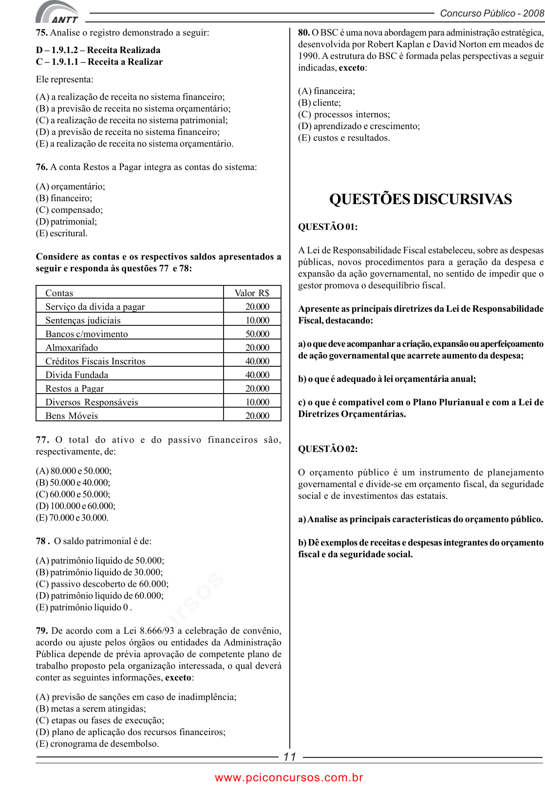 pcimarkpci MDAwMDowMDAwOjAwMDA6MDAwMDowMDAwOmZmZmY6OGE2MTo2ZGQ2:VGh1LCAwMiBKYW4gMjAyNSAxMDo1NjoxOCAtMDMwMA== www.pciconcursos.com.br Concurso Público - 2008 11 75. Analise o registro demonstrado a seguir: D – 1.9.1.2 – Receita Realizada C – 1.9.1.1 – Receita a Realizar Ele representa: (A) a realização de receita no sistema financeiro; (B) a previsão de receita no sistema orçamentário; (C) a realização de receita no sistema patrimonial; (D) a previsão de receita no sistema financeiro; (E) a realização de receita no sistema orçamentário. 76. A conta Restos a Pagar integra as contas do sistema: (A) orçamentário; (B) financeiro; (C) compensado; (D) patrimonial; (E) escritural. Considere as contas e os respectivos saldos apresentados a seguir e responda às questões 77 e 78: Contas Valor R$ Serviço da dívida a pagar 20.000 Sentenças judiciais 10.000 Bancos c/movimento 50.000 Almoxarifado 20.000 Créditos Fiscais Inscritos 40.000 Dívida Fundada 40.000 Restos a Pagar 20.000 Diversos Responsáveis 10.000 Bens Móveis 20.000 77. O total do ativo e do passivo financeiros são, respectivamente, de: (A) 80.000 e 50.000; (B) 50.000 e 40.000; (C) 60.000 e 50.000; (D) 100.000 e 60.000; (E) 70.000 e 30.000. 78 . O saldo patrimonial é de: (A) patrimônio líquido de 50.000; (B) patrimônio líquido de 30.000; (C) passivo descoberto de 60.000; (D) patrimônio líquido de 60.000; (E) patrimônio líquido 0 . 79. De acordo com a Lei 8.666/93 a celebração de convênio, acordo ou ajuste pelos órgãos ou entidades da Administração Pública depende de prévia aprovação de competente plano de trabalho proposto pela organização interessada, o qual deverá conter as seguintes informações, exceto: (A) previsão de sanções em caso de inadimplência; (B) metas a serem atingidas; (C) etapas ou fases de execução; (D) plano de aplicação dos recursos financeiros; (E) cronograma de desembolso. 80. O BSC é uma nova abordagem para administração estratégica, desenvolvida por Robert Kaplan e David Norton em meados de 1990. A estrutura do BSC é formada pelas perspectivas a seguir indicadas, exceto: (A) financeira; (B) cliente; (C) processos internos; (D) aprendizado e crescimento; (E) custos e resultados. QUESTÕES DISCURSIVAS QUESTÃO 01: A Lei de Responsabilidade Fiscal estabeleceu, sobre as despesas públicas, novos procedimentos para a geração da despesa e expansão da ação governamental, no sentido de impedir que o gestor promova o desequilíbrio fiscal. Apresente as principais diretrizes da Lei de Responsabilidade Fiscal, destacando: a) o que deve acompanhar a criação, expansão ou aperfeiçoamento de ação governamental que acarrete aumento da despesa; b) o que é adequado à lei orçamentária anual; c) o que é compatível com o Plano Plurianual e com a Lei de Diretrizes Orçamentárias. QUESTÃO 02: O orçamento público é um instrumento de planejamento governamental e divide-se em orçamento fiscal, da seguridade social e de investimentos das estatais. a) Analise as principais características do orçamento público. b) Dê exemplos de receitas e despesas integrantes do orçamento fiscal e da seguridade social. www.pciconcursos.com.br pcimarkpci MDAwMDowMDAwOjAwMDA6MDAwMDowMDAwOmZmZmY6OGE2MTo2ZGQ2:VGh1LCAwMiBKYW4gMjAyNSAxMDo1NjoxOCAtMDMwMA== www.pciconcursos.com.br INFORMAÇÕES ADICIONAIS Núcleo de Computação Eletrônica Divisão de Concursos Endereço: Prédio do CCMN, Bloco C Ilha do Fundão - Cidade Universitária - Rio de Janeiro/RJ Caixa Postal: 2324 - CEP 20010-974 Central de Atendimento: (21) 2598-3333 Informações: Dias úteis, de 8 h às 17 h (horário de Brasília) Site: www.nce.ufrj.br/concursos Email: concursoufrj@nce.ufrj.br www.pciconcursos.com.br