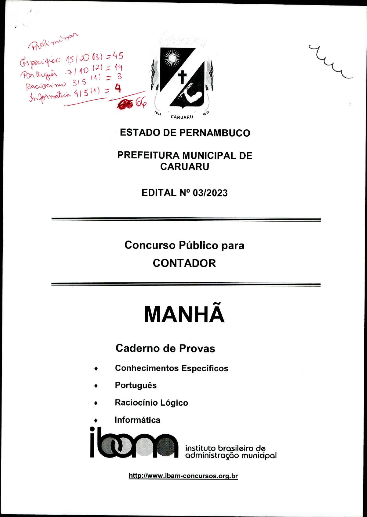 4,8 CARuARU Ígi2":-I•r»tivs‘i kci° 45/j043)::A5 (9.\-b•Art":"' 40 315 14) r 3 JerArrnotx-c- ‘N I (4 ) = 4 ge ESTADO DE PERNAMBUCO PREFEITURA MUNICIPAL DE CARUARU EDITAL N° 03/2023 Concurso Público para CONTADOR MANHÃ Caderno de Provas Conhecimentos Específicos Português Raciocínio Lógico Informática instituto brasileiro de administração municipal http://www.ibam-concursos.orq.br Concurso Público n° 03/2023 Prefeitura Municipal de Caruaru - PE Ensino Superior Completo Duração: 4 horas Você recebeu o seguinte material: Dois cadernos de provas, o primeiro contendo 40 (quarenta) questões de múltipla escolha, numeradas sequencialmente, cada uma apresentando 4 (quatro) alternativas: A, B, C e D. As questões estão assim distribuídas: 01 a 20 - Conhecimentos Específicos, 21 a 30 - Português, 31 a 35 - Raciocínio Lógico e 36 a 40 - Informática. O segundo caderno de prova contendo uma questão dissertativa. Um cartão de respostas. Instruções Verifique se o seu nome e o seu número de inscrição estão corretos no cartão de respostas. Transcreva no espaço indicado no seu cartão-resposta a seguinte frase: Erguendo teu brado forte Verifique se o cargo que consta na capa da sua prova corresponde ao cargo para o qual sua inscrição foi efetivada. Se houver erro, notifique o fiscal. - Assine o cartão de respostas com caneta azul ou preta. - Verifique se a impressão e a numeração das questões estão corretas. Caso ocorra qualquer erro, notifique o fiscal. manchado, nem conter qualquer registro além das respostas assinaladas, de sua assinatura e da frase transcrita. È obrigação do candidato entregar o cartão de respostas assinado. A assinatura deverá coincidir com a do documento de identidade apresentado ao fiscal, sob responsabilidade do candidato. O cartão de respostas não será substituído em hipótese alguma. Exceto quando for comprovado erro do fiscal na entrega do cartão. O cartão de respostas deve ser marcado com caneta esferográfica azul ou preta e o espaço correspondente à letra assinalada totalmente coberto, conforme o modelo abaixo: ® Outras formas de marcação, diferentes da que está determinada acima, farão com que as questões sejam anuladas. Não use lápis ou lapiseira no cartão de respostas antes de utilizar a caneta esferográfica, pois isto também anulará suas respostas. A leitora de marcas não registrará as respostas em que houver falta de nitidez e/ou marcação de mais de uma letra. Após o término da prova, entregue ao fiscal o cartão de respostas devidamente preenchido e assinado e com a frase transcrita. Será de inteira responsabilidade do candidato o preenchimento correto do cartão-resposta, não cabendo aos organizadores eventuais erros ou omissões no preenchimento de todos os campos do cartão (assinatura, frase e respostas). Correto: BOA PROVA! O caderno de provas pode ser utilizado para suas anotações. Não é permitido o uso de calculadora Leia atentamente cada questão e escolha a alternativa que mais adequadamente responde a cada uma delas. Marque sua resposta no cartão de respostas, onde será efetuada a correção. O cartão de respostas não pode ser dobrado, amassado, rasurado ou CONHECIMENTOS ESPECÍFICOS Questão 01 A Administração Financeira e Orçamentária é a disciplina que estuda a atividade financeira do Estado. As finanças do Estado estão diretamente ligadas ao compromisso do governante com a sociedade para a execução de políticas públicas, que se dá por meio do orçamento público. No que diz respeito aos princípios orçamentários, de acordo com o disposto em lei, é correta a seguinte afirmativa: A ( • ) o princípio do equilíbrio estabelece que os valores autorizados para a realização das despesas devem ser compatíveis com os valores previstos para a arrecadação das receitas . . tro exercícios C( financeiros ) compreender D ( ) o princípio da não afetação estabelece que a elaboração do orçamento deve observar as limitações legais em relação aos gastos, às receitas e, em especial, às vedações impostas pela Constituição Federal de 1988 à União, Estados, Distrito Federal e Municípios Questão 02 O modelo orçamentário brasileiro, definido na Constituição Federal de 1988, compõe-se de três instrumentos. Segundo o art. 165. leis de iniciativa do Poder Executivo estabelecerão: A B ( ) as diretrizes orçamentárias que orientam as alterações na legislação tributária C (a) os orçamentos anuais D ( ) aorçainento-praviclanciáriaaascal Questão 03 Uma das principais funções da Lei de Diretrizes Orçamentárias é estabelecer parâmetros necessários à alocação dos recursos no orçamento anual, de forma a garantir, dentro do possível, a realização das metas e objetivos contemplados no PPA. Conforme as normas orçamentárias, é verdadeira a seguinte assertiva sobre a LDO: 7 ( i ( e .• e - o . .. rA4 ( ) incluirá as despesas de capital para o exercício financeiro subsequente ( ) o _ çao ( e) tributária D estabelecerá a política de aplicação das agênciaVeguladoriiyficiais de fomento Questão 04 A Lei Orçamentária da União estima as receitas e fixa as despesas para um exercício financeiro. De um lado, permite avaliar as fontes de recursos públicos no universo dos contribuintes e, de outro, quem são os beneficiários desses recursos. De acordo com o § 50 do art. 165 da Constituição de 1988, a compreenderá: A( ) o a a maioria do capital social com ações com direito a preferência nos dividendos B ( lw) o orçamento da seguridade social, abrangendo todas as entidades e órgãos a ela vinculados, da administração direta ou indireta, bem como os fundos e fundações instituídos e mantidos pelo Poder Público ) o orçamento fiscal referente aos Poderes da União, seus fundos, órgãos e entidades da O administração direta e indireta, inclusive fundações instituídas e mantidas pelo Poder Público D( ) o orai