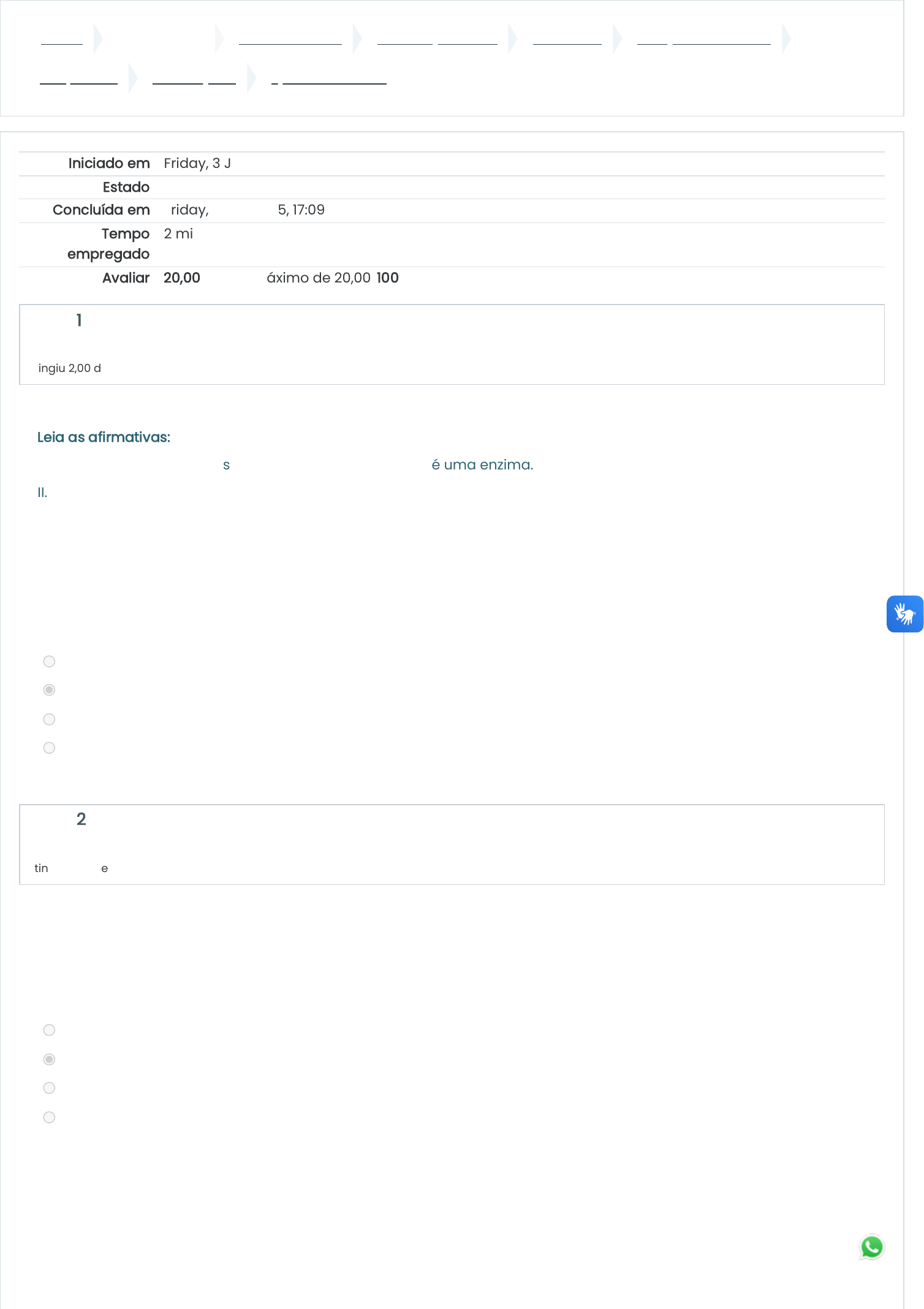 Painel Meus cursos CURSOS FUNEC Graduação - EAD Aluno EAD JUNÇÕES DE TURMA Bioquímica AVALIAÇÕES QUESTIONÁRIO 01 Iniciado em Friday, 3 Jan 2025, 17:07 Estado Finalizada Concluída em Friday, 3 Jan 2025, 17:09 Tempo empregado 2 minutos 22 segundos Avaliar 20,00 de um máximo de 20,00(100%) Questão 1 Completo Atingiu 2,00 de 2,00 Questão 2 Completo Atingiu 2,00 de 2,00 Leia as afirmativas: I. Maioria das enzimas são proteínas e toda proteína é uma enzima. II. Uma das propriedades das enzimas é a especificidade que exibem em relação às reações que catalisam. III. As enzimas são catalisadores que aumentam a velocidade de uma reação química sem que sofram qualquer alteração química permanente. É correto o que se afirmar somente em: Escolha uma opção: a. I, II e III b. II e III c. I e II d. I e III Considerando a nomenclatura dos carboidratos, qual das moléculas abaixo é um carboidrato: Escolha uma opção: a. Ácido ribonucleico b. Triose c. Acetil-CoA d. Hexoquinase 03/01/2025, 16:09 QUESTIONÁRIO 01 https://ava.funec.br/mod/quiz/review.php?attempt=706256&cmid=9497 1/5 https://ava.funec.br/my/ https://ava.funec.br/course/index.php?categoryid=10 https://ava.funec.br/course/index.php?categoryid=17 https://ava.funec.br/course/index.php?categoryid=19 https://ava.funec.br/course/index.php?categoryid=77 https://ava.funec.br/course/view.php?id=461 https://ava.funec.br/course/view.php?id=461#section-6 https://ava.funec.br/mod/quiz/view.php?id=9497 Questão 3 Completo Atingiu 2,00 de 2,00 Questão 4 Completo Atingiu 2,00 de 2,00 Questão 5 Completo Atingiu 2,00 de 2,00 Leia as afirmativas: I. Em uma reação enzimática básica o (S) é o produto e o (P) é o substrato. II. As enzimas diminuem a energia de ativação da reação que estão catalisando, por isso as reações ocorrem em um tempo muito menor. III. São fatores que afetam a atividade de uma enzima, temperatura e pH, somente. É incorreto o que se afirmar somente em: Escolha uma opção: a. I e III b. I, II e III c. II e III d. I e II Quando temos a ligação de duas moléculas de carboidratos, dizemos que essa união se deu pela ligação: Escolha uma opção: a. Peptídica b. Glicosídica c. Covalente de sulfeto d. Éster Leia as afirmativas: I. Os lipídeos são importantes na formação das membranas celulares. II. Muitos lipídeos são estruturas anfipáticas, ou seja, tem características tanto hidrofóbica como hidrofílica. III. Os triacilglicerois é um tipo de lipídeo de armazenamento. É correto o que se afirmar somente em: Escolha uma opção: a. I e II b. II e III c. I, II e III d. I e III 03/01/2025, 16:09 QUESTIONÁRIO 01 https://ava.funec.br/mod/quiz/review.php?attempt=706256&cmid=9497 2/5 Questão 6 Completo Atingiu 2,00 de 2,00 Questão 7 Completo Atingiu 2,00 de 2,00 Leia as afirmativas: I. As ligações de hidrogênio acontecem apenas com as moléculas de água. II. As ligações de hidrogênio é uma atração eletrostática. III. Quando ligamos um hidrogênio ao carbono, formamos uma ligação de hidrogênio. É incorreto o que se afirmar somente em: Escolha uma opção: a. I e II b. II e III c. I e III d. I, II e III Leia as afirmativas: I. Lovastatina é um tipo de lipídeo natural que age inibindo a síntese do colesterol. II. Deficiência dessa vitamina, vitamina E, pode levar a um retardo na coagulação sanguínea. III. O ácido retinóico, derivado da vitamina D, está envolvido na regulação da expressão gênica do tecido epitelial. É incorreto o que se afirmar somente em: Escolha uma opção: a. I e III b. I e II c. I, II e III d. II e III 03/01/2025, 16:09 QUESTIONÁRIO 01 https://ava.funec.br/mod/quiz/review.php?attempt=706256&cmid=9497 3/5 Questão 8 Completo Atingiu 2,00 de 2,00 Questão 9 Completo Atingiu 2,00 de 2,00 Questão 10 Completo Atingiu 2,00 de 2,00 Leia as afirmativas: I. Todo organismo tem grande quantidade de agua em seu organismo, a água é um soluto universal. II. O ângulo formado do hidrogênio e oxigênio na molécula de agua é de 109°. III. Duas moléculas de agua estabelecem uma interação denominada de ligação de hidrogênio. É correto o que se afirmar somente em: Escolha uma opção: a. I e II b. I e III c. I, II e III d. II e III Leia as afirmativas: I. Podemos dizer que alanina é um aminoácido com carga positiva. II. Uma proteína que tenha em sua estrutura 670 resíduos de aminoácidos terá um peso molecular de 73700 Da. III. A vasopressina é funciona como um hormônio atuando na indução do trabalho de parto em gestantes. É incorreto o que se afirmar somente em: Escolha uma opção: a. I e II b. I e III c. I, II e III d. II e III Pensando na razão de C:H:O de uma molécula de carboidrato, uma molécula que tenha 5 carbono, formará: Escolha uma opção: a. C H O b. C H O c. C H O d. C H O 5 5 10 5 2,5 5 5 5 2,5 5 10 5 Manter contato 03/01/2025, 16:09 QUESTIONÁRIO 01 https://ava.funec.br/mod/quiz/review.php?attempt=706256&cmid=9497 4/5 RA (33) 99986-3935 secretariaead@funec.br Baixar o aplicativo móvel. 03/01/2025, 16:09 QUESTIONÁRIO 01 https://ava.funec.br/mod/quiz/review.php?attempt=706256&cmid=9497 5/5 tel:RA (33) 99986-3935 mailto:secretariaead@funec.br https://www.facebook.com/caratingaunec https://twitter.com/caratingaunec https://download.moodle.org/mobile?version=2019052001.02&lang=pt_br&iosappid=633359593&androidappid=com.moodle.moodlemobile