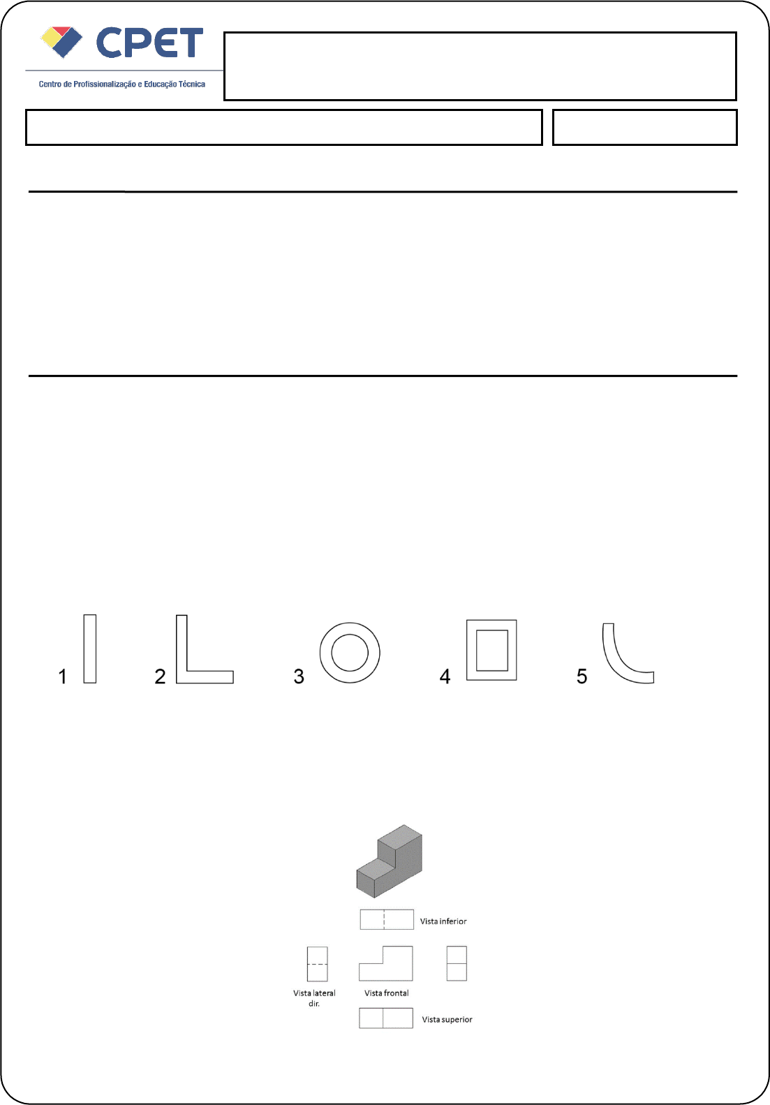 DESENHO TÉCNICO II - SG Aluno (a): Data: INSTRUÇÕES: · Este Laboratório contém questões, totalizando 10 (dez) pontos. · Você deve preencher dos dados no Cabeçalho para sua identificação · Nome / Data de entrega · As perguntas e respostas devem ser retiradas do Roteiro e digitadas logo abaixo. · Ao terminar, grave o arquivo em PDF com o nome do Laboratório Escolhido. · Envio o arquivo pelo sistema. Para os diferentes tipos de perfis metálicos apresentados, partindo da seção transversal, faça o desenho em perspectiva cavaleira com ângulo de 45° . Após isso, escolha um dos objetos e apresente: Visto da direita Visto da esquerda Visto de cima Visto de baixo Considere o fato das peças possuírem um comprimento igual à largura maior. Exemplo: image3.png image1.png image2.png Para os diferentes tipos de perfis metálicos apresentados, partindo da seção transversal, faça o desenho em perspectiva cavaleira com ângulo de 45° . Após isso, e scolha um dos objetos e apresente: Visto da direita Visto da esquerda Visto de cima Visto de baixo Considere o fato das peças possuírem um comprimento igual à largura maior. Exemplo: DESENHO TÉCNICO II - SG Aluno (a): Data: INSTRUÇÕES : v Est e Laboratório contém quest ões , totalizando 10 (dez) pontos. v Você deve preencher dos dados no Cabeçalho para sua identificação o Nome / Data de entrega v As perguntas e respostas devem ser retiradas do Roteiro e digitadas logo abaixo . v Ao terminar , grave o arquivo em PDF com o nome do Laboratório Escolhido . v Envio o arquivo pelo sistema. Para os diferentes tipos de perfis metálicos apresentados, partindo da seção transversal, faça o desenho em perspectiva cavaleira com ângulo de 45° . Após isso, escolha um dos objetos e apresente: Visto da direita Visto da esquerda Visto de cima Visto de baixo Considere o fato das peças possuírem um comprimento igual à largura maior. Exemplo: DESENHO TÉCNICO II - SG Aluno (a): Data: INSTRUÇÕES: Este Laboratório contém questões, totalizando 10 (dez) pontos. Você deve preencher dos dados no Cabeçalho para sua identificação oNome / Data de entrega As perguntas e respostas devem ser retiradas do Roteiro e digitadas logo abaixo. Ao terminar, grave o arquivo em PDF com o nome do Laboratório Escolhido. Envio o arquivo pelo sistema.