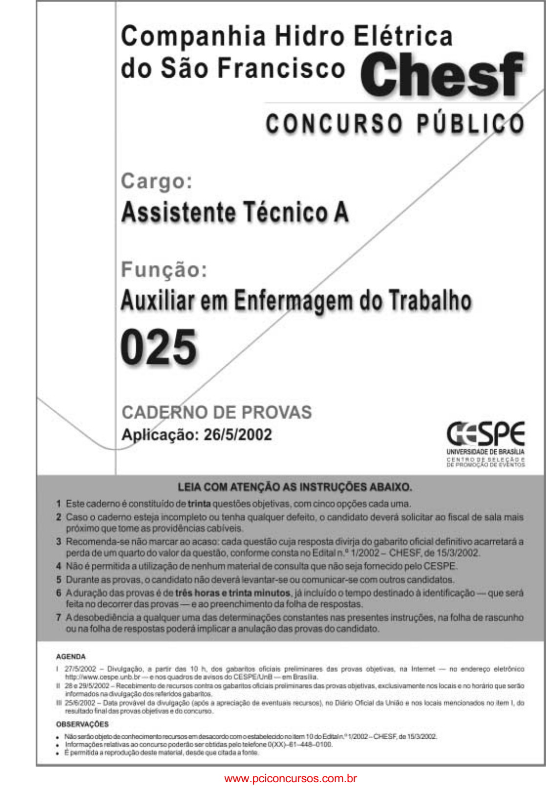 pcimarkpci MjgwNDowZDQ1OmUwMGY6NzAwMDo1OWUwOmVjYzI6ZTgzZjo4MjQz:U2F0LCAwNCBKYW4gMjAyNSAwNzoxMDozMyAtMDMwMA== www.pciconcursos.com.brwww.pciconcursos.com.br pcimarkpci MjgwNDowZDQ1OmUwMGY6NzAwMDo1OWUwOmVjYzI6ZTgzZjo4MjQz:U2F0LCAwNCBKYW4gMjAyNSAwNzoxMDozMyAtMDMwMA== www.pciconcursos.com.br UnB / CESPE – CHESF Concurso Público – Aplicação: 26/5/2002 Cargo: Assistente Técnico A / Função: Auxiliar em Enfermagem do Trabalho – 1 / 10 É permitida a reprodução, desde que citada a fonte. Nas questões de 1 a 30, marque, em cada uma, a única opção correta, de acordo com o respectivo comando. Na folha de respostas, a indicação do campo SR é facultativa e não contará para efeito de avaliação; servirá somente para caracterizar que o candidato desconhece a resposta correta. Use a folha de rascunho para as devidas marcações e, posteriormente, a folha de respostas. LÍNGUA PORTUGUESA QUESTÃO 1 Nosso país detém a confortável posição de possuir 16% da água doce do planeta. Entretanto, já existem no país conflitos pelo uso desse precioso líquido. Quando analisamos a variabilidade ao longo do país, observamos que, nas regiões onde existe maior demanda, a água não está disponível, seja na quantidade ou na qualidade requerida. Essa situação de desequilíbrio negativo entre oferta e demanda e a questão dos usos múltiplos geram situações de conflito que devem ser administradas pelo poder público. A prioridade de uso da água no Brasil é o abastecimento público e a dessedentação de animais, entretanto os outros usos (por exemplo, geração de energia elétrica, irrigação, navegação, abastecimento industrial e lazer, entre outros) não têm suas prioridades definidas. Assim, em situações de conflito de interesse, faz-se necessária a negociação para estabelecer as restrições e compensações entre as partes interessadas. B. Braga. Redefinindo prioridades no uso da água. In: Gazeta Mercantil, 5/2/2002 (com adaptações). Assinale a opção cujo fragmento constitui uma continuação coesa e coerente do texto acima. A Por outro lado, a recente crise de energia elétrica enfatizou para a população em geral a importância de nossos recursos hídricos para a geração de energia no Brasil. B Haveria uma proposta do setor elétrico de utilizar o reservatório de Ilha Solteira até o seu volume mínimo para produzir uma quantidade de energia notável, da ordem de 4.700 MW-mês. C É nesse contexto que a Agência Nacional de Águas, dentro de seu papel de reguladora e mediadora de conflitos de uso, vem atuando, principalmente no que se refere à operação de reservatórios. D Por isso, essa situação era inaceitável pelo setor hidroviário em função da interrupção do transporte e de uma eventual demora na sua retomada. E Ao invés de paralisar, então, o sistema hidroviário, houve um aumento de 26% na carga de grãos transportada, com grande benefício para o setor e para o país. QUESTÃO 2 Hoje, 91% da energia elétrica produzida no Brasil tem origem hidráulica. Ora, em uma situação de crise energética, como a que vivemos, parece claro que tenhamos de rever as prioridades na utilização de nossos recursos hídricos. Exatamente isso foi o que indicou o Comissão de Gestão da Crise em suas resoluções. No caso da disputa entre o setor elétrico e o setor hidroviário na bacia dos rios Tietê e Paraná, houve espaço para uma negociação em que seguramente ambas as partes saíram com resultado positivo. O sistema de geração hidrelétrica da bacia do rio Tietê foi uma das alavancas do desenvolvimento do estado de São Paulo a partir da década de 50. Na década de 90, foi implementada a hidrovia Tietê-Paraná, que foi responsável pela demonstração da viabilidade técnico-econômica desse modo de transporte e de que as águas do Tietê e do Paraná tinham um novo uso a se considerar. A importância da bacia do Paraná para o setor elétrico é notável. Sua capacidade instalada, de aproximadamente 50 milhões de KW, representa 76% da capacidade instalada no país. Idem, ibidem. Assinale a opção que está de acordo com as idéias do texto. A Em situação de crise energética, o setor hidroviário sempre fica prejudicado. B O Brasil é um dos países em que o uso de energia solar ultrapassa o uso da energia hidráulica. C A capacidade instalada de energia elétrica na bacia do Paraná representa 34% da capacidade nacional. D É possível conciliar a geração de energia e o uso hidroviário dos rios. E O desenvolvimento do estado de São Paulo impulsionou a capacidade hidroviária da bacia do Tietê desde a década de 50. QUESTÃO 3 No rio São Francisco, houve conflito entre o setor1 elétrico e o setor de abastecimento doméstico a jusante do reservatório de Funil. Mais de 12 cidades que usavam o Paraíba do Sul como fonte de abastecimento de água tiveram4 seus sistemas garantidos, apesar da necessidade de estocagem de água para geração hidroelétrica no reservatório de Funil. Esse é um caso que indica a extrema oportunidade da criação7 da agência reguladora do uso dos recursos hídricos no Brasil. Em situações de crise, a criatividade dos técnicos é bastante grande e pode prover subsídios para corretas decisões10 políticas. Idem, ibidem. Em relação ao texto acima, assinale a opção incorreta. A Na linha 2, o termo “a” é classificado como preposição. B A palavra “garantidos” (R.5) concorda com “cidades” (R.3). C A língua portuguesa culta aceita como corretas tanto a forma “hidroelétrica” quanto a forma hidrelétrica. D O pronome demonstrativo “Esse” (R.7) é um recurso coesivo, pois retoma as informações de períodos anteriores. E O verbo “prover” (R.10) está sendo utilizado com o sentido de dar, oferecer, fornecer. www.pciconcursos.com.br pcimarkpci MjgwNDowZDQ1OmUwMGY6NzAwMDo1OWUwOmVjYzI6ZTgzZjo4MjQz:U2F0LCAwNCBKYW4gMjAyNSAwNzoxMDozMyAtMDMwMA== www.pciconcursos.com.br UnB / CESPE 