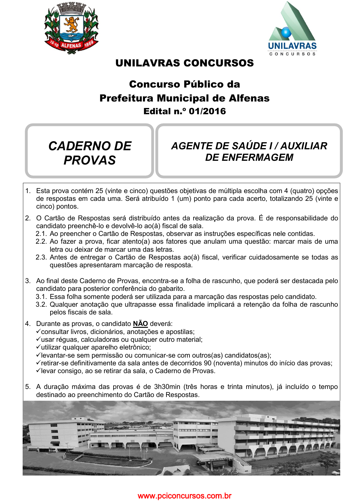 pcimarkpci MjgwNDowZDQ1OmUwMGY6NzAwMDo1OWUwOmVjYzI6ZTgzZjo4MjQz:U2F0LCAwNCBKYW4gMjAyNSAwNzoxMTowMiAtMDMwMA== www.pciconcursos.com.br UNILAVRAS CONCURSOS Concurso Público da Prefeitura Municipal de Alfenas Edital n.º 01/2016 CADERNO DE PROVAS AGENTE DE SAÚDE I / AUXILIAR DE ENFERMAGEM 1. Esta prova contém 25 (vinte e cinco) questões objetivas de múltipla escolha com 4 (quatro) opções de respostas em cada uma. Será atribuído 1 (um) ponto para cada acerto, totalizando 25 (vinte e cinco) pontos. 2. O Cartão de Respostas será distribuído antes da realização da prova. É de responsabilidade do candidato preenchê-lo e devolvê-lo ao(à) fiscal de sala. 2.1. Ao preencher o Cartão de Respostas, observar as instruções específicas nele contidas. 2.2. Ao fazer a prova, ficar atento(a) aos fatores que anulam uma questão: marcar mais de uma letra ou deixar de marcar uma das letras. 2.3. Antes de entregar o Cartão de Respostas ao(à) fiscal, verificar cuidadosamente se todas as questões apresentaram marcação de resposta. 3. Ao final deste Caderno de Provas, encontra-se a folha de rascunho, que poderá ser destacada pelo candidato para posterior conferência do gabarito. 3.1. Essa folha somente poderá ser utilizada para a marcação das respostas pelo candidato. 3.2. Qualquer anotação que ultrapasse essa finalidade implicará a retenção da folha de rascunho pelos fiscais de sala. 4. Durante as provas, o candidato NÃO deverá: consultar livros, dicionários, anotações e apostilas; usar réguas, calculadoras ou qualquer outro material; utilizar qualquer aparelho eletrônico; levantar-se sem permissão ou comunicar-se com outros(as) candidatos(as); retirar-se definitivamente da sala antes de decorridos 90 (noventa) minutos do início das provas; levar consigo, ao se retirar da sala, o Caderno de Provas. 5. A duração máxima das provas é de 3h30min (três horas e trinta minutos), já incluído o tempo destinado ao preenchimento do Cartão de Respostas. www.pciconcursos.com.br pcimarkpci MjgwNDowZDQ1OmUwMGY6NzAwMDo1OWUwOmVjYzI6ZTgzZjo4MjQz:U2F0LCAwNCBKYW4gMjAyNSAwNzoxMTowMiAtMDMwMA== www.pciconcursos.com.br UNILAVRAS Concursos AGENTE DE SAÚDE I / AUXILIAR DE ENFERMAGEM – 3 – Língua Portuguesa QUESTÃO 1) Escolha a alternativa que completa adequadamente a lacuna, dando ao enunciado o sentido de resultar, acarretar: “Liberdade ______________ responsabilidade.” A) implica B) implica com C) implica em D) implica se QUESTÃO 2) “Os alunos preparam-se para cantar o hino nacional”. O termo que substitui adequadamente a palavra “alunos” no enunciado acima é A) docentes. B) estagiários. C) discentes. D) emergentes. QUESTÃO 3) As imagens a seguir são peças da campanha publicitária de um automóvel da empresa Volkswagen. Ambas fazem uso de uma figura de linguagem chamada hipérbole. https://adtudo.wordpress.com/2008/10/03/exagero-uma-forma- de-fixar-a-mensagem/ Tal figura de linguagem confere ao texto, escrito ou imagético, um efeito de A) humor. B) comparação. C) exagero. D) bom gosto. QUESTÃO 4) A campanha publicitária abaixo não traz um texto escrito junto à imagem. Fonte: https://adtudo.wordpress.com/page/15/ Você se sente no alto em um Fox. Você se sente no alto em um Fox. www.pciconcursos.com.br pcimarkpci MjgwNDowZDQ1OmUwMGY6NzAwMDo1OWUwOmVjYzI6ZTgzZjo4MjQz:U2F0LCAwNCBKYW4gMjAyNSAwNzoxMTowMiAtMDMwMA== www.pciconcursos.com.br UNILAVRAS Concursos AGENTE DE SAÚDE I / AUXILIAR DE ENFERMAGEM – 4 – O que nos permite compreender que se trata de um inseticida é, além do frasco aerossol, A) nosso conhecimento prévio. B) nosso conhecimento novo. C) nosso conhecimento atual. D) nosso conhecimento sensível. QUESTÃO 5) Observe os enunciados a seguir: “- A vida é bonita, a música é boa e a alegria é minha”. “- Para ser feliz, tristeza é proibido, alegria é necessário e música é bom”. A concordância nominal no segundo enunciado está A) incorreta, porque o adjetivo deve concordar com o substantivo. B) incorreta, porque o adjetivo se refere a substantivos de sentido genérico/geral. C) correta, porque o adjetivo se refere a substantivos de sentido genérico/geral. D) correta, porque o adjetivo deve concordar com o substantivo. QUESTÃO 6) Os termos “princesinha, conheci- mento, adequação e hilariante” são resultado de A) derivação sufixal. B) derivação prefixal. C) derivação fonética. D) derivação plural. QUESTÃO 7) O texto a seguir é um trecho da música “É fim de mês”, de Raul Seixas. Leia-o: É fim de mês, é fim de mês, é fim de mês, é fim de mês, é [fim de mês! Eu já paguei a conta do meu telefone, Eu já paguei por eu falar e já paguei por eu ouvir. Eu já paguei a luz, o gás, o apartamento Kitnet de um quarto que eu comprei a prestação [pela Caixa Federal, au, au, au, eu não sou cachorro não (não, não, não)! Eu liquidei a prestação do paletó, do meu sapato, da [camisa que eu comprei pra domingar com o meu amor lá no Cristo Redentor, ela gostou (oh!) e mergulhou (oh!) Fonte: www.vagalume.com.br O termo grifado no trecho em questão é A) um verbo comum. B) um substantivo. C) um estrangeirismo. D) um neologismo. QUESTÃO 8) O texto abaixo é um outro recorte da mesma música. Observe: Eu já paguei o Peg-Pag, meu pecado, Mais a conta do rosário que eu comprei pra mim rezar Ave Maria. Conforme a norma-padrão, o uso do pronome pessoal oblíquo na construção do enunciado em questão está A) correto, porque é precedido por uma preposi- ção. B) incorreto, porque a função de sujeito do verbo ‘rezar’ deveria ser exercida pelo pronome eu. C) correto, porque está na frente de um verbo. D) incorreto, porque é precedido por uma preposição. Saúde Pública QUESTÃO 9) O Sistema Único de Saúde (SUS) contará, em esfera municipal, com as seguintes instâncias colegiadas: A) Estratégia Saúde da Família e Secretaria Municipal de Saúde. B) Secretaria Municipal de Saúde e Con