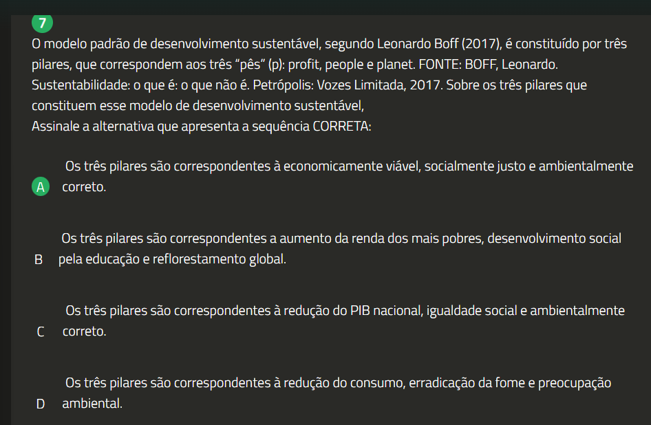 7 modelo padrão de desenvolvimento sustentável, segundo Leonardo Boff (2017), é constituído por três pilares, que correspondem aos três "pês" (p): profit, people e planet. FONTE: BOFF, Leonardo. Sustentabilidade: que é: o que não é. Petrópolis: Vozes Limitada, 2017. Sobre os três pilares que constituem esse modelo de desenvolvimento sustentável, Assinale a alternativa que apresenta a CORRETA: Os três pilares são correspondentes à economicamente viável, socialmente justo e ambientalmente A correto. Os três pilares são correspondentes a aumento da renda dos mais pobres, desenvolvimento social B pela educação e reflorestamento global. Os três pilares são correspondentes à redução do PIB nacional, igualdade social e ambientalmente correto. Os três pilares são correspondentes à redução do consumo, erradicação da fome e preocupação D ambiental.