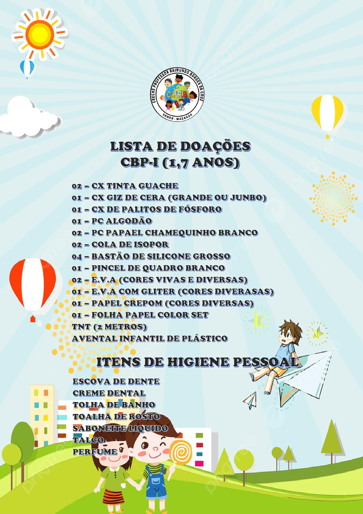 RAIMUNDO SEMED MAZAGAO LISTA DE DOAÇÕES CBP-I (1,7 ANOS) 02 TINTA GUACHE 01 - CX GIZ DE CERA (GRANDE OU JUNBO) 01 CX DE PALITOS DE FÓSFORO 01 PC ALGODÃO 02 - PC PAPAEL CHAMEQUINHO BRANCO 02 COLA DE ISOPOR 04 - BASTÃO DE SILICONE GROSSO 01 - PINCEL DE QUADRO BRANCO 02 - E.V.A (CORES VIVAS E DIVERSAS) 01 - E.V.A COM GLITER (CORES DIVERASAS) 01 - PAPEL CREPOM (CORES DIVERSAS) 01 - FOLHA PAPEL COLOR SET TNT (2 METROS) AVENTAL INFANTIL DE PLÁSTICO ITENS DE HIGIENE PESSOAL ESCOVA DE DENTE CREME DENTAL TOLHA DE BANHO TOALHA DE ROSTO SABONEITE TALCO PERFUMEC.P.R.B RAIMUNDO SEMED MAZAGAO LISTA DE DOAÇÕES CBP-II (2 ANOS) CX TINTA GUACHE 01 - CX GIZ DE CERA (GRANDE OU JUNBO) CX DE PALITOS DE FÓSFORO 01 PC ALGODÃO 02 - PC PAPAEL CHAMEQUINHO BRANCO 02 - COLA DE ISOPOR 04 - BASTÃO DE SILICONE GROSSO 01 PINCEL DE QUADRO BRANCO 02 - E.V.A (CORES VIVAS E DIVERSAS) 01 - E.V.A COM GLITER (CORES DIVERASAS) 01 - PAPEL CREPOM (CORES DIVERSAS) 01 - FOLHA PAPEL COLOR SET TNT (2 METROS) AVENTAL INFANTIL DE PLÁSTICO ITENS DE HIGIENE PESSOAL ESCOVA DE DENTE CREME DENTAL TOLHA DE BANHO TOALHA DEROSTO SABONEITE LIQUIDOC.P.R.B RAIMUNDO SEMED MAZAGAO LISTA DE DOAÇÕES CBP-III (3 ANOS) 02 CX TINTA GUACHE 01 - CX GIZ DE CERA (GRANDE OU JUNBO) 01 DE PALITOS DE FÓSFORO 01 - PC ALGODÃO 02 - PC PAPAEL CHAMEQUINHO BRANCO 02 - COLA DE ISOPOR 04 BASTÃO DE SILICONE GROSSO 01 PINCEL DE QUADRO BRANCO 02 - E.V.A (CORES VIVAS E DIVERSAS) 01 - E.V.A COM GLITER (CORES DIVERASAS) 01 PAPEL CREPOM (CORES DIVERSAS) 01 - FOLHA PAPEL COLOR SET TNT (2 METROS) AVENTAL INFANTIL DE PLÁSTICO ITENS DE HIGIENE PESSOAL ESCOVA DE DENTE CREME DENTAL TOLHA DE BANHO TOALHA DE ROSTO SABONEITE LIQUIDO