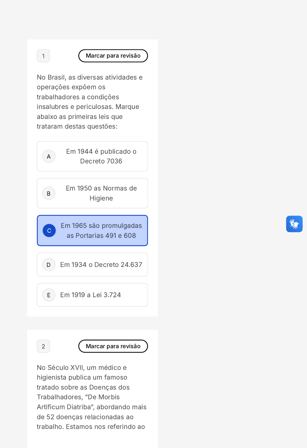 A B C D E 1 Marcar para revisão No Brasil, as diversas atividades e operações expõem os trabalhadores a condições insalubres e periculosas. Marque abaixo as primeiras leis que trataram destas questões: Em 1944 é publicado o Decreto 7036 Em 1950 as Normas de Higiene Em 1965 são promulgadas as Portarias 491 e 608 Em 1934 o Decreto 24.637 Em 1919 a Lei 3.724 2 Marcar para revisão No Século XVII, um médico e higienista publica um famoso tratado sobre as Doenças dos Trabalhadores, “De Morbis Artificum Diatriba”, abordando mais de 52 doenças relacionadas ao trabalho. Estamos nos referindo ao A B C D E A B “Pai da Medicina do Trabalho”. Quem é ele? Frank Bird Talles de Mileto Bernardo Ramazzini Bernardini Franco di Piazza Hipócrates 3 Marcar para revisão A Norma Regulamentadora NR 1, é uma NR de gestão, onde as empresas deverão implementar o Programa de Gerenciamento de Riscos – PGR. Desta forma, quais os riscos abordados por esta NR para a sua elaboração? Físicos, químicos, biológicos, ergonômicos e de acidentes Apenas os físicos, químicos e biológicos C D E Os riscos de acidentes que geram os afastamentos dos trabalhadores Os riscos físicos e ergonômicos Apenas os riscos ergonômicos e de acidentes 4 Marcar para revisão Uma portaria é um ato administrativo emitido por uma autoridade ou órgão público, geralmente com o objetivo de regulamentar procedimentos internos, definir normas, estabelecer regras ou tomar decisões sobre assuntos específicos dentro de sua competência legal. Em relação a Portaria 3.214 publicada em 08 de junho de 1978 pelo Ministério do Trabalho e Emprego, marque a alternativa correta: A B C D E Após a sua publicação os acidentes de trabalho reduziram a números expressivos no Brasil As empresas nacionais passaram a garantir a isenção de riscos nos ambientes de trabalho O Brasil passou a ser um dos Países mais prevencionistas no mundo Houve uma redução significativa dos afastamentos previdenciários decorrentes dos acidentes e das doenças ocupacionais A Portaria 3.214 com as Normas Regulamentadoras exigem das empresas os cumprimentos legais mas não garantem a isenção dos riscos 5 Marcar para revisão Muitas definições em Segurança do Trabalho são fundamentais para que os trabalhadores e seus gestores possam compreender os possíveis enquadramentos dos eventos. Neste sentido, podemos A B C D E A B caracterizar um quase acidente como sendo: Acidente Incidente Desvio Doença Risco 6 Marcar para revisão A Segurança do Trabalho é uma das formas de garantir o equilíbrio entre os trabalhadores e suas atividades laborais. Desta forma, qual o objetivo da segurança do trabalho? Proteger os trabalhadores e garantir que não ocorrerá acidentes no ambiente de trabalho Segurança é a isenção de todo e qualquer risco Questão 9 de 9 Respondidas �9� Em branco �0� Finalizar exercícios 1 2 3 4 5 6 7 8 9 Lista de exercícios Introduç… Sair e finalizar depois C D E A B C Preparar ordens de serviço para punir os trabalhadores que não seguirem regras Bonificar os trabalhadores pelos resultados acidentários Elaborar propostas eficientes para reduzir a probabilidade de danos aos trabalhadores 7 Marcar para revisão De acordo com a Pirâmide de Eventos de Frank Bird, temos os enquadramentos de incidentes, acidentes, acidentes de trabalho e acidentes graves e fatais. Desta forma, podemos caracterizar um incidente como sendo: Uma atividade emergencial Um elemento que interage com saúde e segurança do trabalho Uma fonte ou situação potencial de dano D E A B C D E Uma advertência não rotineira Uma ocorrência, evento ou situação que resulte em dano ou perda 8 Marcar para revisão Na ocorrência de um acidente com um trabalhador, seja de natureza típica ou por algum tipo de doença relacionada ao trabalho, a empresa deverá, obrigatoriamente: Punir o trabalhador por seu comportamento inseguro Demitir o trabalhador por justa causa Emitir a Comunicação de Acidente de Trabalho Afastar o trabalhador preventivamente por 120 dias Paralisar as suas atividades no setor em que ocorreu o acidente até a chegada do Ministério do Trabalho A B C D E 9 Marcar para revisão Muitas metodologias preventivas em um Sistema de Gestão de Segurança e Saúde Ocupacional são efetivos e visam contribuir de forma coletiva ou individual para as melhores condições para os trabalhadores. Neste sentido é correto bonificar trabalhadores que não sofrem acidentes de trabalho? Sim, são ações motivadoras para que eles se previnam corretamente Sim, as empresas poderão reduzir os afastamentos e perdas no trabalho Não, pois os registros serão omitidos, o que poderá gerar novos e mais graves acidentes Não, pois irá encarecer a folha de pagamento da empresa Sim, pois criará uma saudável disputa na empresa para os recebimentos dos bônus