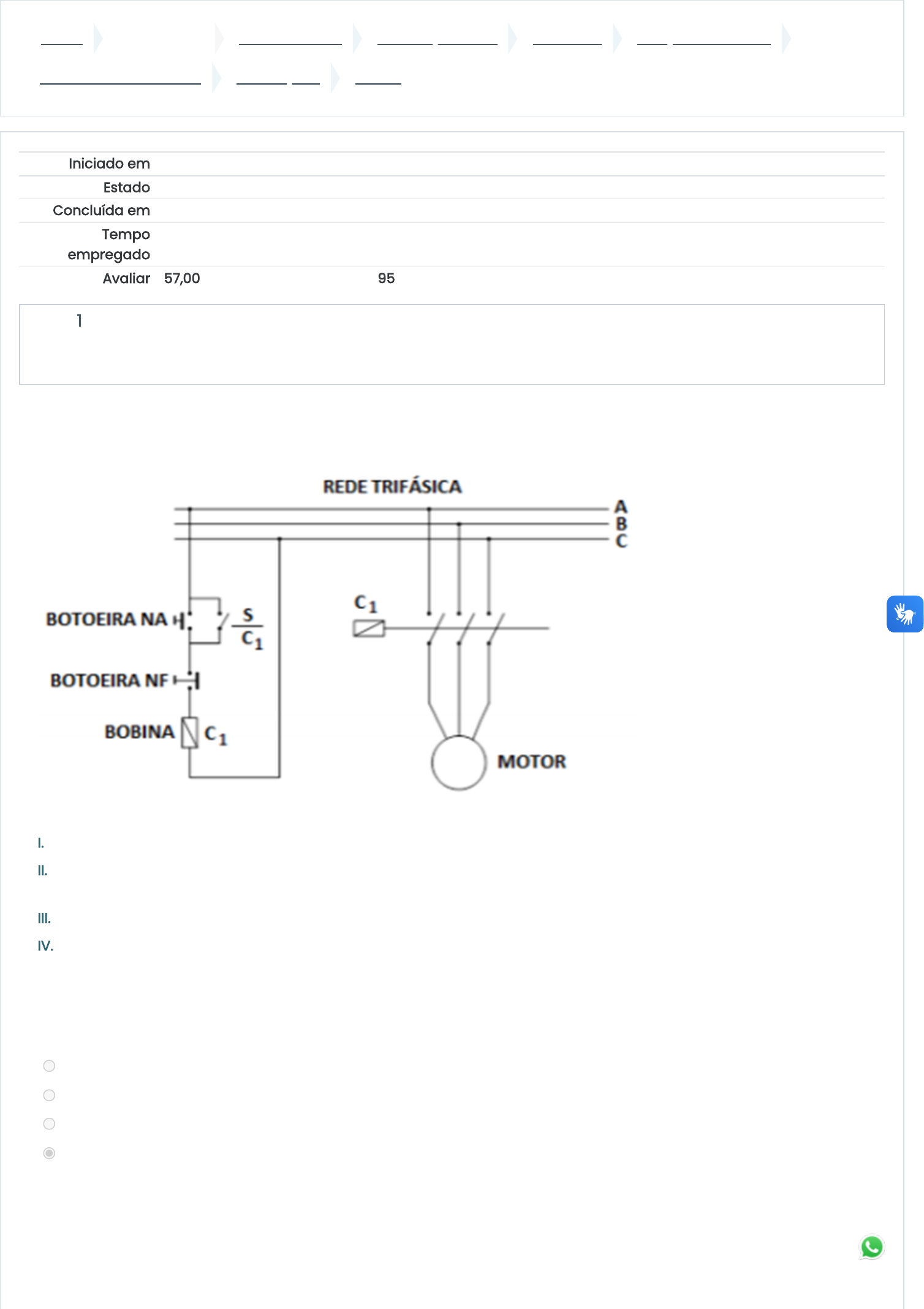 Painel Meus cursos CURSOS FUNEC Graduação - EAD Aluno EAD JUNÇÕES DE TURMA Acionamentos Elétricos AVALIAÇÕES PROVA Iniciado em Thursday, 22 Aug 2024, 13:34 Estado Finalizada Concluída em Thursday, 22 Aug 2024, 14:08 Tempo empregado 33 minutos 58 segundos Avaliar 57,00 de um máximo de 60,00(95%) Questão 1 Completo Atingiu 3,00 de 3,00 Analise o diagrama multifilar de comando e de força para acionamento de um motor de indução trifásico, mostrado na figura a seguir: A respeito do diagrama, analise as afirmativas a seguir: I. O motor é ligado pela botoeira NA. II. O contato S/C1 é responsável pelo selo da botoeira NA e permite que o motor permaneça acionado mesmo quando o operador parar de pressionar a botoeira NA. III. O motor é desligado pela botoeira NF. IV. Trata-se do método de partida direta. Conclui-se que: Escolha uma opção: a. Apenas as afirmativas I e III estão corretas; b. Apenas as afirmativas II e IV estão corretas; c. Apenas a afirmativa IV está correta; d. Todas as afirmativas estão corretas; 22/08/2024, 14:08 PROVA https://ava.funec.br/mod/quiz/review.php?attempt=649488&cmid=23934 1/11 https://ava.funec.br/my/ https://ava.funec.br/course/index.php?categoryid=10 https://ava.funec.br/course/index.php?categoryid=17 https://ava.funec.br/course/index.php?categoryid=19 https://ava.funec.br/course/index.php?categoryid=77 https://ava.funec.br/course/view.php?id=2011 https://ava.funec.br/course/view.php?id=2011#section-2 https://ava.funec.br/mod/quiz/view.php?id=23934 Questão 2 Completo Atingiu 3,00 de 3,00 Questão 3 Completo Atingiu 3,00 de 3,00 Analise as afirmativas abaixo, sobre os contatores auxiliares: ( ) Possuem câmara de extinção de arco elétrico e são capazes de interromper correntes elétricas de valores elevados. ( ) Possuem contatos do tipo NA e/ou NF, que comutam através da dilatação de elementos bimetálicos. ( ) São utilizados nos circuitos de comando e sinalização. ( ) O seu dimensionamento dependerá da corrente nominal do motor. ( ) Não podem ser utilizados em circuitos de força para a alimentação de motores. Identificando com um “V” as afirmativas que são VERDADEIRAS e com um “F” as afirmativas que são FALSAS, assinale a seguir a alternativa correta, na sequência de cima para baixo: Escolha uma opção: a. F, F, V, F, V b. F, V, V, F, F c. V, V, F, V, V d. V, F, V, F, F Com relação à partida de motor estrela-triângulo, considere as seguintes afirmativas: I. O princípio deste método de partida consiste em acionar o motor ligando os seus enrolamentos em estrela à tensão da rede correspondente à ligação triângulo, o que equivale a dividir a tensão sobre os enrolamentos do motor por 1,73, e dessa forma a corrente de partida também é dividida por 1,73. II. Um motor 380 V/660V ligado em estrela à tensão nominal de 660 V absorve uma corrente de linha equivalente a 1/3 da corrente na ligação triângulo à 380 V. III. Uma vez que o conjugado de partida é proporcional ao quadrado da tensão de alimentação, ele será equivalente a 1/3 do conjugado de partida direta. É correto afirmar que: Escolha uma opção: a. Apenas a afirmativa III está correta; b. Todas as afirmativas estão corretas; c. Apenas as afirmativas I e II estão corretas; d. Apenas as afirmativas II e III estão corretas; 22/08/2024, 14:08 PROVA https://ava.funec.br/mod/quiz/review.php?attempt=649488&cmid=23934 2/11 Questão 4 Completo Atingiu 3,00 de 3,00 Questão 5 Completo Atingiu 3,00 de 3,00 Sobre a proteção de motores de baixa tensão, analise as afirmativas a seguir: I. Os motores de baixa tensão geralmente são protegidos por relé térmico e fusível. II. Os disjuntores motores são uma alternativa à proteção efetuada por relé térmico e fusível e associam a capacidade de proteção contra sobrecarga, proteção contra curto-circuito e a capacidade de manobra dos motores III. Os dispositivos de proteção instantâneos, como os fusíveis, devem atuar instantaneamente sempre que a corrente ultrapassar a corrente nominal. Conclui-se que: Escolha uma opção: a. Apenas as afirmativas I e III estão corretas; b. Apenas as afirmativas I e II estão corretas; c. Todas as afirmativas estão corretas; d. Apenas as afirmativas II e III estão corretas; Analise o diagrama multifilar de comando e de força para acionamento de um motor de indução trifásico, mostrado na figura a seguir: Com base no diagrama, é correto afirmar que: Escolha uma opção: a. O contato 13/14-K1 possui a função de acionar a lâmpada de sinalização, indicando sobrecarga. b. Uma lâmpada de sinalização está ligada em série com a botoeira S1. c. O esquema de partida usa chave estrela-triângulo. d. A botoeira S0 é utilizada para desligado o motor. 22/08/2024, 14:08 PROVA https://ava.funec.br/mod/quiz/review.php?attempt=649488&cmid=23934 3/11 Questão 6 Completo Atingiu 0,00 de 3,00 Questão 7 Completo Atingiu 3,00 de 3,00 O inversor de frequência é um dispositivo composto por um retificador, um filtro e um inversor formado por seis chaves de estado sólido que podem ser IGBT’s ou tiristores. Analise as afirmativas a baixo a respeito dos inversores de frequência e marque a opção correta: Escolha uma opção: a. Assim como o conjugado, a potência máxima do motor pode ser constante desde a partida até a rotação nominal, desde de que se utilize uma relação constante entre tensão e frequência aplicada. b. Para se manter o fluxo magnético constante e, consequentemente, manter o conjugado constante é necessário que ao se reduzir a frequência aplicada a tensão seja elevada. c. Para frequências acima da nominal o fluxo magnético do motor diminui, pois, elevar a tensão acima do valor nominal para manter o fluxo magnético constante poderia afetar a isolação e vida útil do enrolamento do motor. d. Os inversores de frequência com estratégia de controle vetorial fornecem aos motores uma tensão perfeitamente senoidal e, conseq