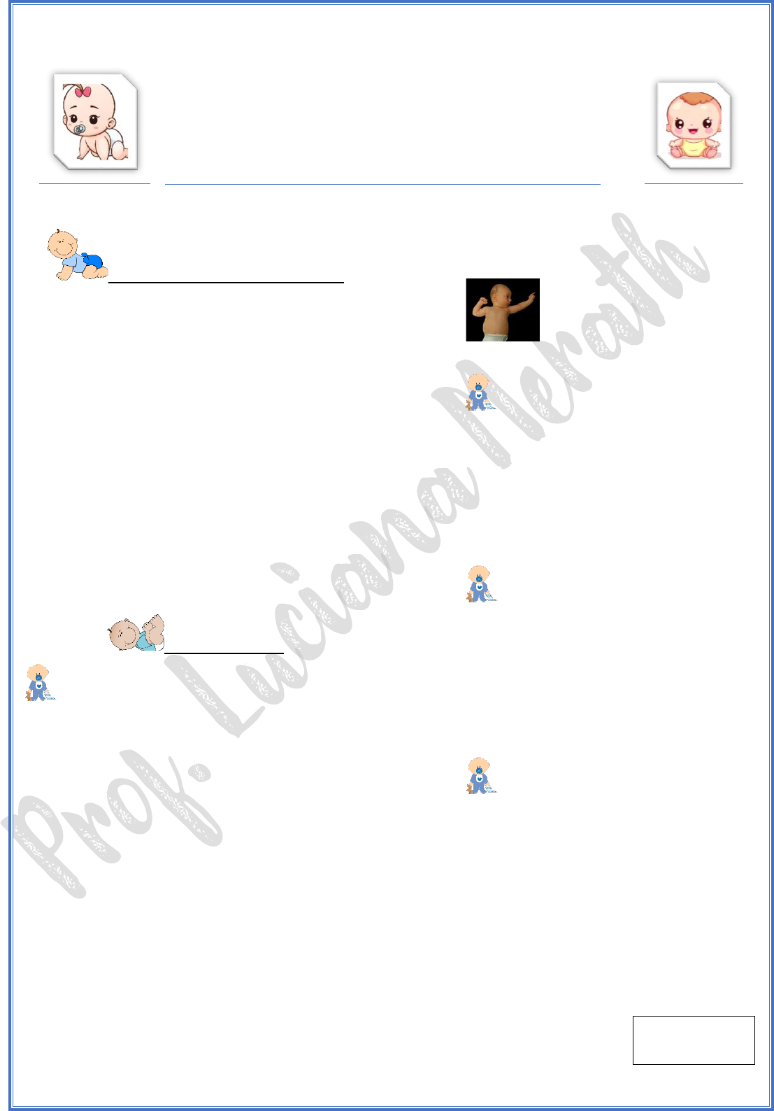 Avaliação Fisioterapêutica Pediátrica Resumo Escala de APGAR: Avaliação de vitalidade de um recém-nascido no 1º e no 5º minuto de vida. Aparência (cor da pele) Pulso (frequência cardíaca) Grimaça (reflexo ao estímulo) Atividade (tônus muscular) Respiração (esforço) Pontuação: 0 a 3- asfixia grave 4 a 6 – asfixia moderada 7 a 10- boa vitalidade Reflexos: RTCA- reflexo tônico cervical assimétrico (reação de magnos) - É produzido quando a cabeça de um recém-nascido é rotacionada para um dos lados na posição supina. Resposta à estimulação dos músculos do pescoço; Ocorre no aumento do tônus extensor dos membros para o lado em que a face está voltada; Também ocorre no aumento do tônus flexor no dimídio correspondente à região occipital. Idade normal de resposta:02 a 4 meses. - Bebê em RTCA Preensão palmar e plantar- estímulo na palma da mão e planta do pé. Resposta esperada: flexão dos dedos. Idade normal de resposta: palmar até 4 meses e plantar 12 meses. Marcha reflexa- segurar e suspender a criança pelo tronco, mas permitindo que ela toque os pés em uma superfície. Idade normal de resposta: nascimento até 2 meses. Reflexo de sucção (fundamental) ou de voracidade- presença de um estímulo tátil nos lábios ou a inserção de um objeto na boca da criança, como uma chupeta ou o próprio dedo do examinador. Resposta esperada: sugar o objeto. Prof. Luciana Merath Reflexo de Galant criança em decúbito ventral, suspenso pelo examinador ou não, o qual realiza um estímulo tátil na região dorso-lateral da criança. O quadril e o tronco da mesma se direcionarão para o lado no qual ocorreu o estímulo, ou seja, será observado um encurtamento do tronco ipsilateral. Desaparece por volta dos 2 meses de vida, o examinador conseguirá avaliar a cintura pélvica da criança. Reflexo de Moro- Queda súbita da cabeça em extensão. - Resposta: Abdução dos MMSS com extensão dos dedos. Idade normal de resposta: 5/6 meses. Reflexo cutâneo-plantar estimular a porção lateral do pé da criança, no sentido proximal-distal. Após realizar esse movimento, será observada a extensão do hálux que, apesar de ser um indicativo de lesão neurológica no adulto, é considerado normal na criança até os 18 meses de vida. Reação de Proteção - com 6 meses para a frente, aos 7 meses para os lados e aos 8 meses para trás. Reação de Landau- Suspende o bebê em prono. Resposta: 4 ou 5 meses (extensão da cabeça e do tronco); 6 a 8 meses (extensão membros inferiores). Reação de Anfíbio - Criança em DV, faz um estímulo na crista ilíaca. - Resposta: a perna do lado estimulado faz uma flexão e abdução. Idade normal de resposta: 4/6 meses Reação Cervical de Retificação - Gira a cabeça do bebê para um lado. Resposta: O bebê vai girar para o mesmo lado em bloco. - Presente ao nascimento, é integrada por volta do sexto mês. Avaliação postural Supino: mãos na linha média? Movimentos ativos de pés e mãos? - Manipula objetos? Prono: Lateraliza a cabeça? Sustentação de cabeça? Puxado para sentar-se: Cabeça acompanha o movimento? Ativação de MMSS e MMII? Sentado: Sustentação de cabeça? Sustentação de tronco? Manipula objetos? Senta-se em posturas diferentes? Quais? Ajoelhado: Controle de tronco De pé: Controle de tronco? Marcha: Lateral? Frontal? Com auxílio? Sem auxílio? Prof. Luciana Merath