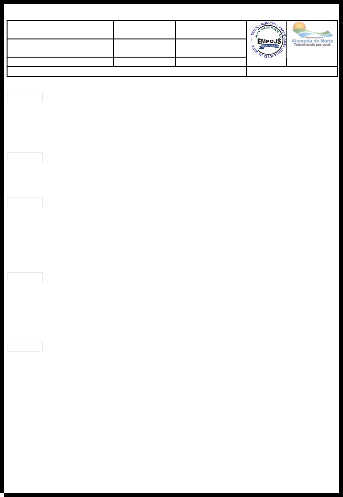 ESCOLA MUNICIPAL PROFESSORA ODÍLIA JUSTA DA SILVA Professor: Carlos Alisson Turno: Matutino Data: / / 2024 1º Corte Temporal Série: 8º Ano Turma: A( ) B( ) C ( ) Coordenadora: Kênia VALOR: 10,0 NOTA: Aluno (a): RECOVERY TEST Questão 1: Complete as sentenças abaixo com "will" ou "going to", conforme apropriado: a) I'm sure she ___ pass her exam. b) Look at those clouds! It ___ rain soon. c) I forgot to buy milk. I ___ buy some on my way home. Questão 2: Escolha a forma correta de usar "will" ou "going to" nas seguintes situações: a) You have a job interview tomorrow. (___ you prepare well?) b) I'm so tired. I think I ___ go to bed early tonight. Questão 3: Qual é a forma correta para completar a sentença abaixo? "I forgot to buy groceries, so I ___ do it on my way home." a) is going to b) will c) going to Questão 4: Escolha a opção que melhor completa a frase: "Look at the time! I ___ miss the bus if I don't hurry up!" a) will b) am going to c) going to Questão 5: Qual é a forma correta para preencher o espaço em branco nesta frase? "I have already decided! I ___ apply for that job." a) going to b) will c) am going to image2.wmf image3.wmf