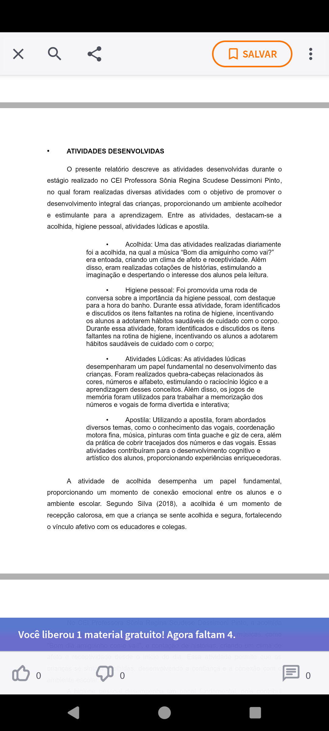 X SALVAR ATIVIDADES DESENVOLVIDAS presente relatório descreve as atividades desenvolvidas durante o estágio realizado no CEI Professora Sônia Regina Scudese Dessimoni no qual foram realizadas diversas atividades com o objetivo de promover o desenvolvimento integral das crianças, proporcionando um ambiente acolhedor e estimulante para a aprendizagem. Entre as atividades, destacam-se a acolhida, higiene pessoal, atividades lúdicas e apostila Acolhida: Uma das atividades realizadas diariamente foi a acolhida, na qual a música "Bom dia amiguinho como vai?" era entoada, criando um clima de afeto e receptividade. Além disso, eram realizadas cotações de histórias, estimulando a imaginação e despertando o interesse dos alunos pela leitura. Higiene pessoal: Foi promovida uma roda de conversa sobre a importância da higiene pessoal, com destaque para a hora do banho. Durante essa atividade, foram identificados e discutidos os itens faltantes na rotina de higiene, incentivando os alunos a adotarem hábitos saudáveis de cuidado com o corpo. Durante essa atividade, foram identificados e discutidos os itens faltantes na rotina de higiene, incentivando os alunos a adotarem hábitos saudáveis de cuidado com o corpo; Atividades Lúdicas: As atividades lúdicas desempenharam um papel fundamental no desenvolvimento das crianças. Foram realizados quebra-cabeças relacionados às números e alfabeto, estimulando o raciocínio lógico e a aprendizagem desses conceitos. Além disso, os jogos de memória foram utilizados para trabalhar a memorização dos números e vogais de forma divertida e Apostila: Utilizando a apostila, foram abordados diversos temas, como o conhecimento das vogais, coordenação motora fina, música, pinturas com tinta guache e giz de cera, além da prática de cobrir tracejados dos números e das vogais. Essas atividades contribuíram para o desenvolvimento cognitivo e artístico dos alunos, proporcionando experiências enriquecedoras. A atividade de acolhida desempenha um papel fundamental, proporcionando um momento de conexão emocional entre os alunos e o ambiente escolar. Segundo Silva (2018), a acolhida é um momento de recepção calorosa, em que a criança se sente acolhida e segura, fortalecendo o vínculo afetivo com os educadores e colegas. Você liberou 1 material gratuito! Agora faltam 4. 0 0 0