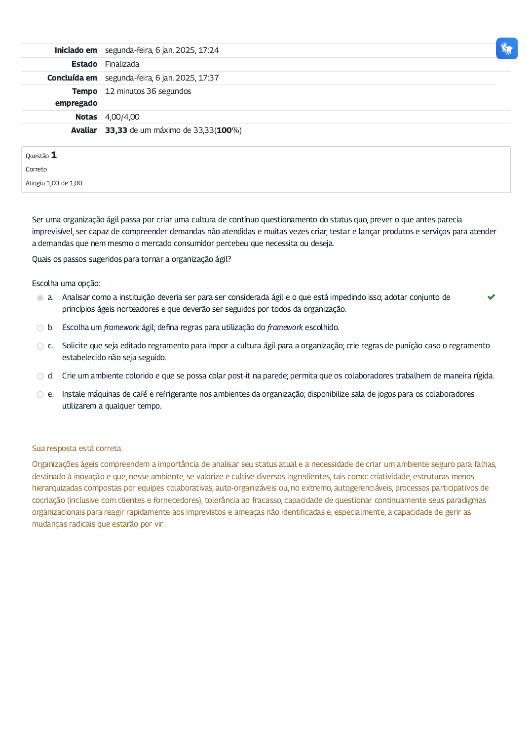 Iniciado em segunda-feira, 6 jan. 2025, 17:24 Estado Finalizada Concluída em segunda-feira, 6 jan. 2025, 17:37 Tempo empregado 12 minutos 36 segundos Notas 4,00/4,00 Avaliar 33,33 de um máximo de 33,33(100%) Questão 1 Correto Atingiu 1,00 de 1,00 Ser uma organização ágil passa por criar uma cultura de contínuo questionamento do status quo, prever o que antes parecia imprevisível, ser capaz de compreender demandas não atendidas e muitas vezes criar, testar e lançar produtos e serviços para atender a demandas que nem mesmo o mercado consumidor percebeu que necessita ou deseja. Quais os passos sugeridos para tornar a organização ágil? Escolha uma opção: a. Analisar como a instituição deveria ser para ser considerada ágil e o que está impedindo isso; adotar conjunto de princípios ágeis norteadores e que deverão ser seguidos por todos da organização. b. Escolha um framework ágil; de�na regras para utilização do framework escolhido. c. Solicite que seja editado regramento para impor a cultura ágil para a organização; crie regras de punição caso o regramento estabelecido não seja seguido. d. Crie um ambiente colorido e que se possa colar post-it na parede; permita que os colaboradores trabalhem de maneira rígida. e. Instale máquinas de café e refrigerante nos ambientes da organização; disponibilize sala de jogos para os colaboradores utilizarem a qualquer tempo. Sua resposta está correta. Organizações ágeis compreendem a importância de analisar seu status atual e a necessidade de criar um ambiente seguro para falhas, destinado à inovação e que, nesse ambiente, se valorize e cultive diversos ingredientes, tais como: criatividade, estruturas menos hierarquizadas compostas por equipes colaborativas, auto-organizáveis ou, no extremo, autogerenciáveis, processos participativos de cocriação (inclusive com clientes e fornecedores), tolerância ao fracasso, capacidade de questionar continuamente seus paradigmas organizacionais para reagir rapidamente aos imprevistos e ameaças não identi�cadas e, especialmente, a capacidade de gerir as mudanças radicais que estarão por vir. Questão 2 Correto Atingiu 1,00 de 1,00 Questão 3 Correto Atingiu 1,00 de 1,00 Os gestores de uma organização indicam que essa tornou-se a organização ágil, pois adotou o framework Scrum como forma de trabalho para execução e gestão de projetos, inclusive obrigou empresa prestadora de serviço que se adequasse ao framework escolhido. O que pode ser a�rmado a partir da análise da situação descrita no trecho acima? Escolha uma opção: a. O fato do Scrum ser aplicado dentro da instituição garante que a a�rmação de que a organização é ágil está correta. b. A adoção de um framework não garante que a organização seja uma organização ágil, a cultura, mentalidade das pessoas e os resultados alcançados pela organização são fundamentais para se a�rmar que uma instituição é ágil. c. Qualquer framework que seja adotado pela instituição garante que a instituição seja ágil, mas deve haver preocupação com adoção do mesmo modelo pelas empresas prestadoras de serviço. d. O Scrum não é um framework ágil, por isso não se pode a�rmar que a instituição seja ágil pelo fato de ter adotado esse framework como forma de executar e gerenciar projetos. e. Agilidade deve ser indicada pelos planos que são elaborados, não há como indicar que a organização é ágil pelo simples fato de adotar o Scrum como framework. Sua resposta está correta. O movimento Ágil propõe alternativa à gestão de projetos tradicional e tem a função de aprimorar o processo de desenvolvimento de um produto ou serviço. O objetivo �nal é fazer entregas com rapidez e com maior frequência, conforme surgem as necessidades do cliente. Entretanto, deve-se observar que determinar a utilização de um framework alinhado com os princípios e valores ágeis não garante que a organização se torne uma ágil. O movimento Ágil é cercado por mitos. Um dos grandes mitos, se não o maior deles, é que esse tipo de abordagem de execução e gestão de projetos só serve para projetos de Tecnologia da Informação. Ser ágil já não é prerrogativa só da tecnologia. O Ágil está sendo aplicada em outras áreas e atividades, desde desenvolvimento de produto até manufatura — a área de Recursos Humanos (RH) é um grande exemplo disso, essa área da organização tem aplicado intensamente os valores e princípios do Ágil em suas práticas. Além do mito citado no trecho acima, existem outros que confundem e devem ser evitados. Qual item traz mitos sobre movimento Ágil? Escolha uma opção: a. O Ágil não requer planejamento, o Ágil é solução para todos os problemas, o Ágil não precisa comprovar benefícios, o Ágil não possui documentação. b. A implementação do Ágil na organização passa por uma adequação da cultura e forma o pensamento dos atores envolvidos. c. O Ágil preza pela interação entre os indivíduos mais que processos e uso de ferramentas. d. O Ágil preza mais por colaboração com o cliente mais que negociação de contratos. e. No movimento Ágil existe a preferência por responder a mudanças mais que seguir um plano. Sua resposta está correta. Alguns dos principais mitos relacionados ao Ágil e o Planejamento de Projetos Ágeis são os mitos de que, no Ágil, não existe um plano de longo prazo, que no Ágil se investe menos tempo de planejamento do que nos métodos tradicionais ou que no Ágil planos podem mudar sem problemas e a qualquer momento. Antes de se implementar o Ágil é importante se atentar para o que é mito e o que é fato no movimento Ágil. Questão 4 Correto Atingiu 1,00 de 1,00 As organizações, cada vez mais, buscam pela modelo Ágil. A crescente popularidade desse modelo, que deve ser visto como um movimento, ocorre principalmente pela sua a�nidade com o cenário atual con�gurado pela transformação d