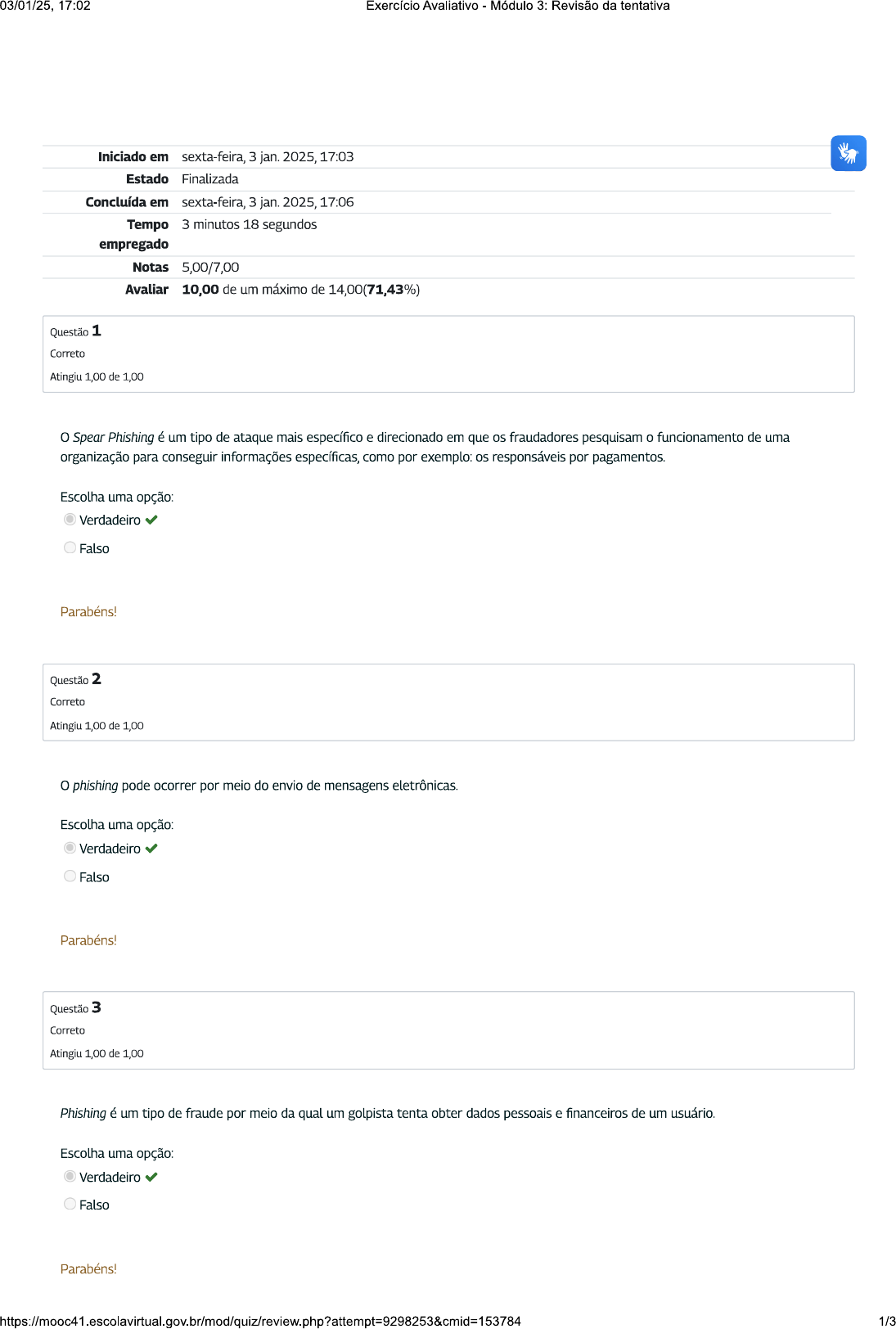 03/01/25, 17:02 Exercício Avaliativo - Módulo 3: Revisão da tentativa Iniciado em sexta-feira, 3 jan. 2025, 17:03 Estado Finalizada Concluída em sexta-feira, 3 jan. 2025, 17:06 Tempo 3 minutos 18 segundos empregado Notas 5,00/7,00 Avaliar 10,00 de um máximo de 14,00(71,43%) Questão 1 Correto Atingiu 1,00 de 1,00 o Spear Phishing é um tipo de ataque mais específico e direcionado em que os fraudadores pesquisam o funcionamento de uma organização para conseguir informações específicas, como por exemplo os responsáveis por pagamentos. Escolha uma opção: Verdadeiro Falso Parabéns! Questão 2 Correto Atingiu 1,00 de 1,00 phishing pode por meio do envio de mensagens eletrônicas. Escolha uma opção: Verdadeiro Falso Parabéns! Questão 3 Correto Atingiu 1,00 de 1,00 Phishing é um tipo de fraude por meio da qual um golpista tenta obter dados pessoais e financeiros de um usuário. Escolha uma opção: Verdadeiro Falso Parabéns! 1/303/01/25, 17:02 Exercício Avaliativo - Módulo 3: Revisão da tentativa Questão 4 Correto Atingiu 1,00 de 1,00 A palavra phishing, do inglês "fishing", vem de uma analogia criada na qual "iscas" (mensagens eletrônicas) são usadas para "pescar" informações de usuários e organizações. Escolha uma opção: Verdadeiro Falso Parabéns! Questão 5 Incorreto Atingiu 0,00 de 1,00 atacante de phishing pode utilizar-se de domínios conhecidos (exemplo: gov.br; org.br). Escolha uma opção: Verdadeiro Falso x É possível se passar por remetentes legítimos. Questão 6 Correto Atingiu 1,00 de 1,00 phishing pode ocorrer por meio do envio de mensagens eletrônicas. É incorreto afirmar que essas mensagens: Escolha uma opção: a. Geralmente trazem alertas de que a não execução dos procedimentos descritos pode acarretar sérias consequências, como a inscrição em serviços de proteção de crédito e o cancelamento de um cadastro, de uma conta bancária ou de um cartão de crédito. b. Não existem formas de um usuário identificar Afirmativa está incorreta. No texto da aula, foram relacionadas indícios de uma mensagem de phishing sem a ajuda as diferentes maneiras de como o usuário pode identificar uma de uma ferramenta de segurança. mensagem de phishing. Parabéns! C. Tentam se passar pela comunicação oficial de uma instituição conhecida, como: um banco, uma empresa ou um site popular. d. Procuram a atenção do usuário, seja por curiosidade, por caridade ou pela possibilidade de obter alguma vantagem financeira. Sua resposta está correta. https://mooc41.escolavirtual.gov.br/mod/quiz/review.php?attempt=9298253&cmid=153784 2/303/01/25, 17:02 Exercício Avaliativo - Módulo 3: Revisão da tentativa Questão 7 Incorreto Atingiu 0,00 de 1,00 Sobre phishing, é incorreto que: Escolha uma opção: a. Alguns golpes são aplicados por mensagem eletrônica contendo promoções, facilidades, brindes ou ofertas. b. Mensagens SMS são sempre confiáveis por utilizarem meios seguros de comunicação das operadoras de telefonia. C. Não é recomendável responder mensagens eletrônicas que Afirmativa está correta, pois essas mensagens podem solicitam informações financeiras. ser ataques de phishing. d. Essas fraudes podem ser aplicadas em redes sociais, como Facebook e Twiter, por exemplo. Sua resposta está incorreta. 3/3
