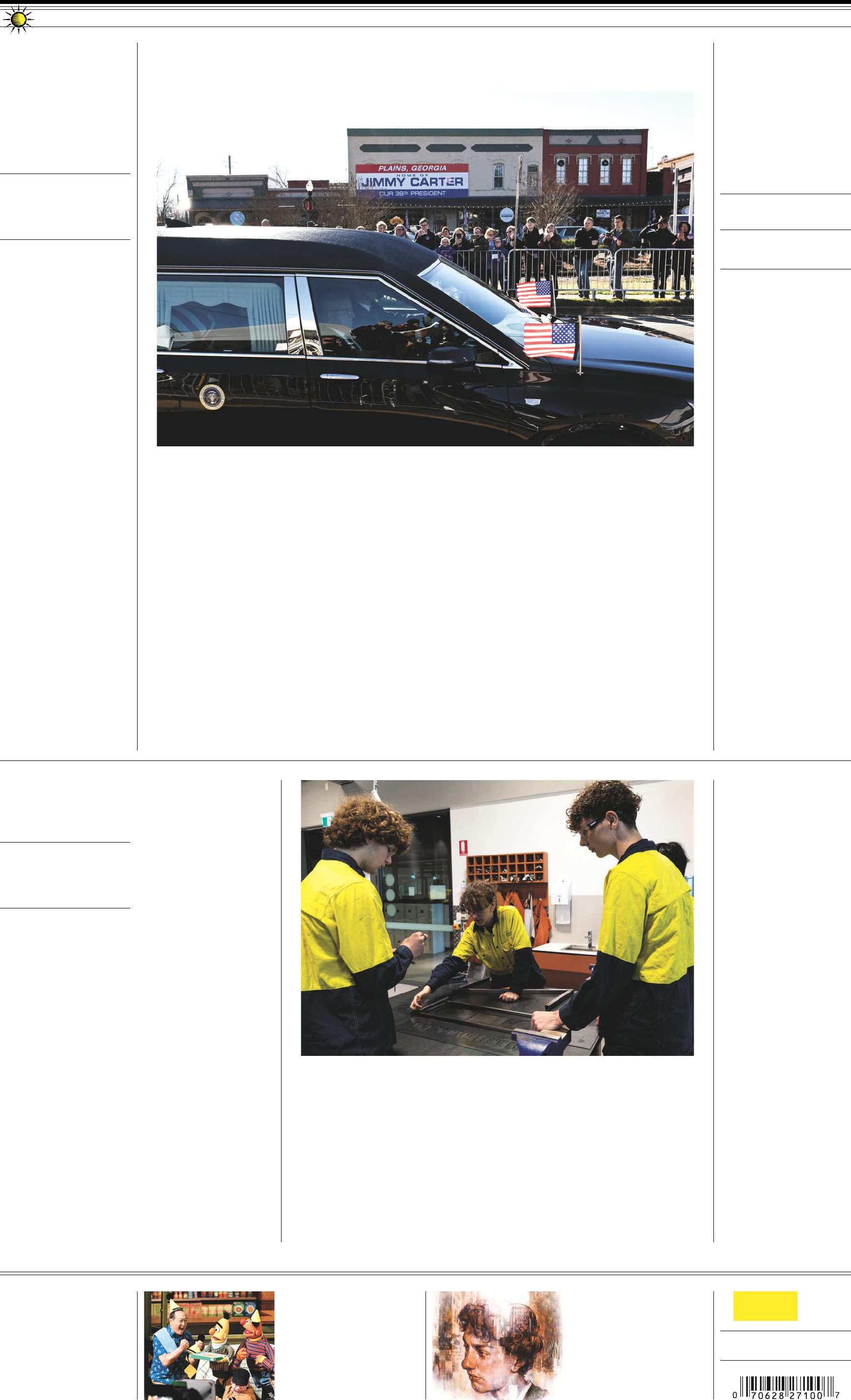 Book WorlD adam Ross’s novel about a n.y. teen’s fateful year is worth the long wait. BuSInESS Boeing’s 2024 plans came unhinged, starting with four missing bolts. arTS & STylE inside “sesame street” as the venerable tV show fights to survive. TravEl Florida glamping with cats awaits at (wait for it) purradise springs. METro d.c. is on a heightened security footing ahead of trump’s inauguration. SporTS When he’s on the run, Jayden daniels is as dangerous as it gets. CONTENT © 2025 The Washington Post / Year 148, No. 54087 7 $240 sunday cOupOn insERts Center in americus, about 10 miles from his hometown, where his body had been since his death Dec. 29 at age 100. under a crystal-clear sky, Cart- er’s casket, draped in an american flag, was escorted by current and former members of his secret service detail to a waiting hearse. it was a detail the late president had requested to honor those who had protected him and his family over the decades, and who were considered “lifelong friends,” ac- cording to memorial organizers. Watching were several mem- bers of the Carter family, including his children, Jack, Chip, Jeff and amy, in their first public appear- ance since their father’s death. among those observing the ceremony were dozens of hospital employees. the small rural sEE cArTer ON A7 BY HOLLY BAILEY, LORI ROZSA AND JIM LYNN iN atlaNta the nation began its formal farewell to Jimmy Carter on satur- day, as the casket carrying the former president started its jour- ney along the rural roads of south Georgia, where he spent much of his life, and onward to atlanta, where his body will lie in public repose ahead of a state funeral in Washington this week. the events marked the first of a multiday celebration of Carter, who died last sunday at his home in Plains, the tiny town of his childhood and the launchpad for his storied political career. after a painful defeat in the 1980 election that ousted him from the White House, he returned there with wife rosalynn and reinvented himself as global humanitarian and champion of democracy. residents of Plains and admir- ers from afar turned out to honor him saturday morning. Carter’s casket emerged shortly after 10:20 a.m. from Phoebe sumter Medical Carter’s final trip begins in the place where it all started Neighbors bid farewell as the 39th president’s motorcade winds through rural Georgia: ‘He was one of us before he became one for everyone’ Matt Mcclain/thE WashingtOn pOst In 1980: Moscow Olympics boycott left american athletes stunned. D1 The hearse carrying the casket of former president Jimmy carter passes through his hometown of plains, Georgia, on saturday on its way to Atlanta. MichaEl E. MillER/thE WashingtOn pOst O llie Filipponi always thought he’d be an electri- cian. But then the 16-year- old started at Findon technical College, a new high school where the curriculum is partly designed by a defense contractor and the welding bays are modeled on those at the local naval shipyard. Now the curly-haired teen dreams of building nuclear- powered submarines. “that’s way cooler than wiring houses,” he said. Ollie is one of the early benefi- ciaries of auKus, the trilateral security pact in which the united states and the united Kingdom are helping australia build nuclear-propelled submarines to counter China’s growing military sEE subMArInes ON A16 Australia, wary of China, dives into preparations for building nuclear subs BY MICHAEL E. MILLER iN aDElaiDE, australia from left, Ollie filipponi, Isla Taylor and Matt Goldsworthy do a metalworking project at findon Technical college. BY SHANNON NAJMABADI AND TRISHA THADANI Video footage and other data collected by tesla helped law enforcement quickly piece to- gether how a Cybertruck came to explode outside the trump inter- national Hotel in las Vegas on New Year’s Day. the trove of digital evidence also served as a high-profile dem- onstration of how much data modern cars collect about their drivers and those around them. Data privacy experts say the investigation — which has deter- mined that the driver, active-duty u.s. army soldier Matthew liv- elsberger, died by suicide before the blast — highlights how car companies vacuum up reams of data that can clear up mysteries but also be stolen or given to third parties without drivers’ knowl- edge. there are few regulations controlling how and when law enforcement authorities can ac- cess data in cars, and drivers are often unaware of the vast digital trail they leave behind. “these are panopticons on wheels,” said albert Fox Cahn, who founded the surveillance technology Oversight Project, an advocacy group that argues the sEE DATA ON A12 In Cybertruck blast’s wake, unease at cars’ data collection ABCDE Prices may vary in areas outside metropolitan Washington. RE V1 V2 V3 V4 Democracy Dies in Darkness sunday, january 5, 2025 . $6Breezy 38/27 • Tomorrow: Cold with snow 30/23 C8 BY MARIANNE LEVINE Days before his second inaugu- ration, President-elect Donald trump faces the uncomfortable prospect of appearing — in per- son or virtually — before a New York state judge to be sentenced for his 34 felony convictions for falsifying business records to cov- er up a hush money payment to an adult-film actress. the court appearance, sched- uled for Friday, offers yet another reminder of the legal woes that dogged trump as he mounted his third bid for the White House. it also cements a distinction that he shares with none of his predeces- sors: He will be the first serving president who is also a felon. No previous president has been con- victed of a felony, let alone sum- moned before a judge just days before their inauguration. While New York supreme Court Justice Juan Merchan said he will not sentence trump to jail time, the appearance will be an opportunity for the judge to de- nounce what he has called the “premeditated and continuous deception by the leader of the free world.” “it