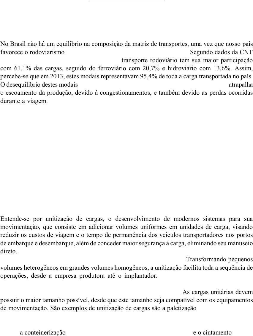 TRANSPORTES – LISTA 2 1. No Brasil, há um equilíbrio na composição da matriz de transportes? Como isso influencia na eficiência do transporte de cargas/passageiros? No Brasil não há um equilíbrio na composição da matriz de transportes, uma vez que nosso país favorece o rodoviarismo em detrimento de outros meios de locomoção. Segundo dados da CNT (Confederação Nacional dos Transportes), o transporte rodoviário tem sua maior participação com 61,1% das cargas, seguido do ferroviário com 20,7% e hidroviário com 13,6%. Assim, percebe-se que em 2013, estes modais representavam 95,4% de toda a carga transportada no país. O desequilíbrio destes modais é muito prejudicial ao crescimento do Brasil, uma vez que atrapalha o escoamento da produção, devido à congestionamentos, e também devido as perdas ocorridas durante a viagem. Ou seja, fez-se necessário um melhor dimensionamento com a utilização de modais com custos menores, que poderão gerar maior competitividade aos produtos brasileiros. 2. Qual a diferença entre transporte unimodal, intermodal e multimodal? O unimodal envolve somente um meio de transporte. O multimodal é o sistema onde a mercadoria é transportada por mais de um modo de transporte, sob responsabilidade de um único operador, legal e contratual. Já o intermodal é o sistema onde a mercadoria é transportada por mais de um modo de transporte, por diferentes operadores que são responsáveis, cada qual, pelo seu trecho. 3. O que é a unitização de cargas? Qual sua importância? Cite dois exemplos de unitização de cargas. Entende-se por unitização de cargas, o desenvolvimento de modernos sistemas para sua movimentação, que consiste em adicionar volumes uniformes em unidades de carga, visando reduzir os custos de viagem e o tempo de permanência dos veículos transportadores nos portos de embarque e desembarque, além de conceder maior segurança à carga, eliminando seu manuseio direto. Ao se reacomodar a carga solta em carga unitizada, são visíveis os ganhos de produtividade em tempo, espaço e custos que se podem obter mediante a utilização. Transformando pequenos volumes heterogêneos em grandes volumes homogêneos, a unitização facilita toda a sequência de operações, desde a empresa produtora até o implantador. E isto implica custos menores de capatazia portuária e maior segurança quanto à integridade das mercadorias, além de ser condição primordial para um melhor rendimento do transporte internacional. As cargas unitárias devem possuir o maior tamanho possível, desde que este tamanho seja compatível com os equipamentos de movimentação. São exemplos de unitização de cargas são a paletização (uso de pallets como suportes de cargas que ficam atadas a estes, os quais, possuem vãos em sua parte inferior de modo a permitir o encaixe dos garfos das empilhadeiras, gerando uma otimização no manuseio da carga), a conteinerização (uso de conteiners para o transporte das cargas) e o cintamento (onde a carga é condicionada em redes especiais de nylon ou corda, de forma a proporcionar fácil manuseio por guindastes, permitindo o aumento da velocidade de carregamento e descarregamento). 4. O que são custos fixos e variáveis, tratando-se de modos de transportes? 1511 MXTI Realce 1511 MXTI Realce 1511 MXTI Realce 1511 MXTI Realce 1511 MXTI Realce 1511 MXTI Realce 1511 MXTI Realce 1511 MXTI Realce 1511 MXTI Realce 1511 MXTI Realce Custos fixos são gastos com infraestrutura, instalações, algo que não tenha que ser feito com frequência (se sim, com baixa frequência). Custos variáveis são gastos provenientes da manutenção destes modos de transportes, bem como combustível, manutenção, mão de obra, etc. No modo rodoviário, os custos fixos são baixos pois as rodovias são construídas e estabelecidas com fundos públicos e privados; já os custos variáveis são altos devido à: combustível, manutenção, mão de obra, pedágio, seguro, depreciação, taxas, etc. No modo ferroviário, os custos fixos são altos em equipamentos, terminais e vias férreas, enquanto os custos variáveis são baixos. No modo hidroviário há um custo fixo médio de navios e equipamentos, e um custo variável baixo pois transporta grande quantidade de toneladas. No modo aeroviário, o custo fixo é baixo devido à: frota, instalações, sistemas de reservas e administração, porém o custo variável é alto de taxas, comissões para agentes de viagens, manutenção, mão de obra e combustível. Por fim, o modo dutoviário apresenta alto custo fixo devido às desapropriações, construção, requisitos para controle das estações e capacidade de bombeamento, por outro lado, o custo variável é baixo já que não há nenhum custo de mão de obra de grande importância. 5. O que são os esquemas de transportes do tipo “Truckload” e “Less-than-truckload”? TL (“truckload”): Frete ocupa toda a capacidade do veículo. LTL (“less-than-truckload”): Frete ocupa parte da capacidade do veículo; veículo com carga de mais de um usuário. 6. Quais tipos de cargas são mais adequados ao modo de transporte rodoviário, hidroviário, ferroviário, aéreo e dutoviário? Rodoviário: produtos acabados ou semiacabados, produtos com alto valor agregado como eletrônicos e também perecíveis como grãos, laticínios e carnes. Hidroviário: transporte de granéis líquidos, produtos químicos, areia, carvão, cereais e bens de alto valor e em contêineres. Ferroviário: utilizado no deslocamento de grandes tonelagens de produtos homogêneos para longas distâncias, ex.: minérios (ferro, manganês), carvões minerais, derivados de petróleo, grãos que são transportados à granel. Aéreo: nos transportes de cargas de alto valor unitário: artigos eletrônicos, relógios, alta moda, produtos perecíveis, flores, frutas nobres, medicamentos, pequenos animais, etc. Dutoviário: utilizado no transporte de líquidos e gases em grandes
