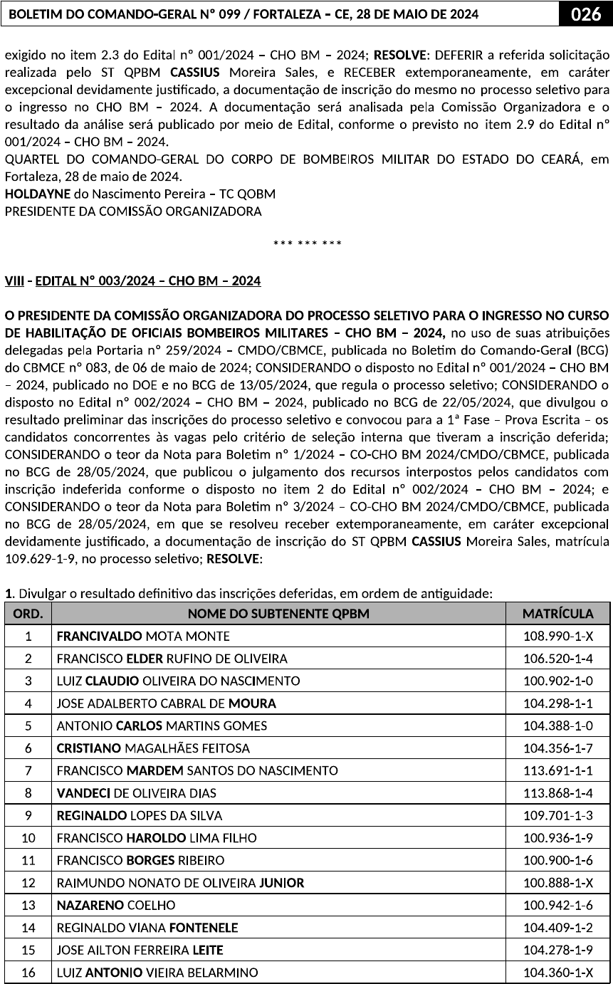 BOLETIM DO COMANDO-GERAL N° 099 / FORTALEZA - CE, 28 DE MAIO DE 2024 026 exigido no item 2.3 do Edital n° 001/2024 CHO BM 2024; RESOLVE: DEFERIR a referida solicitação realizada pelo ST QPBM CASSIUS Moreira Sales, e RECEBER extemporaneamente, em caráter excepcional devidamente justificado, a documentação de inscrição do mesmo no processo seletivo para o ingresso no CHO BM 2024. A documentação será analisada pela Comissão Organizadora e o resultado da análise será publicado por meio de Edital, conforme o previsto no item 2.9 do Edital n° 001/2024 CHO BM 2024. QUARTEL DO COMANDO-GERAL DO CORPO DE BOMBEIROS MILITAR DO ESTADO DO CEARÁ, em Fortaleza, 28 de maio de 2024. HOLDAYNE do Nascimento Pereira TC QOBM PRESIDENTE DA COMISSÃO ORGANIZADORA VIII EDITAL N° 003/2024 CHO BM 2024 o PRESIDENTE DA COMISSÃO ORGANIZADORA DO PROCESSO SELETIVO PARA o INGRESSO NO CURSO DE HABILITAÇÃO DE OFICIAIS BOMBEIROS MILITARES CHO BM 2024, no uso de suas atribuições delegadas pela Portaria n° 259/2024 CMDO/CBMCE, publicada no Boletim do Comando-Geral (BCG) do CBMCE n° 083, de 06 de maio de 2024; CONSIDERANDO o disposto no Edital n° 001/2024 CHO BM 2024, publicado no DOE e no BCG de 13/05/2024, que regula o processo seletivo; CONSIDERANDO o disposto no Edital n° 002/2024 CHO BM 2024, publicado no BCG de 22/05/2024, que divulgou o resultado preliminar das inscrições do processo seletivo e convocou para a Fase Prova Escrita os candidatos concorrentes às vagas pelo critério de seleção interna que tiveram a inscrição deferida; CONSIDERANDO o teor da Nota para Boletim n° 1/2024 CO-CHO BM 2024/CMDO/CBMCE, publicada no BCG de 28/05/2024, que publicou o julgamento dos recursos interpostos pelos candidatos com inscrição indeferida conforme o disposto no item 2 do Edital n° 002/2024 CHO BM 2024; e CONSIDERANDO o teor da Nota para Boletim n° 3/2024 CO-CHO BM publicada no BCG de 28/05/2024, em que se resolveu receber extemporaneamente, em caráter excepcional devidamente justificado, a documentação de inscrição do ST QPBM CASSIUS Moreira Sales, matrícula 109.629-1-9, no processo seletivo; 1. Divulgar o resultado definitivo das inscrições deferidas, em ordem de antiguidade: ORD. NOME DO SUBTENENTE QPBM MATRÍCULA 1 FRANCIVALDO MOTA MONTE 108.990-1-X 2 FRANCISCO ELDER RUFINO DE OLIVEIRA 106.520-1-4 3 LUIZ CLAUDIO OLIVEIRA DO NASCIMENTO 100.902-1-0 4 JOSE ADALBERTO CABRAL DE MOURA 104.298-1-1 5 ANTONIO CARLOS MARTINS GOMES 104.388-1-0 6 CRISTIANO MAGALHÃES FEITOSA 104.356-1-7 7 FRANCISCO MARDEM SANTOS DO NASCIMENTO 113.691-1-1 8 VANDECI DE OLIVEIRA DIAS 113.868-1-4 9 REGINALDO LOPES DA SILVA 109.701-1-3 10 FRANCISCO HAROLDO LIMA FILHO 100.936-1-9 11 FRANCISCO BORGES RIBEIRO 100.900-1-6 12 RAIMUNDO NONATO DE OLIVEIRA JUNIOR 100.888-1-X 13 NAZARENO COELHO 100.942-1-6 14 REGINALDO VIANA FONTENELE 104.409-1-2 15 JOSE AILTON FERREIRA LEITE 104.278-1-9 16 LUIZ ANTONIO VIEIRA BELARMINO 104.360-1-XBOLETIM DO COMANDO-GERAL N° 099 / FORTALEZA - CE, 28 DE MAIO DE 2024 027 17 JOSE VALTER DO NASCIMENTO JUNIOR 104.362-1-4 18 FRANCISCO AMARO GERALDO CAMELO 104.323-1-6 19 ENIVALDO DE PAULA SILVA 104.400-1-7 20 MIGUEL MARTINS COELHO JUNIOR 104.339-1-6 21 CARLOS ALBERTO RIBEIRO GOMES JUNIOR 104.380-1-2 22 KLEBER DA SILVA PINTO 104.366-1-3 23 JOSE DO NASCIMENTO LIMA 104.271-1-8 24 NOLTEVIR MARTINS LOPES 104.321-1-1 25 JOSE CLAIRTON DE CARVALHO RIOS 104.284-1-6 26 JOSE WASHINGTON MENDES DE OLIVEIRA 104.363-1-1 27 FRANCISCO LUCIANO DOS SANTOS 106.741-1-5 28 JOSE WILSON LUCIANO MONTEIRO 106.754-1-3 29 ANTONIO CAPISTRANO MARTINS NETO 106.724-1-4 30 FRANCISCO CARLOS DE SALES JUNIOR 106.725-1-1 31 ANTONIO JAIR ALBERTO DE ALCANTARA 106.718-1-7 32 DANIEL DOS SANTOS BEZERRA 106.733-1-3 33 MILTON PEREIRA DA SILVA FILHO 106.756-1-8 34 GILVAN BRITO DE OLIVEIRA 106.502-1-6 35 FRANCISCO VALDECI DA ROCHA 106.524-1-3 36 EDSON RAIMUNDO VITAL 106.500-1-1 37 RICARDO MAIA PORFIRIO 106.531-1-8 38 MARCELO SALES RODRIGUES 106.535-1-7 39 CLAUDINO SILVA DOS SANTOS 106.532-1-5 40 GLAYTON PONTES XIMENES 109.001-1-5 41 SALVIANO RIBEIRO DOS SANTOS FILHO 109.059-1-5 42 FERNANDO BATISTA NUNES 108.999-1-5 43 ROGERIO FERREIRA DA COSTA 109.055-1-6 44 CARLOS LIRA MONTE 108.965-1-7 45 ALEXANDRE PAULINO ALVES 108.778-1-4 46 ANTONIO CARLOS BARROSO MONTEIRO 108.958-1-2 47 JOSE DIMAS BARROSO MADEIRA 109.021-1-8 48 PEDRO HENRIQUE FERNANDES ROCHA 109.040-1-3 49 JOSE PAULO DE SOUSA 108.771-1-3 50 RONALDO RODRIGUES DE OLIVEIRA 109.057-1-0 51 MARINHO GLAUBER MOTA DE SOUSA 109.034-1-6 52 JOSE WILSON MOTA GASPAR 109.014-1-3 53 MILTON CESAR MOREIRA DE MELO 109.035-1-3 54 ODAIR DA ROCHA 109.037-1-8 55 CLAUDEMIR FERREIRA XAVIER 108.964-1-X 56 FRANCISCO MAIRLON FREITAS GUERRA 108.292-1-6 57 CLAUDIO ROBERTO PEREIRA 108.289-1-0 58 ANTONIO VILMAR MONTEIRO PRUDENCIO 109.636-1-3BOLETIM DO COMANDO-GERAL N° 099 / FORTALEZA - CE, 28 DE MAIO DE 2024 028 59 MARCIO MARINHO DE SOUSA 109.649-1-1 60 FRANCISCO ALBERTO DE VASCONCELOS MONTE 108.981-1-0 61 JOSE RIBAMAR MARQUES FILHO 104.371-1-3 62 ANTONIO FRANCISCO ALMEIDA COSTA 108.776-1-X 63 FRANCISCO EDUARDO MAZULO 108.979-1-2 64 HARILSON ANDRADE BRANDÃO 109.003-1-X 65 ANTONIO ARISMAR MARCAL MACHADO 108.786-1-6 66 PATRICIO DA SILVA ARAUJO 109.044-1-2 67 RAIMUNDO JOSE XAVIER DE LIMA 109.045-1-X 68 FRANCISCO DAS CHAGAS FERREIRA 108.772-1-0 69 PAULO SERGIO MESQUITA DE FARIAS 109.039-1-2 70 JOSE MARCONDES LUNA 108.278-1-7 71 GLAUBER DE SOUZA FEIJO 109.712-1-7 72 EVALDO LUIS TOMAS DE OLIVEIRA 109.659-1-8 73 KILDERY NASCIMENTO PEREIRA 109.026-1-4 74 MARLOS JOSE LOIOLA CARNEIRO 109.029-1-6 75 FRANCISCO EVALDO ALEXANDRE VIANA 108.997-1-0 76 OTACILIO AGUIAR JUNIOR 109.038-1-5 77 FRANCISCO CLAUDENISIO DE SOUSA 109.650-1-2 78 FABIO SOUSA DA SILVA 109.721-1-6 79 ANDERSON LOPES MORAIS 110.593-1-7 80 FLAVIO ARAUJO LIMA 109.719-1-8 81 MARCELO ACELINO LIMA 109.678-1-3 82 ALEXSANDRO CANDIDO DE ALCANTARA 110.595-1-1 83 PAULO CESAR DE ALMEIDA SILVA 109.041-1-0 84 NEUDJAM CARNEIRO DO NASCIMENTO 109.146-1-2 85 JOCIVAL DE OLIVEIRA 