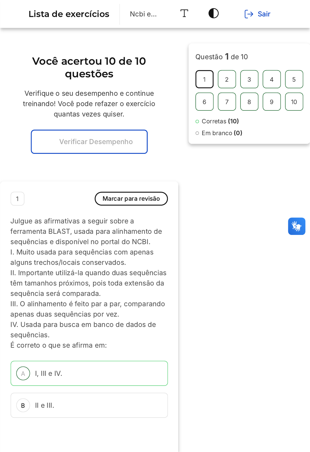 Você acertou 10 de 10 questões Verifique o seu desempenho e continue treinando! Você pode refazer o exercício quantas vezes quiser. Verificar Desempenho A B 1 Marcar para revisão Julgue as afirmativas a seguir sobre a ferramenta BLAST, usada para alinhamento de sequências e disponível no portal do NCBI. I. Muito usada para sequências com apenas alguns trechos/locais conservados. II. Importante utilizá-la quando duas sequências têm tamanhos próximos, pois toda extensão da sequência será comparada. III. O alinhamento é feito par a par, comparando apenas duas sequências por vez. IV. Usada para busca em banco de dados de sequências. É correto o que se afirma em: I, III e IV. II e III. Questão 1 de 10 Corretas �10� Em branco �0� 1 2 3 4 5 6 7 8 9 10 Lista de exercícios Ncbi e… Sair C D E II e IV. II, III e IV. I e II. Resposta correta Parabéns, você selecionou a alternativa correta. Confira o gabarito comentado! Gabarito Comentado A ferramenta BLAST é amplamente utilizada para o alinhamento de sequências, especialmente quando estas possuem apenas alguns trechos ou locais conservados, conforme afirmado na opção I. Além disso, o alinhamento é realizado de maneira par a par, ou seja, compara-se apenas duas sequências por vez, como mencionado na opção III. A ferramenta também é utilizada para busca em bancos de dados de sequências, como afirmado na opção IV. Portanto, as afirmações I, III e IV estão corretas. A opção II não está correta, pois a ferramenta BLAST não necessariamente compara toda a extensão da sequência, especialmente quando as sequências têm tamanhos distintos. Ela foca nas regiões de maior similaridade, tornando-a ideal para sequências mais divergentes. A B C D E 2 Marcar para revisão O PubMed é um dos bancos de dados disponíveis no portal do NCBI. A partir dele, podemos buscar por artigos científicos da área biomédica publicados por cientistas em todo o mundo. Caso você queira direcionar a sua busca para obter artigos mais adequados ao seu interesse, o que poderia ser feito? Utilizar os filtros de busca, que incluem ano e tipo de artigo, por exemplo, ou, ainda, optar pela busca avançada. Pagar uma assinatura mensal ao PubMed para que ele direcione automaticamente suas buscas de acordo com os critérios que você deseja. Não existe a possibilidade de direcionar a busca, é necessário avaliar todos os títulos que aparecem como resultado para escolher aqueles mais adequados. Cadastrar seus dados profissionais e receber uma autorização para acessar a parte restrita do PubMed que permite buscas avançadas. Acessar o PubMed por meio de rede de Internet de instituição pública, como universidades ou bibliotecas. Só assim é possível direcionar a busca por artigos. Resposta correta Parabéns, você selecionou a alternativa correta. Confira o gabarito comentado! Gabarito Comentado O PubMed, disponível no portal do NCBI, permite que qualquer usuário realize buscas direcionadas utilizando filtros ou o modo avançado. Esses recursos possibilitam a personalização da busca, tornando-a mais eficiente e adequada ao interesse do usuário. Vale ressaltar que a disponibilidade completa de alguns artigos pode variar, pois isso depende da política da revista em que o artigo foi publicado, e não do próprio PubMed. Portanto, a alternativa correta é a A, que sugere a utilização dos filtros de busca e a opção pela busca avançada. 3 Marcar para revisão �UFSM, 2006, Biólogo) As temperaturas são essenciais para a realização da amplificação do DNA por PCR. Associe a segunda coluna com a primeira. 1. de 0°C a 10°C 2. de 35°C a 65°C 3. 72°C 4. 82°C 5. de 90°C a 96°C ( ) Maior probabilidade de alinhamento dos primers com a fita molde. ( ) Formação de fitas-molde a partir de todos os segmentos. ( ) Ideal para ação da enzima Taq-DNA� polimerase. A B C D E ( ) Ideal para extensão dos primers a partir da extremidade 3'. ( ) Estabelecimento de ligações - pontes de hidrogênio, o DNA da amostra e os primers. 3 � 4 � 5 � 4 � 2. 5 � 4 � 1 � 5 � 3. 4 � 2 � 3 � 2 � 1. 2 � 3 � 1 � 3 � 4. 2 � 5 � 3 � 3 � 2. Resposta correta Parabéns, você selecionou a alternativa correta. Confira o gabarito comentado! Gabarito Comentado Na técnica de amplificação do DNA por PCR, diferentes temperaturas são utilizadas para diferentes etapas do processo. Na etapa de desnaturação, a temperatura está entre 90�96°C �5�, momento em que a dupla fita do DNA se separa, formando fitas-molde a partir de todos os segmentos. A etapa de anelamento ocorre entre 35°C a 65°C �2�, quando os primers se anelam na região complementar do molde, estabelecendo ligações - pontes de hidrogênio, entre o DNA da amostra e os primers. Após essa etapa, a enzima Taq- DNA-polimerase atua, adicionando os nucleotídeos, em uma temperatura de 72°C A B C D E �3�, que é ideal para a extensão dos primers a partir da extremidade 3'. As faixas de temperatura entre 0°C a 10°C �1) e 82°C �4) não são utilizadas durante o ciclo do PCR. 4 Marcar para revisão �PR4 � UFRJ � Biólogo - UFRJ � Biologia Molecular - 2016� Um pesquisador e sua equipe acabam de obter a sequência de nucleotídeos de um gene de camundongo anteriormente desconhecido. Querendo saber se esse gene ou um gene similar está presente no genoma humano, ele deve recorrer à seguinte ferramenta de bioinformática: Mega. Multialignm. Velvet. GenBank. BLAST. Resposta correta Parabéns, você selecionou a alternativa correta. Confira o gabarito comentado! Gabarito Comentado O BLAST é um software utilizado para alinhamento local e simples de sequências biológicas, que podem ser de nucleotídeos ou aminoácidos. No contexto da questão, o pesquisador deseja verificar se a sequência de nucleotídeos de um gene de camundongo, até então desconhecido, está presente no genoma humano. Para isso, o BLAST é a ferramen