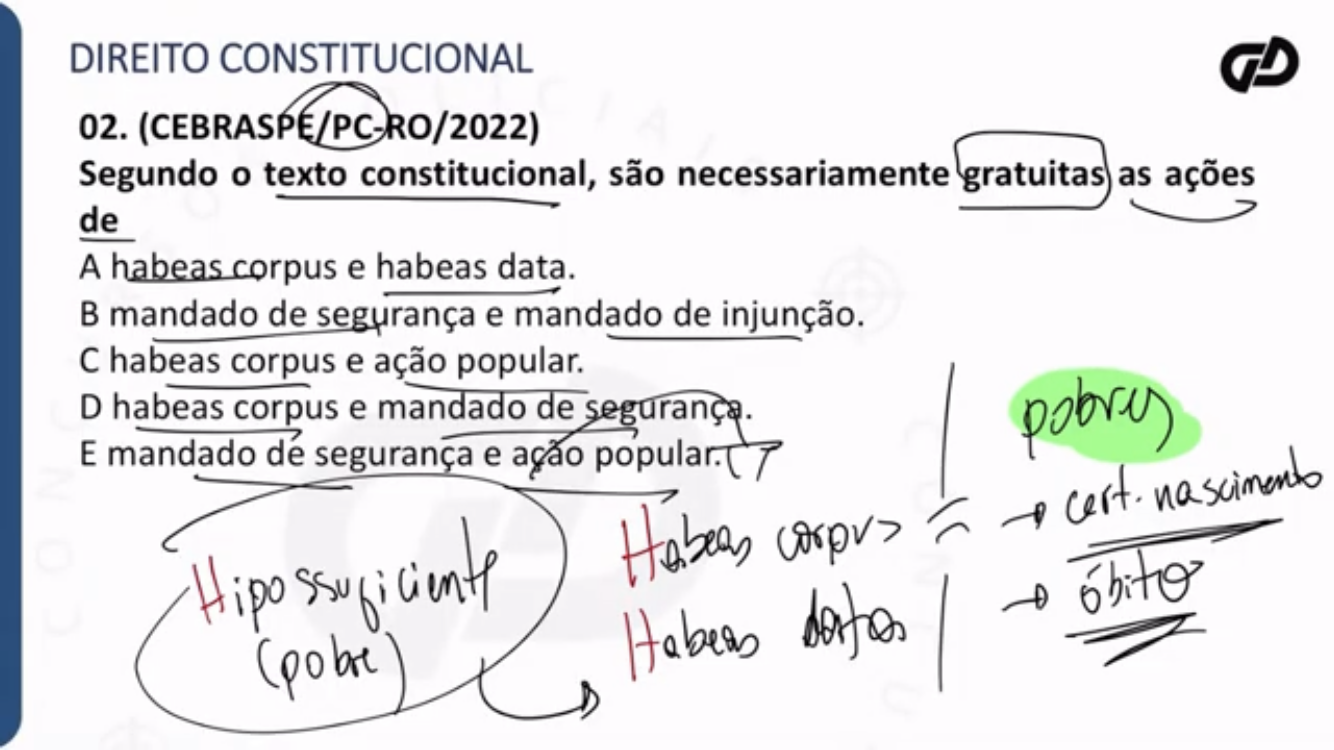 DIREITO CONSTITUCIONAL 02. (CEBRASPE/PC-RO/2022) Segundo o texto constitucional, são necessariamente gratuitas as ações de A habeas corpus e habeas data. B mandado de segurança e mandado de injunção. C habeas corpus e ação popular. D habeas corpus e mandado de segurança. E mandado de segurança e ação corpv> cert. nascimento
