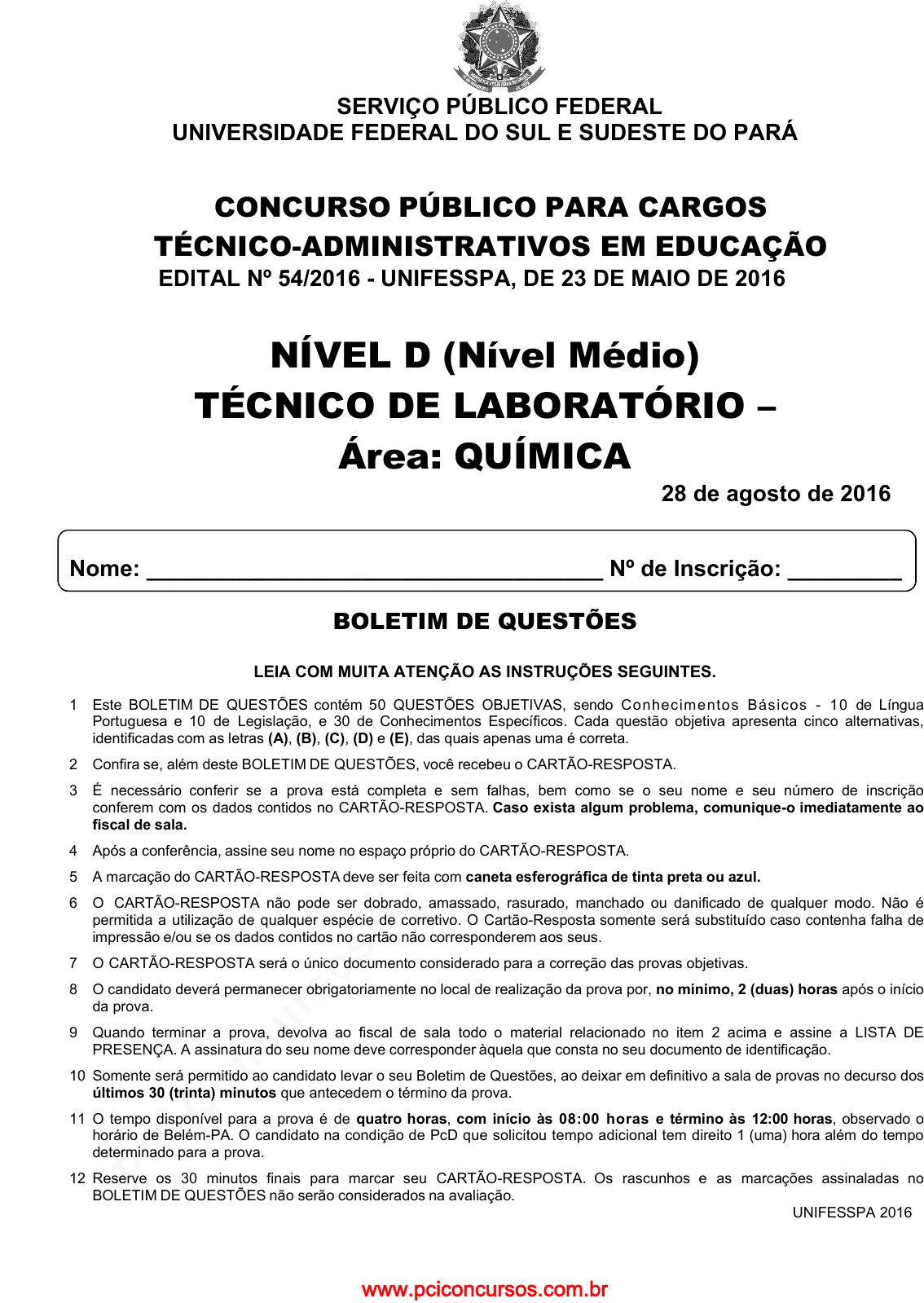 pcimarkpci MjgwNDowZDRiOjlkMWQ6ZjMwMDowYzQyOjBiMTA6ZmU1ZjoyYWRl:U3VuLCAxNCBNYXkgMjAyMyAwODoyNToxMCAtMDMwMA== www.pciconcursos.com.br SERVIÇO PÚBLICO FEDERAL UNIVERSIDADE FEDERAL DO SUL E SUDESTE DO PARÁ CONCURSO PÚBLICO PARA CARGOS TÉCNICO-ADMINISTRATIVOS EM EDUCAÇÃO EDITAL Nº 54/2016 - UNIFESSPA, DE 23 DE MAIO DE 2016 NÍVEL D (Nível Médio) TÉCNICO DE LABORATÓRIO – Área: QUÍMICA 28 de agosto de 2016 Nome: ____________________________________ Nº de Inscrição: _________ BOLETIM DE QUESTÕES LEIA COM MUITA ATENÇÃO AS INSTRUÇÕES SEGUINTES. 1 Este BOLETIM DE QUESTÕES contém 50 QUESTÕES OBJETIVAS, sendo Conhecimentos Básicos - 10 de Língua Portuguesa e 10 de Legislação, e 30 de Conhecimentos Específicos. Cada questão objetiva apresenta cinco alternativas, identificadas com as letras (A), (B), (C), (D) e (E), das quais apenas uma é correta. 2 Confira se, além deste BOLETIM DE QUESTÕES, você recebeu o CARTÃO-RESPOSTA. 3 É necessário conferir se a prova está completa e sem falhas, bem como se o seu nome e seu número de inscrição conferem com os dados contidos no CARTÃO-RESPOSTA. Caso exista algum problema, comunique-o imediatamente ao fiscal de sala. 4 Após a conferência, assine seu nome no espaço próprio do CARTÃO-RESPOSTA. 5 A marcação do CARTÃO-RESPOSTA deve ser feita com caneta esferográfica de tinta preta ou azul. 6 O CARTÃO-RESPOSTA não pode ser dobrado, amassado, rasurado, manchado ou danificado de qualquer modo. Não é permitida a utilização de qualquer espécie de corretivo. O Cartão-Resposta somente será substituído caso contenha falha de impressão e/ou se os dados contidos no cartão não corresponderem aos seus. 7 O CARTÃO-RESPOSTA será o único documento considerado para a correção das provas objetivas. 8 O candidato deverá permanecer obrigatoriamente no local de realização da prova por, no mínimo, 2 (duas) horas após o início da prova. 9 Quando terminar a prova, devolva ao fiscal de sala todo o material relacionado no item 2 acima e assine a LISTA DE PRESENÇA. A assinatura do seu nome deve corresponder àquela que consta no seu documento de identificação. 10 Somente será permitido ao candidato levar o seu Boletim de Questões, ao deixar em definitivo a sala de provas no decurso dos últimos 30 (trinta) minutos que antecedem o término da prova. 11 O tempo disponível para a prova é de quatro horas, com início às 08:00 horas e término às 12:00 horas, observado o horário de Belém-PA. O candidato na condição de PcD que solicitou tempo adicional tem direito 1 (uma) hora além do tempo determinado para a prova. 12 Reserve os 30 minutos finais para marcar seu CARTÃO-RESPOSTA. Os rascunhos e as marcações assinaladas no BOLETIM DE QUESTÕES não serão considerados na avaliação. UNIFESSPA 2016 www.pciconcursos.com.br pcimarkpci MjgwNDowZDRiOjlkMWQ6ZjMwMDowYzQyOjBiMTA6ZmU1ZjoyYWRl:U3VuLCAxNCBNYXkgMjAyMyAwODoyNToxMCAtMDMwMA== www.pciconcursos.com.br CONCURSO PÚBLICO PARA CARGOS TÉCNICO-ADMINISTRATIVOS EM EDUCAÇÃO EDITAL Nº 54/2016 – UNIFESSPA, DE 23 DE MAIO DE 2016 2 MARQUE A ÚNICA ALTERNATIVA CORRETA NAS QUESTÕES DE 1 A 50. LÍNGUA PORTUGUESA (CONHECIMENTOS BÁSICOS) Leia atentamente o texto abaixo para responder às questões de 1 a 10. Conheça o criador da frase “gentileza gera gentileza” 1 2 3 4 5 6 7 8 9 10 11 12 13 14 15 16 17 18 19 20 21 22 23 24 Se você for às ruas do Rio de Janeiro e perguntar por José Datrino, certamente, a imensa maioria dos cariocas não ligará o nome à pessoa. Mas experimente procurar pela história do Profeta Gentileza e, em troca, receberá dezenas de sorrisos e lembranças. Nascido em uma família de 11 irmãos no interior de Cafelândia, São Paulo, desde menino Datrino se destacava por seu comportamento atípico para a idade (13 anos): fazia questão de espalhar na escola e aos amigos que “tinha uma missão na Terra”. Ele só viraria Profeta Gentileza anos depois, na década de 1960, depois do incêndio do Gran Circus Norte-Americano de Niterói (dezembro de 1961), no qual morreram mais de 500 pessoas – a maioria, crianças. No Natal daquele ano, morando no Rio, Datrino disse ter ouvido “vozes astrais” e dirigiu-se ao terreno do circo para plantar um jardim sobre as cinzas. Ali morou por quatro anos e trabalhou como “consolador voluntário”, confortando com palavras de bondade as famílias das vítimas da tragédia. Recebeu dois apelidos: “José Agradecido” e “Profeta Gentileza”. O último prevaleceu. Na década seguinte, Gentileza passou a percorrer as ruas da capital fluminense para levar sua palavra de amor, bondade e respeito ao próximo. Era assim em ônibus, praças, pontes, praias, calçadões e até nas apinhadas barcas da travessia Rio-Niterói. Nem todos entendiam a mensagem do Profeta. Os mais exaltados o chamavam de “maluco”. Para estes, a resposta estava sempre na ponta da língua: “Sou maluco para te amar e louco para te salvar”. Após uma rápida passagem por Conselheiro Lafaiete, Minas Gerais, Gentileza voltou ao Rio, nos anos de 1980, para dar início ao seu legado: em 56 pilastras do viaduto da Av. Brasil, entre o Cemitério do Caju e o Terminal Rodoviário do Rio de Janeiro, Gentileza preencheu muros com seus escritos sobre o mal-estar da civilização. Para uns, textos proféticos, para outros, poesia, as mensagens em tons de azul, verde e amarelo nunca passaram despercebidas. Foram cantadas por músicos como Gonzaguinha e Marisa Monte, citadas em filmes, novelas e trabalhos acadêmicos. Disponível em http://noticias.terra.com.br/brasil/cidades/conheca-o-criador-da-frase-gentileza-gera- gentileza,65bd0e89ee217410VgnVCM10000098cceb0aRCRD.html. Acessado em 5 de junho de 2016. 1 O autor do texto Conheça o criador da frase “gentileza gera gentileza” (A) conta a história de uma personagem fictícia. (B) homenageia uma pessoa desconhecida. (C) resume a biografia de um indivíduo. (D) ironiza as atitu