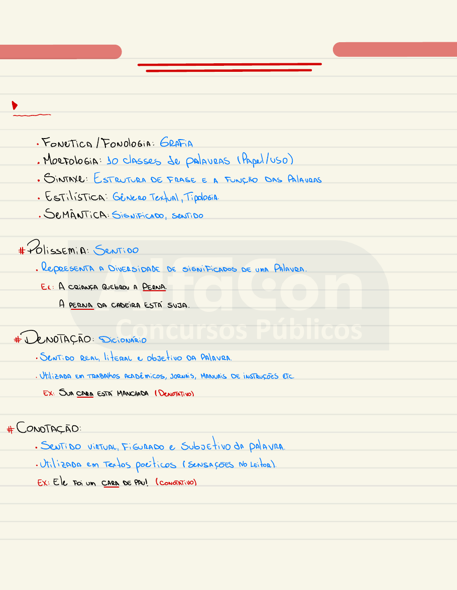 SEMÂNTICA Áreas:* · Fonetica/FondoGiA:GRAFIA · Morfologia: do classes de palavras UPApelluso . SINTAXe:ESTRUTURA DEFRASE E AFUNÇÃO DAS PALAVRAS . Estilistica:Gênero Textual,Tipologia. . SeMANTICA:SieniFiCADO, SeNTiDO #PolissEmiA: Sentino · RepRESENTA ADIVERSIDADEDESignificaDeS DE UMAPALAVRA. Ex:A CRIANCAQUEROU APERNA. APERNA DACADEIRAESTÁ SUJA. #DeNOTAÇAO: Dicionário . Sentido REA, literal e objetivo DA PALAVRA. . UtilizADA EM TRABALHOS AcADêmicos, JORNAIS, MANUAS DEINSTruções etc. Ex:SUA CARAESTA MANCHADAODenotativo #CONOTAÇÃO: . Sentido virtual, figurado e Subsetivo dapalavra. . Utilizada em Textos poeticos sensações no Leitorl. EX:Ele foi um CARA DE PAU! OCONOTATIVO #SiNNiMOS: = . PAAURAS com Significados semelhantes Ex:ANDAR E CAMINHAR, USAR e utilizar, FRACO eFRAGil * Sinônimos a Perfeitos:Significados identicos UApós e depois * Imperfeitos: Significados PARECIDOS VGordoeObesol #Antônimos:I .Palavras com significados contrários Ex: CARO e escuro, Triste efeliz, bom eMAU. #Homônimos: ·PALAVRAS com mesmA PRONUNciA HomofoNAS), ORAmeSmAGRAFIA OHomoEnoFAS), com SiGwifiCADOS DIFERENTES. ! Homônimos Perfeitos:MESMAGRAFIA E AMESMASONORIDADENA PRONUNCIA. Ex's. & pelo do CACHORRO ébranco. Viasamos pelo caminito mais longo. *HomóCRAFOS:MeSmA GRAfiA, PRoNúNciA biFERENTe. Ex:Eu Almoço em CASA OVerbol O Almoço está pronto Substantivol *Homózonos:Mesmapronúncia, GRAFIA Diferente. Ex:CINTO USubsTANTivol Sinto Verbol *Perfeitos:MesmA RONúNciA e GrafiA, SenTiDoS Diferentes Ex:VERÃO Nerbo no futuro do presente do indicativol. Verão UESTACES DO And #PARNIMOS: · SemelLANTES NA PRONUNCIA E NA GRAFIA, SENTIDOS DIFERENTES. Ex:Sessão Tempo ou periodo Seção Diviso #Hiperônimo e Hipônimo . Significados Muito PARecibos . Evitar Repetições Excessivas noTexto *Hiperônimos:Sentido Abrangente conjunto *Hipôvimos:Sentido Específico O Dentro Do Conjuntol Ex:Automóvel éHiperônimo de "Carno", "Moto"e "CAMINHAD" BARATA, MOSCA ebesouro são Hipônimos de "inseto".