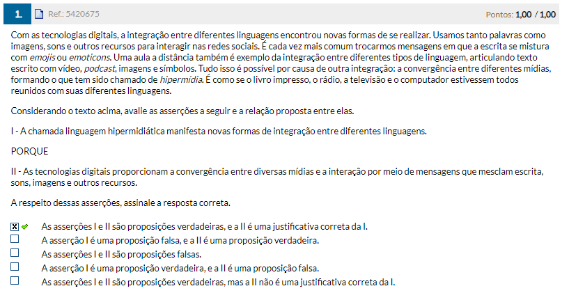 5420675 Pontos: 1,00 / 1,00 Com as tecnologias digitais, a integração entre diferentes linguagens encontrou novas formas de se realizar. Usamos tanto palavras como imagens, sons e outros recursos para interagir nas redes sociais. É cada vez mais comum trocarmos mensagens em que a escrita se mistura com emojis ou Uma aula a distância também é exemplo da integração entre diferentes tipos de linguagem, articulando texto escrito com podcast, imagens e Tudo isso é possível por causa de outra integração: a convergência entre diferentes formando que tem sido chamado de hipermídia. É como se livro rádio, a televisão e computador estivessem todos reunidos com suas diferentes linguagens. Considerando texto acima, avalie as asserções a seguir e a relação proposta entre elas. A chamada linguagem hipermidiática manifesta novas formas de integração entre diferentes linguagens. PORQUE II - As tecnologias digitais proporcionam a convergência entre diversas e a interação por meio de mensagens que mesclam escrita, sons, imagens e outros recursos. A respeito dessas asserções, assinale a resposta correta. As asserções e são proposições verdadeiras, e a II é uma justificativa correta da I. A asserção é uma proposição falsa, e a II é uma proposição verdadeira. As asserções e são proposições falsas. A asserção I é uma proposição verdadeira, e a II é uma proposição falsa. As asserções I e são proposições verdadeiras. mas a II não é uma justificativa correta da I.