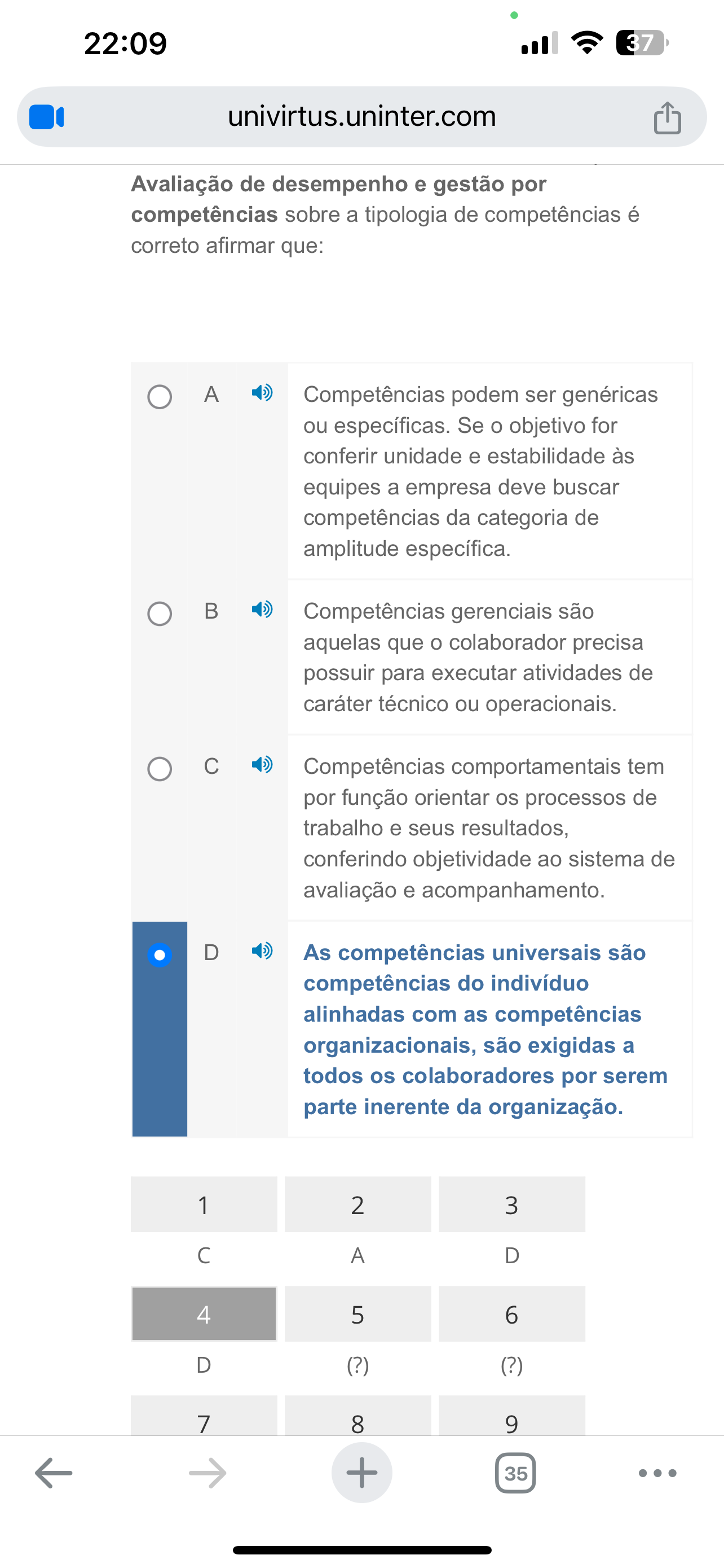 22:09 37 univirtus.uninter.com Avaliação de desempenho e gestão por competências sobre a tipologia de competências é correto afirmar que: A Competências podem ser genéricas ou específicas. Se o objetivo for conferir unidade e estabilidade às equipes a empresa deve buscar competências da categoria de amplitude específica. B Competências gerenciais são aquelas que o colaborador precisa possuir para executar atividades de caráter técnico ou operacionais. C Competências comportamentais tem por função orientar os processos de trabalho e seus resultados, conferindo objetividade ao sistema de avaliação e acompanhamento. D As competências universais são competências do indivíduo alinhadas com as competências organizacionais, são exigidas a todos os colaboradores por serem parte inerente da organização. 1 2 3 C A D 4 5 6 D (?) (?) 7 8 9 + 35