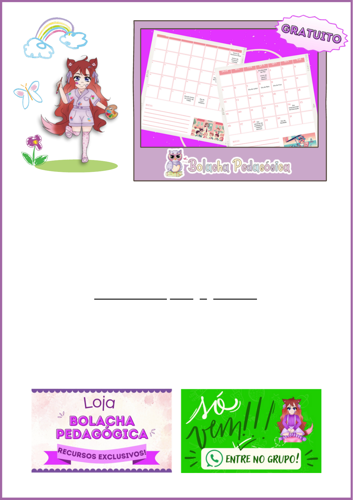 www.bolachapedagogica.com @bolacha_pedagogica Este arquivo é 100% GRATUITO e pode ser compartilhado à vontade. Pedimos que nos dê os créditos. É PROIBIDO A VENDA e qualquer alteração do arquivo. Clique na imagem para acessar Calendário de Datas comemorativas 2025 Este calendário pode preencher com alguma data que falte ou até mesmo de acordo com seu calendário escolar. Para cada data pode pesquisar em nosso blog por recursos gratuitos!! www.bolachapedagogica.com http://www.bolachapedagogica.com/ 2025 Calendário datas comemorativas Bolacha Pedagógica Janeiro 2025 DOM SEG TER QUA QUI SEX SAB 1 2 3 4 5 6 7 8 9 10 11 12 13 14 15 16 17 18 19 20 21 22 23 24 25 26 27 28 29 30 31 notas: Dia Mundial da Paz Início do Janeiro Branco Dia do Leitor Dia Internacional da Educação Dia da Saudade Dia de Reis Dia do Fico Dia nacional de combate ao trabalho escravo Bolacha Pedagógica DOM SEG TER QUA QUI SEX SAB 1 2 3 4 5 6 7 8 9 10 11 12 13 14 15 16 17 18 19 20 21 22 23 24 25 26 27 28 30 Fevereiro 2025 notas: Início do Fevereiro Roxo Início do Fevereiro Laranja Dia Internacional da Doação de Livros Dia de Contar um Conto de Fadas Dia do Livro Didático Bolacha Pedagógica Março 2025 DOM SEG TER QUA QUI SEX SAB 1 2 3 4 5 6 7 8 9 10 11 12 13 14 15 16 17 18 19 20 21 22 23 24 25 26 27 28 29 30 31 notas: Quarta-feira de CinzasCarnaval Dia Internacional da Mulher Dia Nacional dos Animais Dia da Escola Início do Outono Dia mundial da saúde bucal Dia Internacional da Síndrome de Down Dia Mundial da Água Dia da Constituição Dia do circoDia da saúde e nutrição Bolacha Pedagógica DOM SEG TER QUA QUI SEX SAB 1 2 3 4 5 6 7 8 9 10 11 12 13 14 15 16 17 18 19 20 21 22 23 24 25 26 27 28 29 30 Abril 2025 notas: Dia da Mentira - 1º de Abril Início do Abril Azul | Autismo Dia mundial da saúde Dia do Filho Dia Nacional de Combate ao Bullying e à Violência na Escola Dia dos Povos Indígenas Páscoa Descobrimento do Brasil Dia internacional da Terra Sexta-feira Santa Dia Nacional do Livro Infantil Dia do amigo Dia Nacional da Família na Escola Dia da Educação Dia de Tiradentes Dia mundial do livro Bolacha Pedagógica Maio 2025 DOM SEG TER QUA QUI SEX SAB 1 2 3 4 5 6 7 8 9 10 11 12 13 14 15 16 17 18 19 20 21 22 23 24 25 26 27 28 29 30 31 notas: Dia do Trabalho Início do Maio Amarelo Dia Mundial do Riso Dia das Mães Dia Internacional da Família Dia Mundial da Reciclagem Dia do Pedagogo Dia do Abraço Dia do Serviço de Saúde Abolição da escravatura Dia nacional de combate ao abuso e à exploração sexual infantil Bolacha Pedagógica DOM SEG TER QUA QUI SEX SAB 1 2 3 4 5 6 7 8 9 10 11 12 13 14 15 16 17 18 19 20 21 22 23 24 25 26 27 28 29 30 Junho 2025 notas: Semana do Meio Ambiente Dia dos Namorados Dia do Orgulho Autista Corpus Christi Início do Inverno Dia de São João Dia da Ecologia Dia Nacional da Reciclagem Bolacha Pedagógica Julho 2025 DOM SEG TER QUA QUI SEX SAB 1 2 3 4 5 6 7 8 9 10 11 12 13 14 15 16 17 18 19 20 21 22 23 24 25 26 27 28 29 30 notas: Dia do Homem Dia dos Avós Dia do Escritor Dia Internacional da Amizade Dia do Curupira Bolacha Pedagógica DOM SEG TER QUA QUI SEX SAB 1 2 3 4 5 6 7 8 9 10 11 12 13 14 15 16 17 18 19 20 21 22 23 24 25 26 27 28 29 30 Agosto 2025 31 notas: Dia dos Pais Dia do Estudante Dia do Supervisor Escolar Dia do Folclore Entre 18 e 22 de agosto, é celebrada a Semana do Folclore Brasileiro. Bolacha Pedagógica Setembro 2025 DOM SEG TER QUA QUI SEX SAB 1 2 3 4 5 6 7 8 9 10 11 12 13 14 15 16 17 18 19 20 21 22 23 24 25 26 27 28 29 30 notas: Início do Setembro Amarelo Dia do Irmão Dia da Independência do Brasil Dia Mundial de Prevenção ao Suicídio Dia Nacional do Teatro Dia da Árvore Dia Nacional do Trânsito Início da Primavera Dia Mundial da Alfabetização Entre 18 e 25 de setembro, é celebrada a Semana Nacional de Trânsito. Bolacha Pedagógica DOM SEG TER QUA QUI SEX SAB 1 2 3 4 5 6 7 8 9 10 11 12 13 14 15 16 17 18 19 20 21 22 23 24 25 26 27 28 29 30 31 Outubro 2025 notas: Início do Outubro Rosa Dia da Natureza Dia das Crianças Dia do Professor Dia Mundial da Alimentação Dia Internacional de Combate ao Câncer de Mama Dia Mundial de Combate ao Bullying Dia do Saci Halloween Dia Nacional da Alimentação na Escola Dia da Merendeira Escolar Bolacha Pedagógica DOM SEG TER QUA QUI SEX SAB 1 2 3 4 5 6 7 8 9 10 11 12 13 14 15 16 17 18 19 20 21 22 23 24 25 26 27 28 29 Novembro 2025 30 notas: Início do Novembro Azul Finados Dia Nacional da Língua Portuguesa Dia Nacional da Alfabetização Proclamação da República Dia da Bandeira Dia do Soldado Dia Nacional de Zumbi e da Consciência Negra Dia do Diretor de Escola Bolacha Pedagógica Dezembro 2025 DOM SEG TER QUA QUI SEX SAB 1 2 3 4 5 6 7 8 9 10 11 12 13 14 15 16 17 18 19 20 21 22 23 24 25 26 27 28 29 30 31 notas: Início do Dezembro Laranja Dia Internacional da Pessoa com Deficiência Dia da Família Véspera de Natal Natal Véspera de Ano-Novo Início do Verão Bolacha Pedagógica Recomendamos Clique na imagem para acessar Conheça nossas outras redes www.bolachapedagogica.com @bolacha_pedagogica