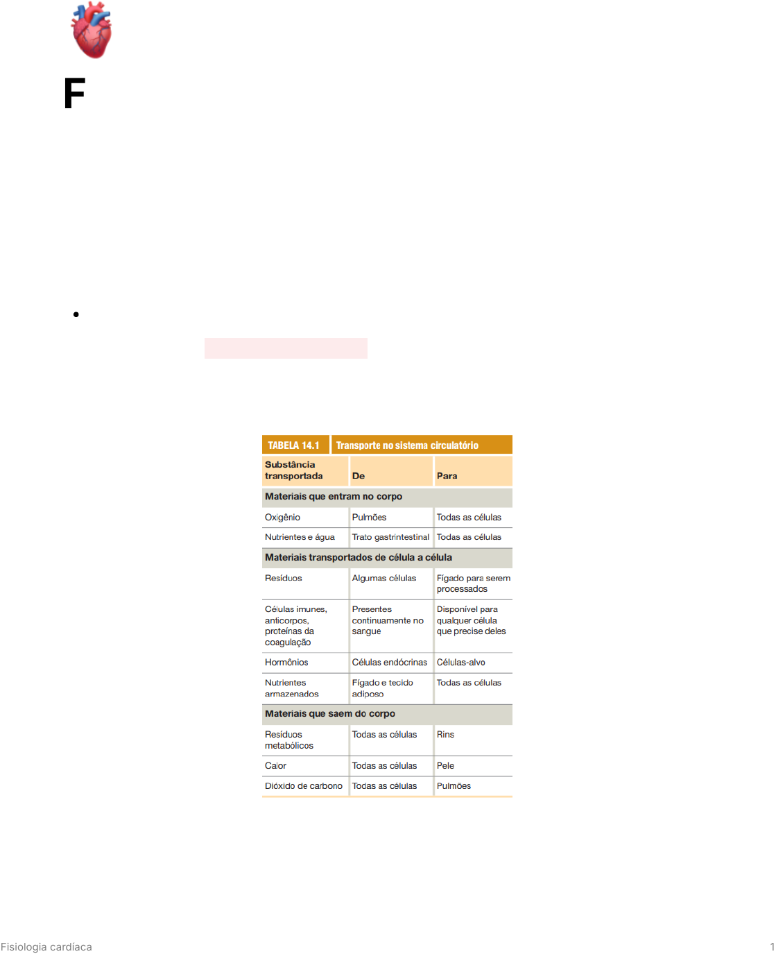 Fisiologia cardíaca 1 🫀 Fisiologia cardíaca Morgana R. Duarte- TXI Sistema circulatório Série de tubos (vasos sanguíneos) cheios de líquido (sangue) conectados a uma bomba (coração). Coração, vasos sanguíneos (vasculatura), células e plasma sanguíneo Função primária: transportar materiais para e de todas as partes do corpo (nutrientes, água, gases, materiais que se movem entre as células e resíduos celulares). Veias: vasos que trazem sangue para o coração. Artérias: vasos que carregam sangue adiante a partir do coração. Fisiologia cardíaca 2 Pressão arterial e débito cardíaco Fisiologia cardíaca 3 O coração Órgão muscular com 4 câmaras. Localizado no centro da cavidade torácica (mediastino médio). Inervação: simpática (principalmente nos ventrículos) e parassimpática (vagos, principalmente nos nodos) Ápice: pontiagudo, voltado para baixo. Fisiologia cardíaca 4 Base: mais larga e atrás do esterno. � Pericárdio: saco membranoso que reveste o coração a� Possui líquido pericárdico: lubrifica a superfície externa do coração � Miocárdio: músculo cardíaco a� Coberto por finas camadas de epitélio e tecido conectivo Valvas cardíacas O coração possui 4 valvas (estruturas relacionadas com a orientação da direção do fluxo sanguíneo durante o ciclo cardíaco) � Valvas atrioventriculares: a� Tricúspide → entre o átrio e o ventrículo direitos. b� Bicúspide (mitral) → entre o átrio esquerdo e o ventrículo esquerdo. � Valvas semilunares: a� Pulmonar → entre ventrículo direito e a circulação pulmonar. b� Aórtica → entre o ventrículo esquerdo e a circulação sistêmica. Fisiologia cardíaca 5 💡 No Português brasileiro o termo válvula pode ser utilizado como referência aos componentes das valvas, ou seja, como sinônimo dos termos cúspide e folheto. Valores de referência para sinais vitais Fisiologia cardíaca 6 Fisiologia do músculo cardíaco O coração é composto por 3 tipos de músculo: � Músculo atrial � Músculo ventricular � Fibras especializadas excitatórias e condutoras Fibras de Purkinje) a� Apresentam poucas fibras contráteis b� Emitem descargas elétricas rítmicas automáticas (potenciais de ação) ou fazem a condução desses potenciais c� Sistema excitatório que controla os batimentos cardíacos Propriedades do músculo cardíaco � Batmotropismo: excitabilidade � Cronotropismo: ritmicidade � Dromotropismo: condutividade � Inotropismo: contratilidade � Lusitropismo: relaxamento Anatomia fisiológica do músculo cardíaco Fisiologia cardíaca 7 O músculo cardíaco é estriado (como um músculo esquelético) e possui miofibrilas típicas (actina e miosina). Esses filamentos ficam lado a lado e deslizam juntos durante a contração Discos intercalares: membranas celulares que separam as células miocárdicas umas das outras → permanecem como junções comunicantes permeáveis (permitem rápida difusão dos íons através do fluido intracelular) + desmossomos (conexões que mantêm as células unidas). 💡 Os átrios são separados dos ventrículos por tecido fibroso ao redor das valvas atrioventriculares. Normalmente, os potenciais não atravessam essa barreira. Ao invés disso, eles são conduzidos por um sistema especializado de condução: feixe AV (feixe de fibras condutoras). Sincício das células cardíacas: células interconectadas, onde o potencial se espalha para todas pela treliça de interconexões. � Sincício atrial: forma as paredes dos átrios � Sincício ventricular: forma as paredes dos ventrículos Fisiologia cardíaca 8 Essa divisão do coração em 2 sincícios funcionais permite que os átrios se contraiam pouco antes dos ventrículos. Potenciais de ação Potenciais de ação no músculo cardíaco Média 105 mili-volts → o potencial intracelular passa de muito negativo 85 mili- volts) para ligeiramente positivo 20 mili-volts) entre os batimentos. Fisiologia cardíaca 9 Platô: após o potencial em ponta inicial (spike), a membrana permanece despolarizada por 0,2s e se segue por repolarização abrupta → diferença do músculo esquelético. Potencial no m. estriado Potencial no m. cardíaco Súbita abertura dos canais rápidos de sódio 2 tipos de canais: canais rápidos e sódio e canais lentos de cálcio (canais de cálcio- sódio) Esses canais permanecem abertos por milésimos de segundos e se fecham de modo abrupto Canais de cálcio-sódio: mais lentos para abrir e continuam abertos por vários décimos de segundo. Não há alteração da permeabilidade da membrana celular Após o início do potencial de ação da membrana celular a permeabilidade aos íons de potássio diminui 5x menos) → diminui a saída de potássio da célula Velocidade da condução do sinal no miocárdio 0,3 a 0,5 m/s. Velocidade da condução do sinal no sistema condutor especializado Purkinje) 4 m/s. Fases do potencial de ação Fisiologia cardíaca 10 � Fase 4 potencial de membrana em repouso a� Aproximadamente 90 mV � Fase 0 despolarização a� Abertura dos canais de Na+ DDV (dependentes de voltagem), Na+ despolariza a célula e o potencial de membrana atinge cerca de 20 mV � Fase 1 repolarização inicial a� Canais de Na+ se fecham e a célula se repolariza conforme a saída de K b� Processo muito breve � Fase 2 platô a� Diminuição da permeabilidade de K e aumento na permeabilidade de Ca2 b� Canais de Ca2 se abrem (influxo de Ca2 e os canais rápidos de K se fecham (diminuição do efluxo de K achatamento do potencial de ação e formação do platô � Fase 3 repolarização rápida a� Platô termina quando os canais de Ca2 se fecham e a permeabilidade de K aumenta b� Os canais lentos de K se abrem lentamente, o K sai rapidamente e a célula retorna ao seu potencial de repouso 90mV. Fisiologia cardíaca 11 Período refratário do miocárdio Intervalo de tempo durante o qual o impulso cardíaco normal não pode