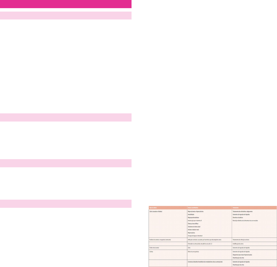 SP 1.4 – Uma Pedr no caminho Palavras desconhecidas · Antiespasmódico: são um grupo de substâncias que previnem ou interrompem a contração dolorosa e involuntária dos músculos do intestino, abdômen e sistema reprodutor, responsável pela sensação de cólica. · Cilindros hemáticos: · Dismorfismo eritrocitário: consiste numa alteração morfológica das hemácias presentes na urina, que permite avaliar a origem da hematúria. · Hidronefrose: dilatação da pelve e dos cálices renais preenchidos por urina, com atrofia progressiva do rim em consequência da obstrução da drenagem urinária. Problemas · Dor abdominal discreta, generalizada e mal definida · Dor localizada no flanco direito · Queixa de náuseas e dor grande intensidade, em cólica Hipóteses · Nefrolitíase · Má ingestão de água · Excesso de minerais · Movimentação do cálculo Questões de aprendizagem 1. Fisiopatologia da dor visceral? Os órgãos internos possuem receptores de dor conhecidos como nociceptores, que são ativados em resposta a estímulos nocivos, como distensão, isquemia, inflamação ou espasmos. Esses nociceptores transmitem os sinais de dor ao sistema nervoso central. Os neurônios sensoriais viscerais e somáticos frequentemente convergem em níveis mais altos do sistema nervoso central, levando à percepção de dor visceral como dor referida em áreas cutâneas específicas. Isso ocorre devido à partilha de vias neurais comuns no sistema nervoso central. A inflamação nos órgãos internos pode levar à sensibilização dos nociceptores, aumentando a resposta à dor. Além disso, mediadores inflamatórios, como prostaglandinas e citocinas, podem ativar diretamente os nociceptores, contribuindo para a geração da dor visceral. O espasmo dos músculos lisos dos órgãos internos pode desencadear dor visceral. Esse espasmo pode ser causado por distúrbios funcionais, como a síndrome do intestino irritável, ou por condições patológicas, como a obstrução intestinal. A diminuição do suprimento sanguíneo para os órgãos internos pode resultar em isquemia, levando à ativação dos nociceptores e à geração de dor visceral. A isquemia pode ocorrer em condições como infarto do miocárdio, cólica renal ou isquemia mesentérica. Gebhart GF. Pathobiology of visceral pain: molecular mechanisms and therapeutic implications IV. Visceral afferent contributions to the pathobiology of visceral pain. Am J Physiol Gastrointest Liver Physiol. 2000;278(5):G834-G838. 2. Nefrolitíase: a) Fisiopatologia A formação dos cálculos renais depende da supersaturação da urina e de condições que favoreçam o crescimento do cálculo. O risco de formá-los aumenta quando a urina está supersaturada com componentes formadores de cálculo (p. ex., sais de cálcio, ácido úrico, fosfato de amônio e magnésio, cistina). A supersaturação depende do pH urinário, da temperatura, da concentração do soluto, da força iônica e da formação de complexos (complexação). Quanto maiores as concentrações de dois íons, maiores as chances de precipitação. Além da urina supersaturada, a formação do cálculo urinário requer um nicho ou núcleo que facilite a agregação dos cristais. Na urina supersaturada, a formação do cálculo começa com diminutos grumos de cristais (p. ex., oxalato de cálcio). A maioria dos grumos tende a dispersar porque as forças internas que os reúnem são muito fracas para suplantar a tendência aleatória de dispersão dos íons. Os grumos iônicos maiores formam núcleos e são estáveis porque as forças de atração equiparam-se às perdas de superfície. Quando estáveis, os núcleos podem crescer com níveis de saturação menores que os necessários para sua formação. NORRIS, Tommie L. Porth - Fisiopatologia. Grupo GEN, 2021. b) Quadro clínico · Podem ser assintomáticas, principalmente se o cálculo estiver em um cálice renal · Cólica renal: dor intensa em cólica, localizada no flanco, que pode irradiar para virilha, testículos, área suprapúbica ou grandes lábios · Dor abdominal com características imprecisas · Hematúria micro ou macroscópica (70 a 95%) · Náuseas, vômitos · Disúria, urgência urinária PORTO, Celmo C.; PORTO, Arnaldo L. Clínica Médica na Prática Diária. Grupo GEN, 2022. c) Diagnóstico · Exame simples de urina: hematúria, leucocitúria · Dosagem de ureia e creatinina para avaliação da função renal · Urocultura na suspeita de infecção associada · Tomografia computadorizada (TC) sem contraste é o exame de escolha. Detecta litíase e obstrução. Dilatação ureteral sem cálculos pode significar passagem recente de cálculos. · Ultrassonografia (USG) nos casos de contraindicação à radiação. Sensível para obstrução das vias urinárias. Detecta cálculos radiolucentes. Baixa sensibilidade para cálculos pequenos ou ureterais ou em pacientes obesos · Urografia excretora: menor sensibilidade do que a TC, risco do contraste, pouco usada atualmente. Diagnostica rim espongiomedular PORTO, Celmo C.; PORTO, Arnaldo L. Clínica Médica na Prática Diária. Grupo GEN, 2022. d) Tratamento >> Alívio da dor: · Primeira escolha: dipirona 1 a 2 g por via intravenosa (IV), a cada 6 horas (dipirona + butilbrometo de escopolamina não aumenta o efeito analgésico e pode aumentar distensão abdominal e obstipação); ou anti-inflamatórios não esteroides (AINEs) – alta potência analgésica, reduzem edema da musculatura ureteral. Cuidado com o uso em pacientes renais crônicos ou desidratados pelo risco de piora da função renal · Segunda escolha: opioides – alta potência analgésica, podem induzir náuseas, vômitos e retenção urinária >> Tratamento para acelerar a eliminação de cálculos: utilizado em pacientes com episódios de dor controlados ambulatorialmente, cálculos pequenos (> Tratamento cirúrgico. PORTO, Celmo C.; PORTO, Arnaldo L. Clínica Médica na Prática Diária. Grupo
