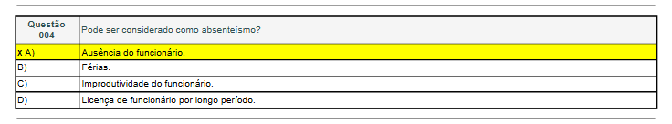Questão Pode ser considerado como absenteismo? 004 Ausência do funcionário. B) C) Improdutividade do funcionário. D) Licença de funcionário por longo